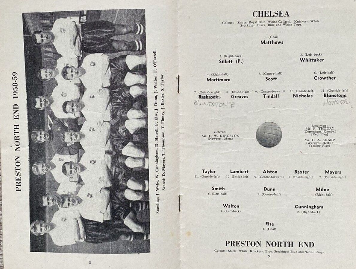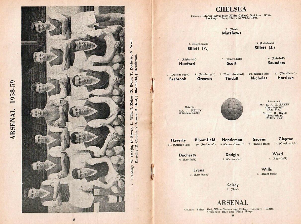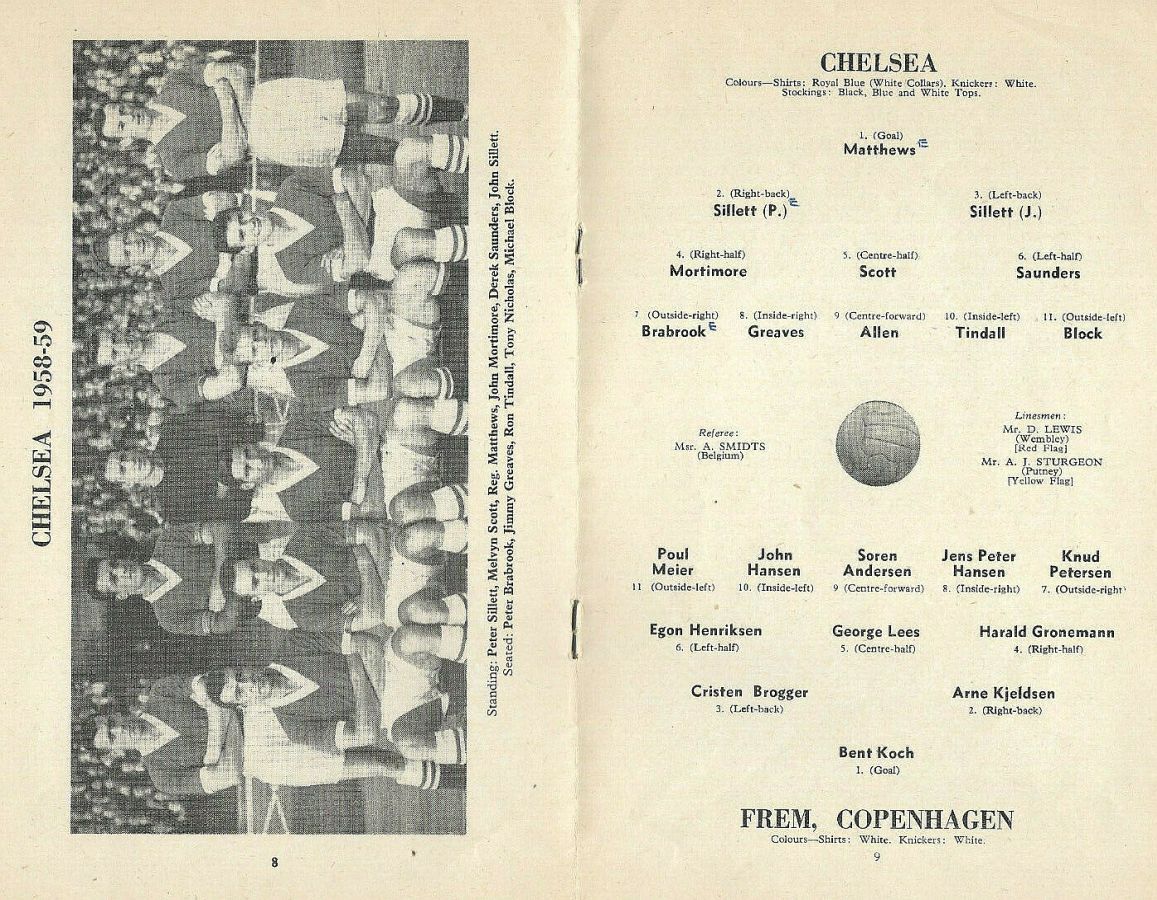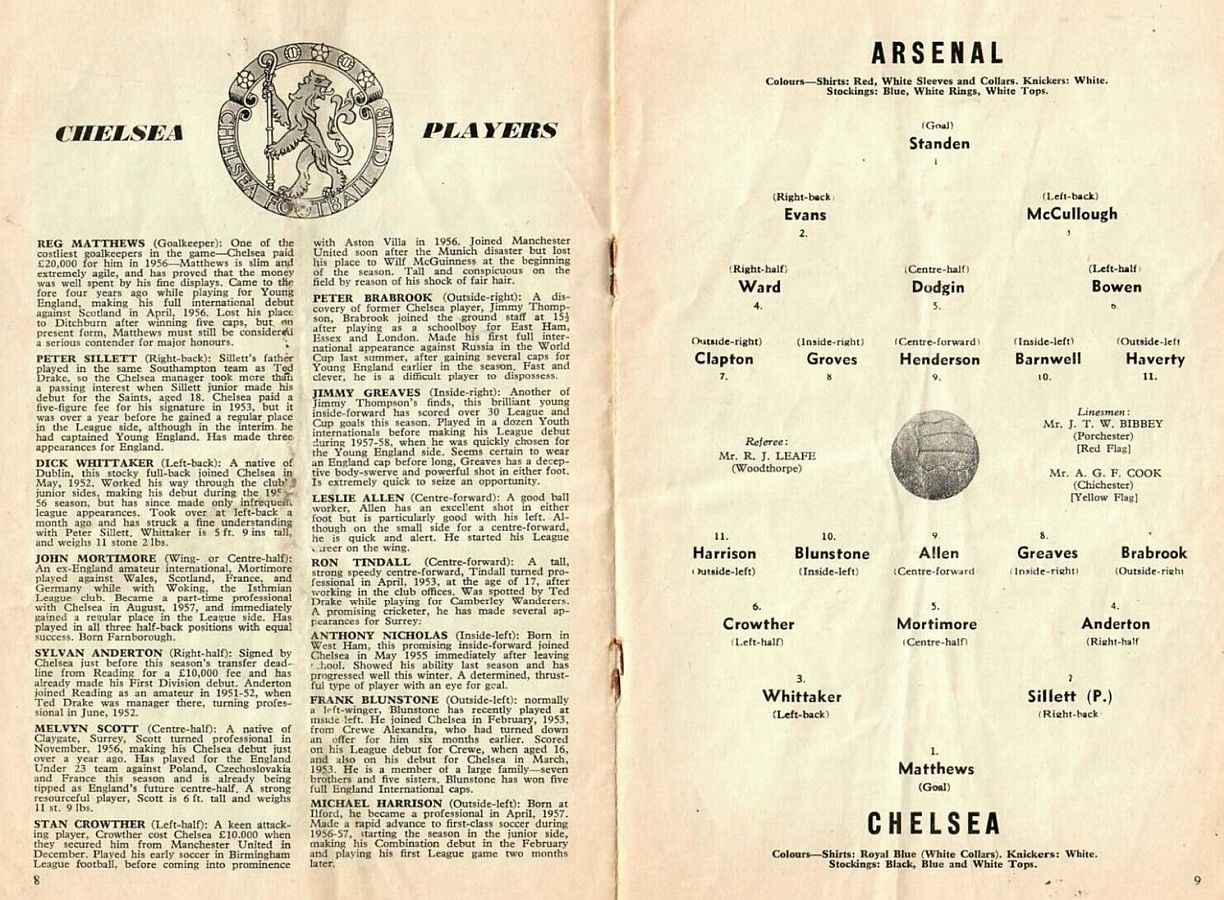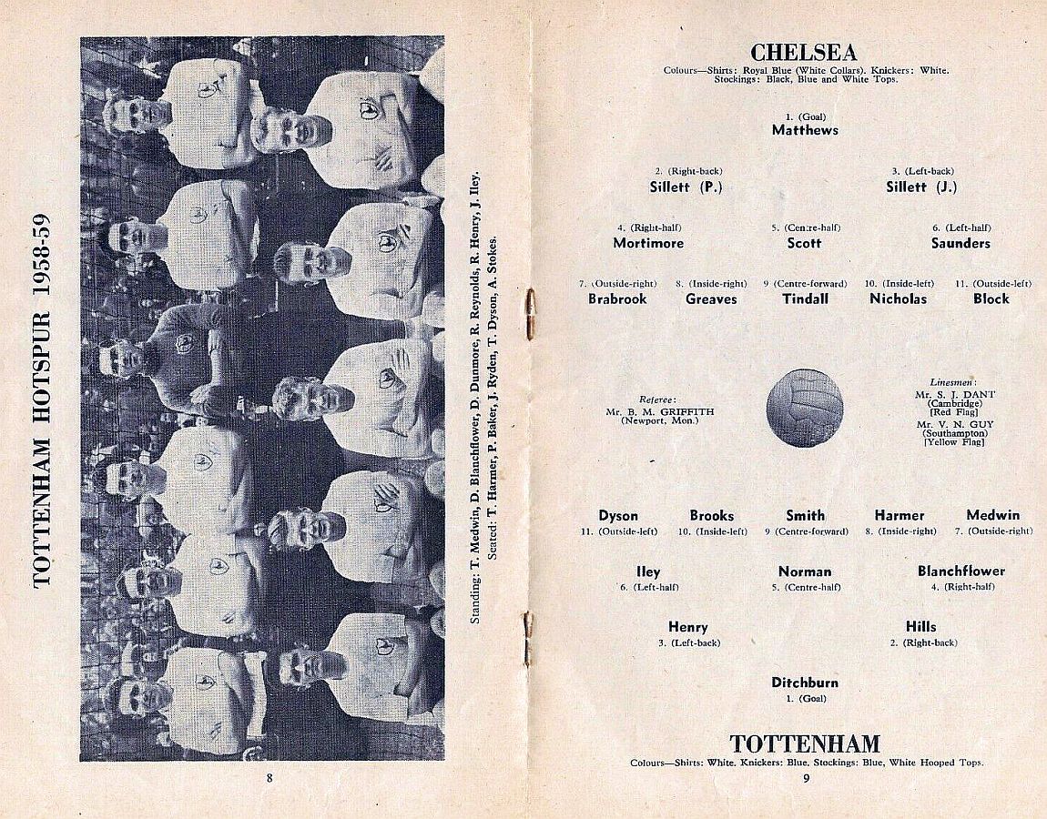 1 Reg Matthews, 2 Peter Sillett, 3 John Sillett, 4 John Mortimore, 5 Mel Scott, 6 Derek Saunders, 7 Peter Brabrook, 8 Jimmy Greaves, 9 Les Allen, 10 Tony Nicholas, 11 Michael Block |