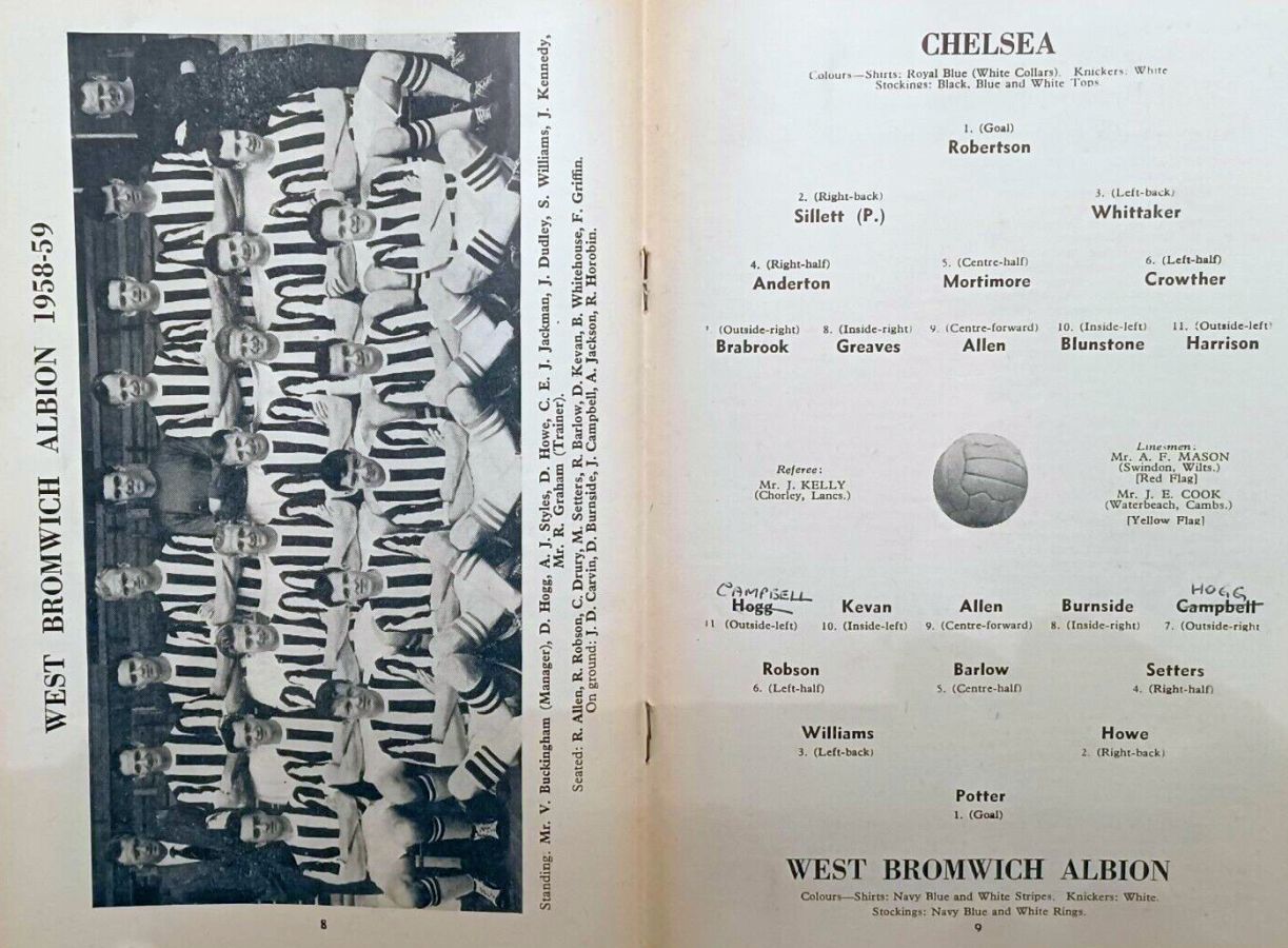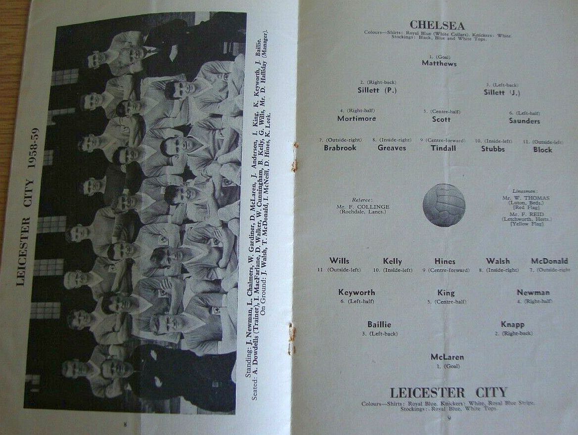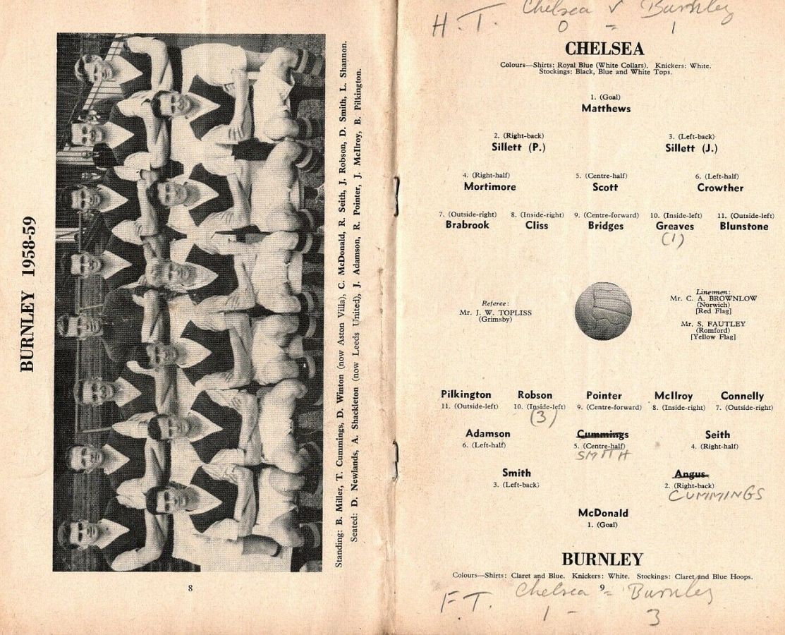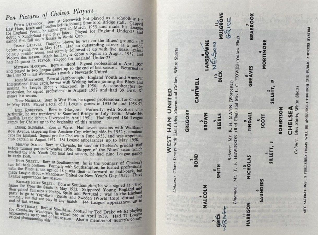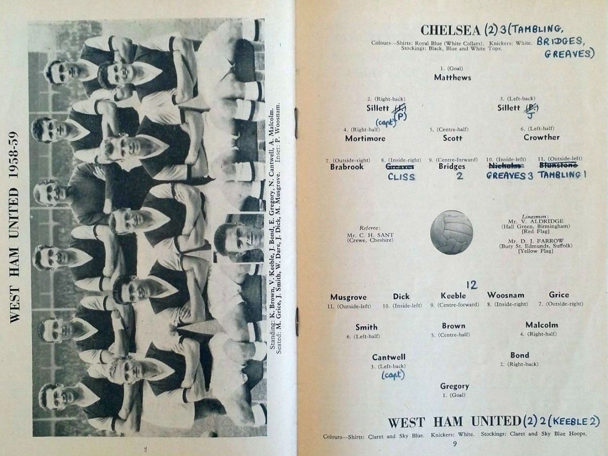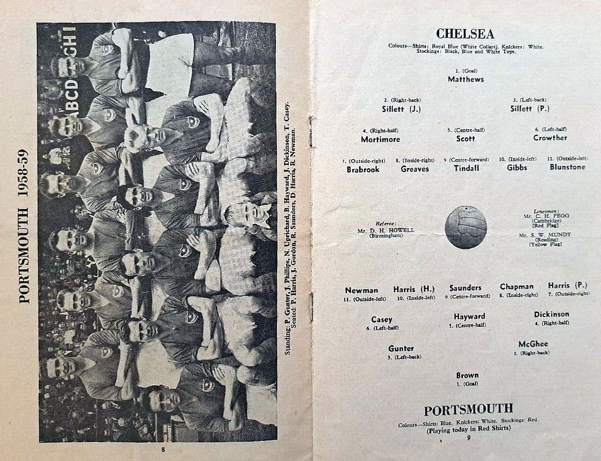 1 Reg Matthews, 2 Peter Sillett, 3 John Sillett, 4 John Mortimore, 5 Mel Scott, 6 Derek Saunders, 7 Peter Brabrook, 8 Jimmy Greaves, 9 Les Allen, 10 Tony Nicholas, 11 Michael Block |