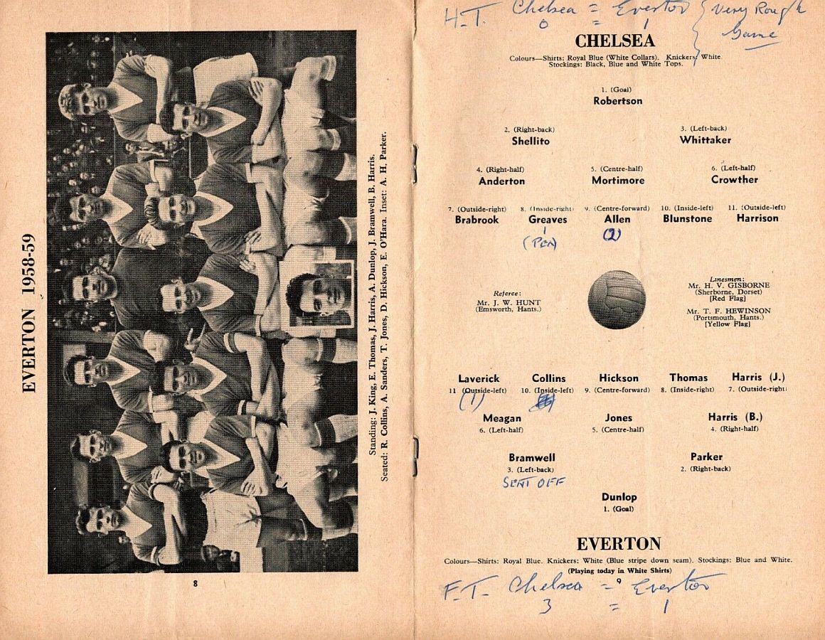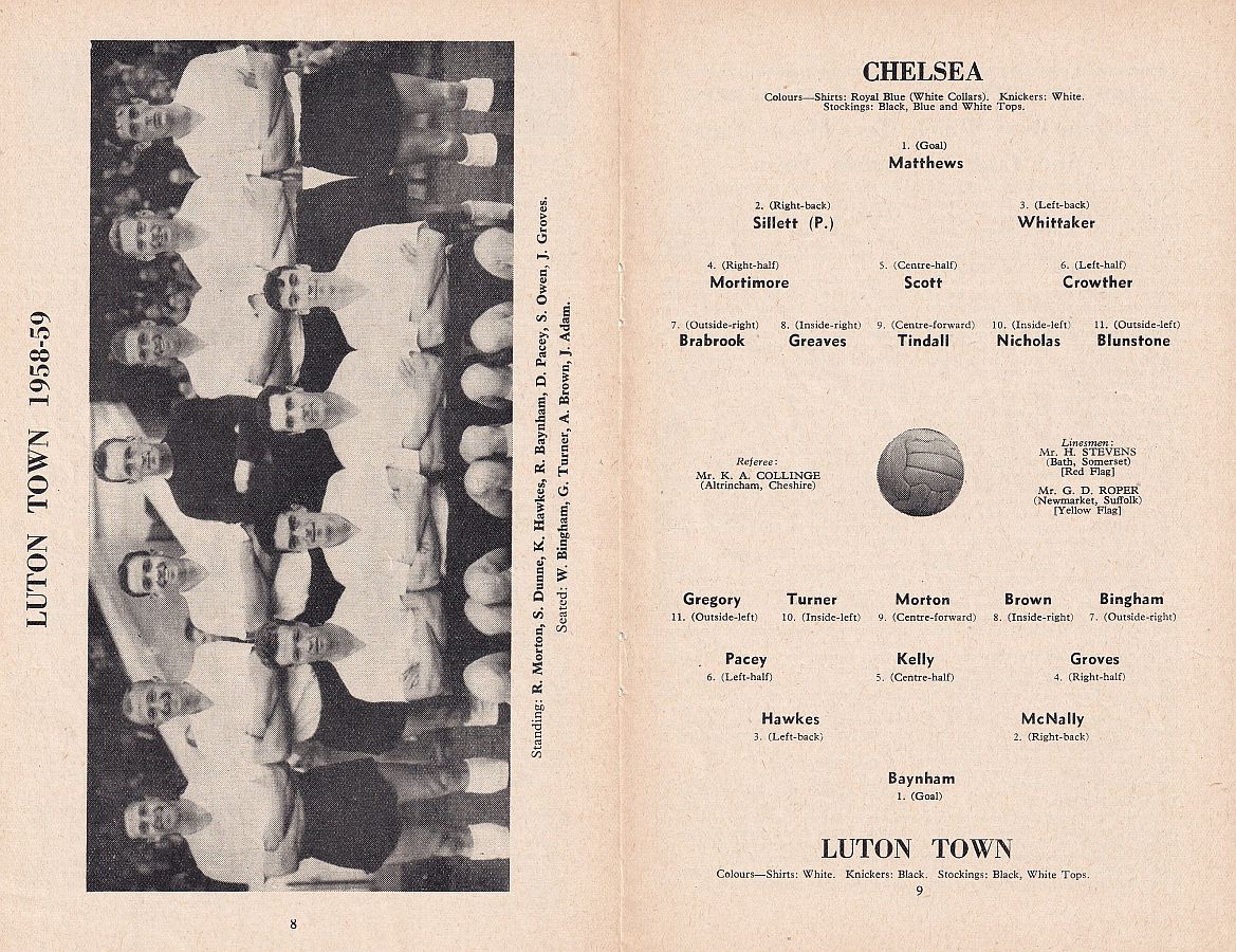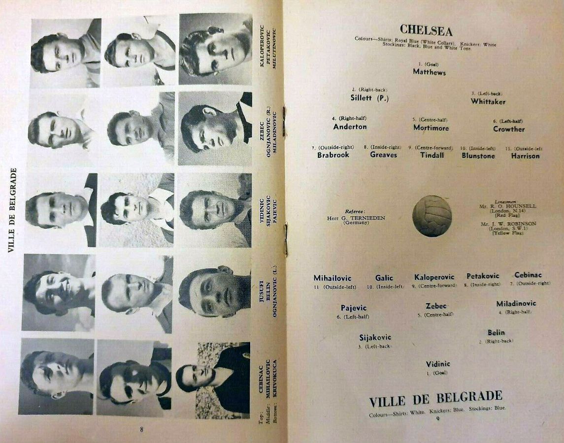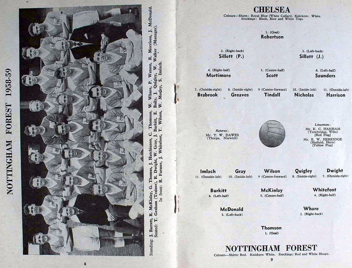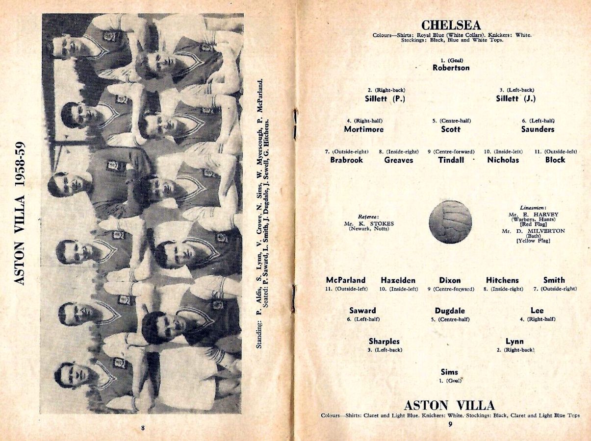 1 Reg Matthews, 2 Peter Sillett, 3 John Sillett, 4 John Mortimore, 5 Mel Scott, 6 Derek Saunders, 7 Peter Brabrook, 8 Jimmy Greaves, 9 Les Allen, 10 Tony Nicholas, 11 Michael Block |