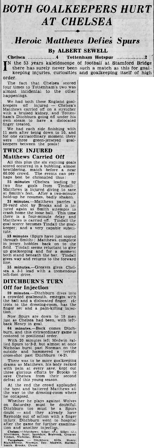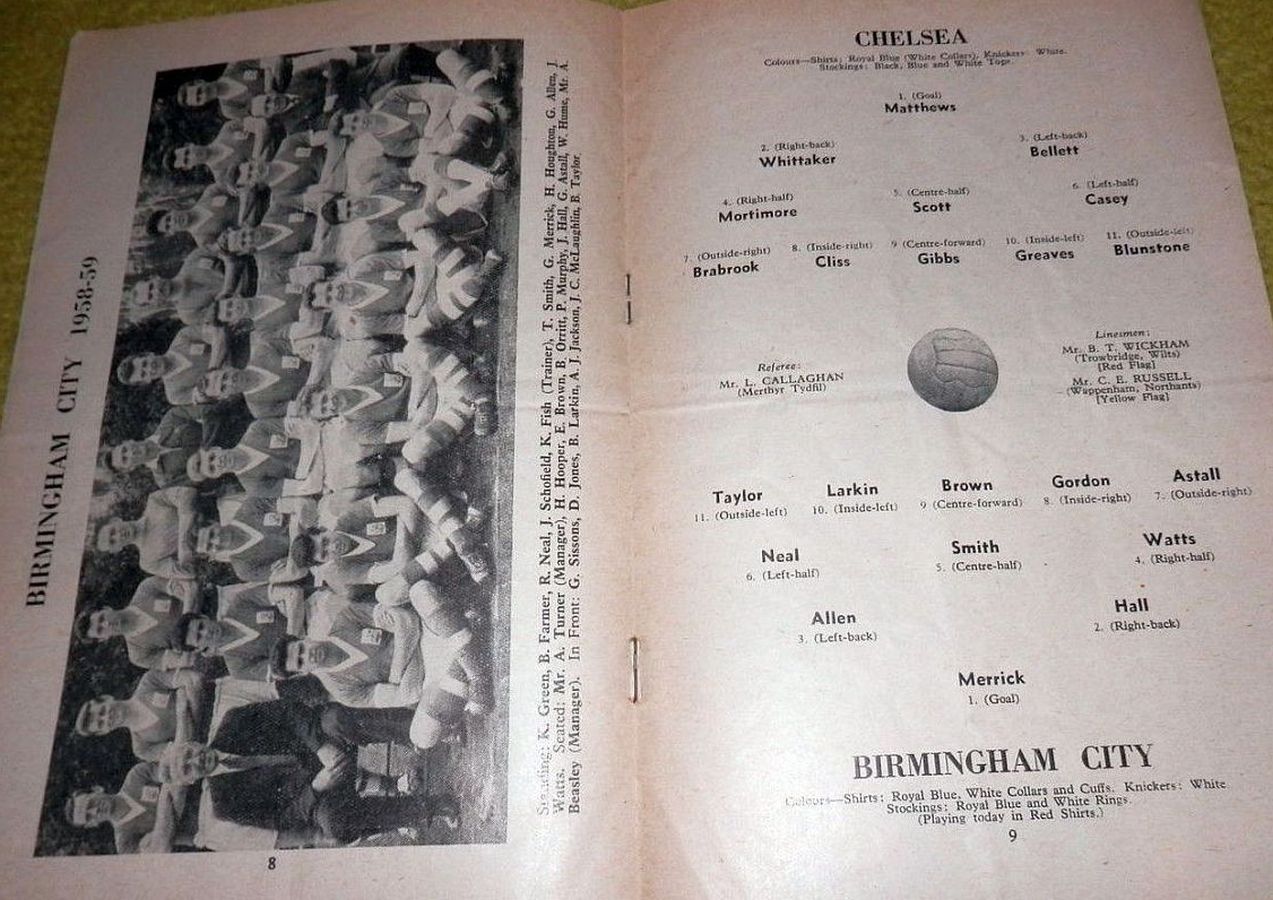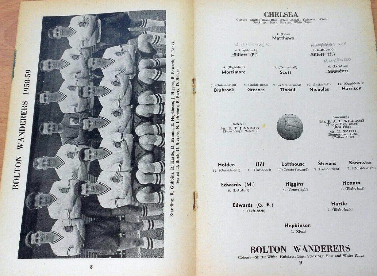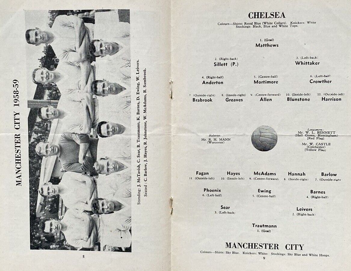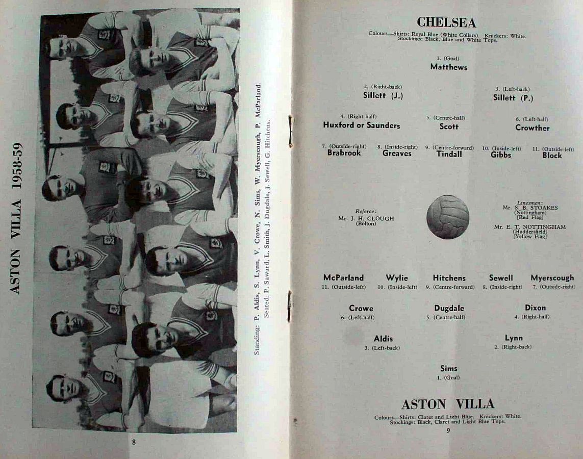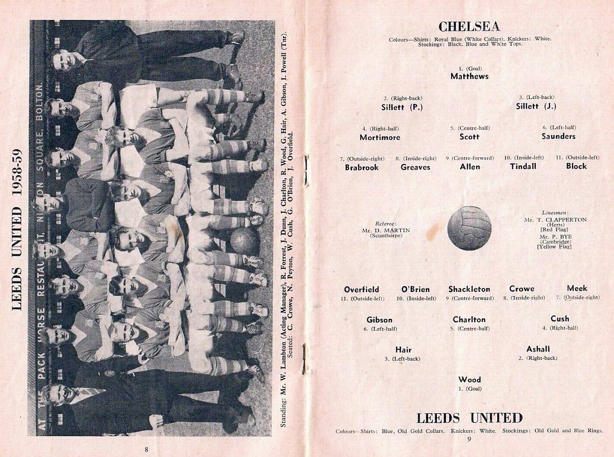 1 Reg Matthews, 2 Peter Sillett, 3 John Sillett, 4 John Mortimore, 5 Mel Scott, 6 Derek Saunders, 7 Peter Brabrook, 8 Jimmy Greaves, 9 Les Allen, 10 Tony Nicholas, 11 Michael Block |