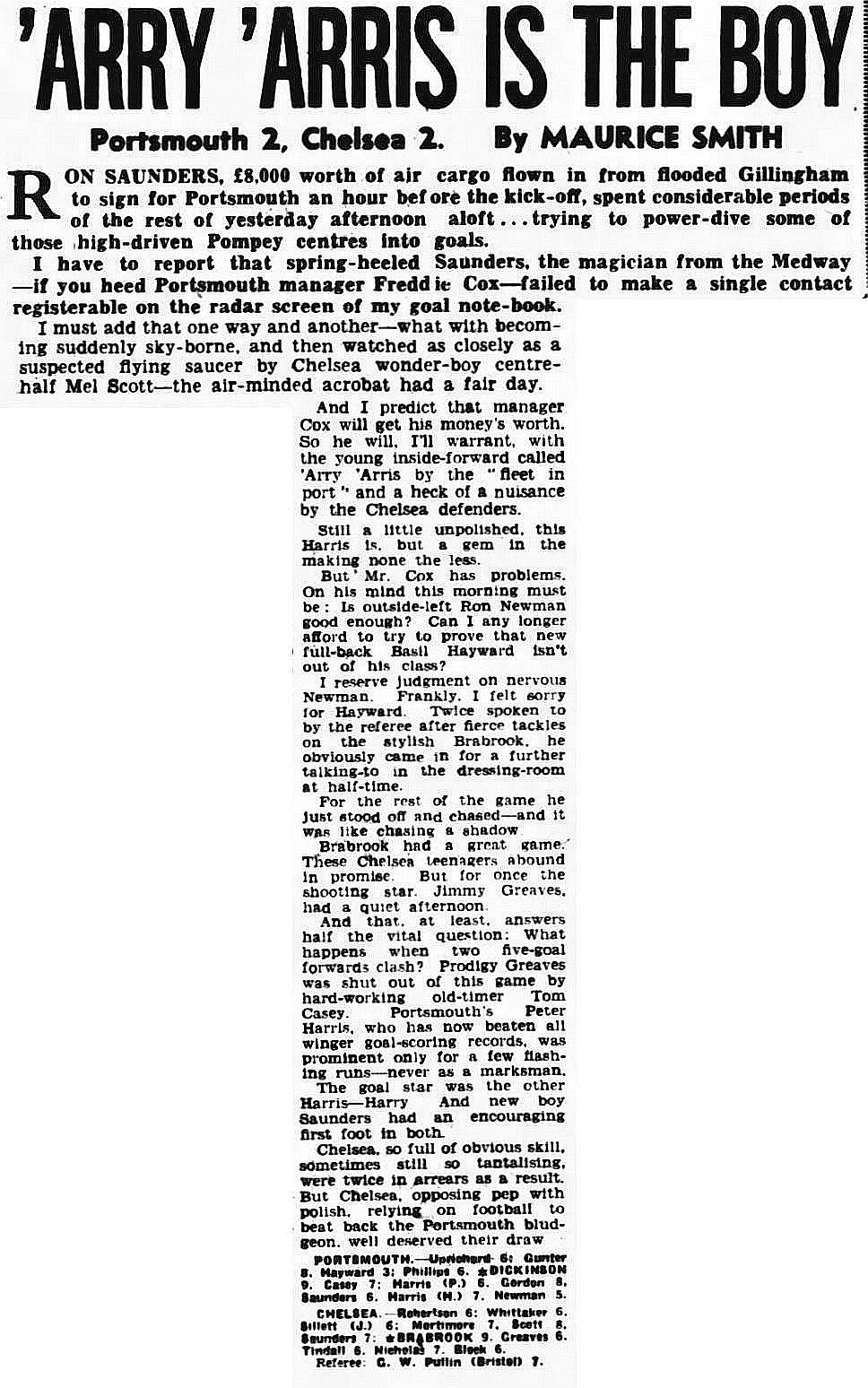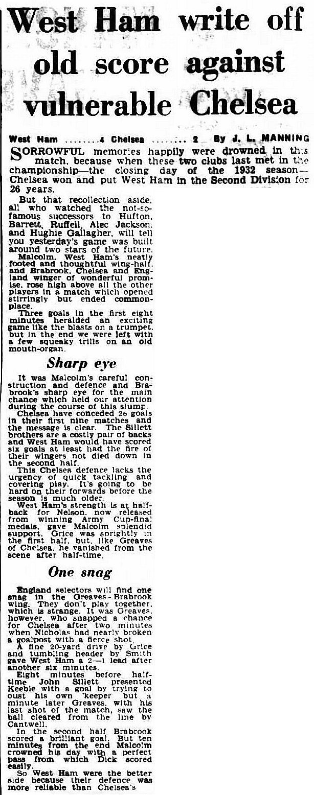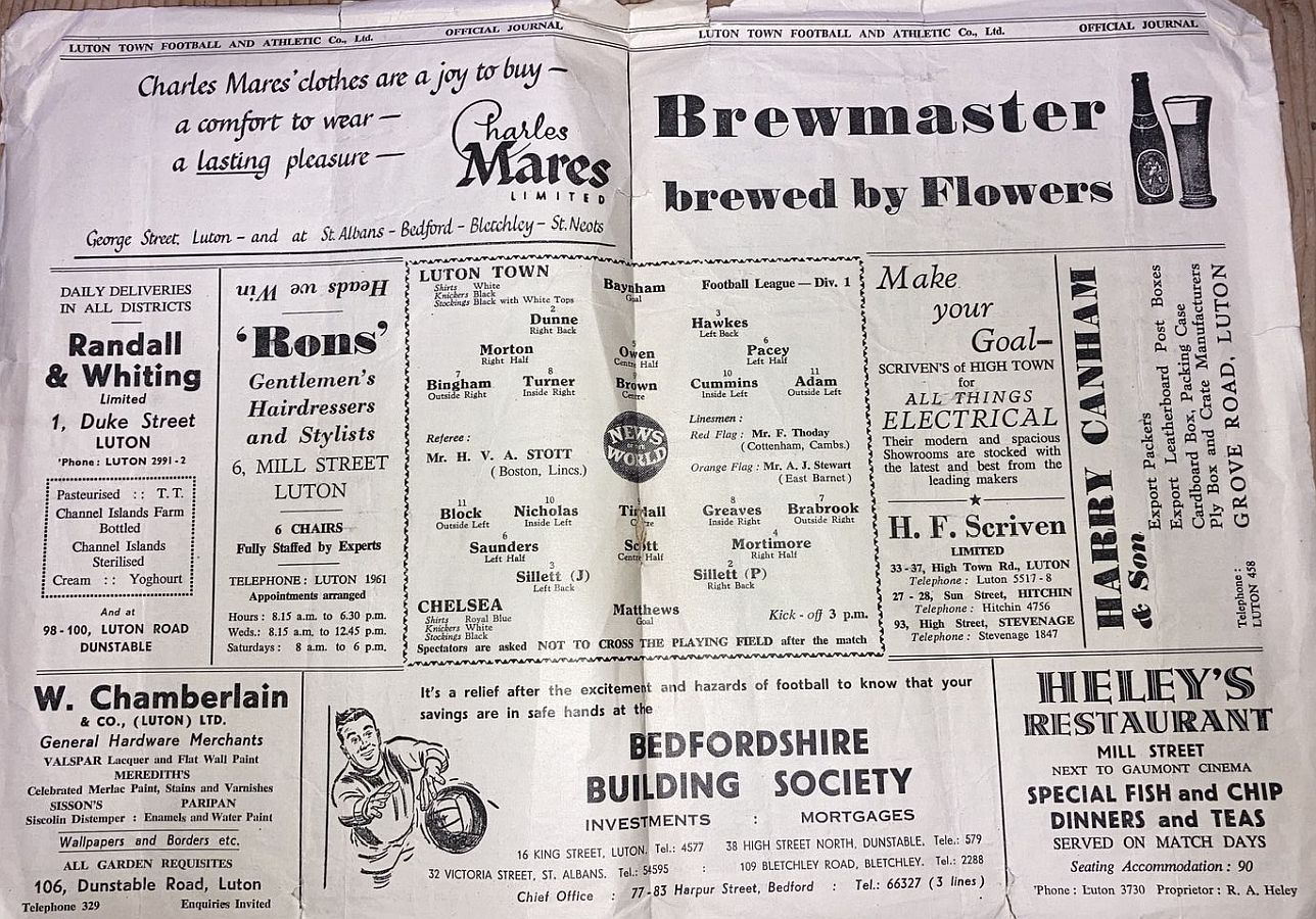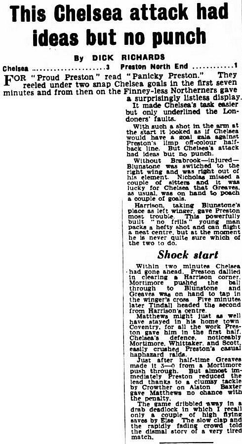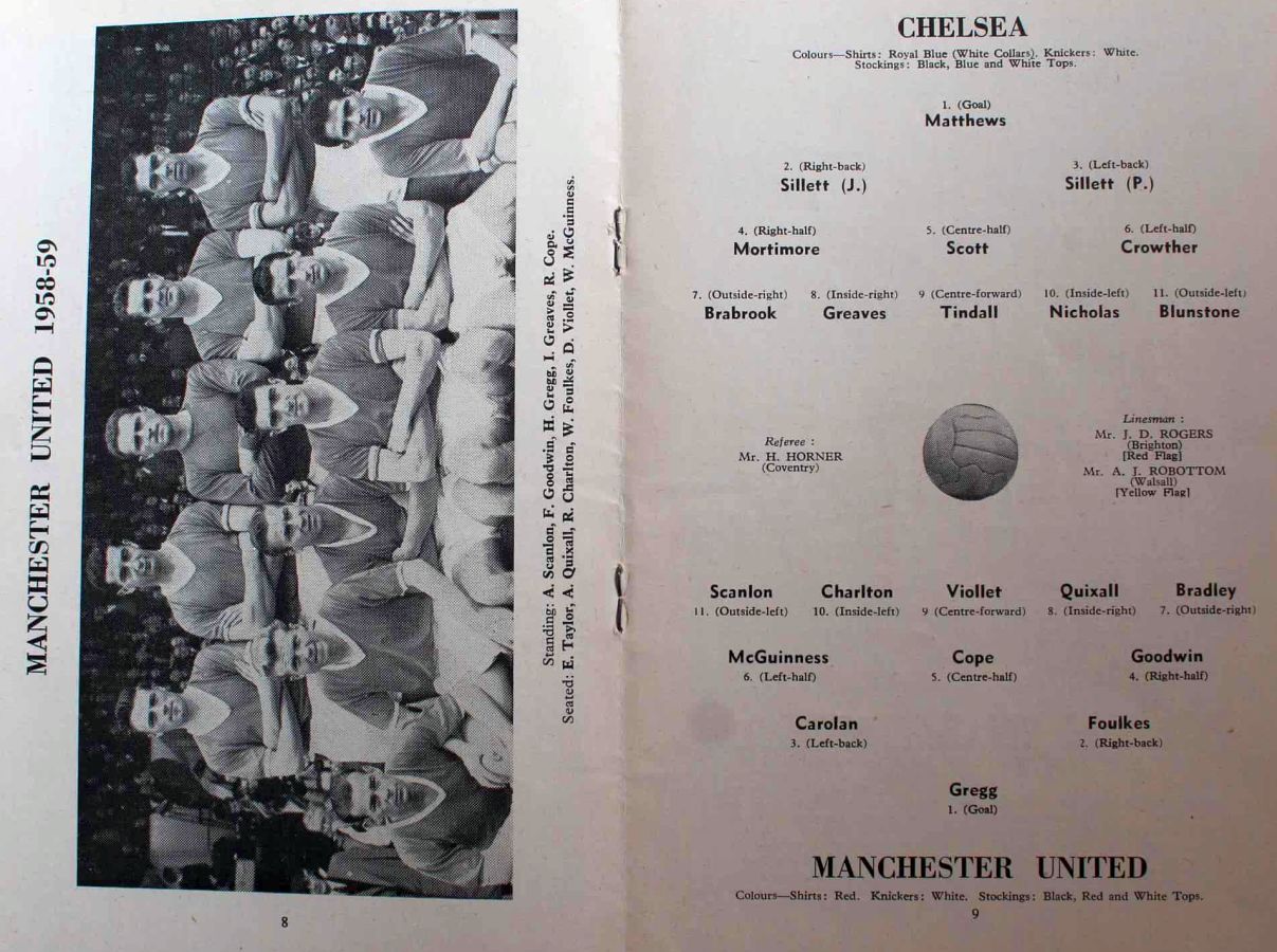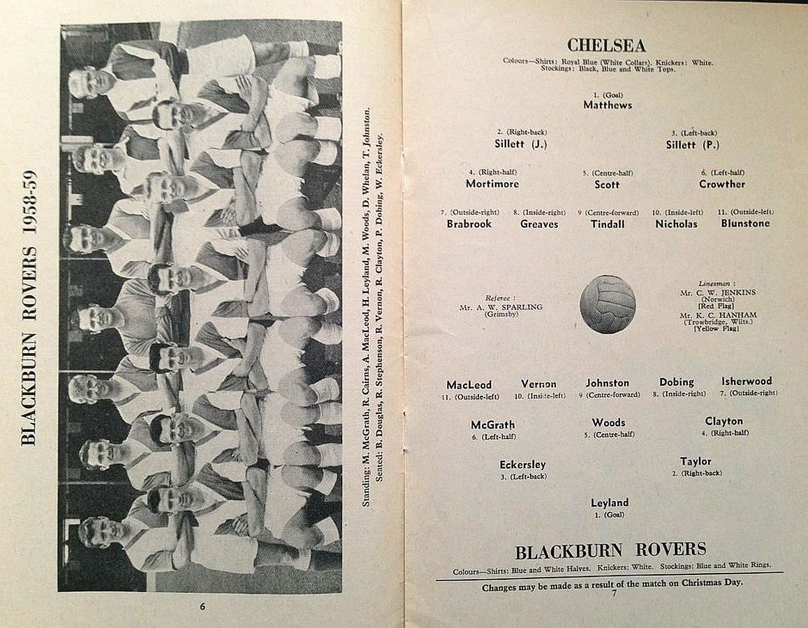 1 Reg Matthews, 2 Peter Sillett, 3 John Sillett, 4 John Mortimore, 5 Mel Scott, 6 Derek Saunders, 7 Peter Brabrook, 8 Jimmy Greaves, 9 Les Allen, 10 Tony Nicholas, 11 Michael Block |