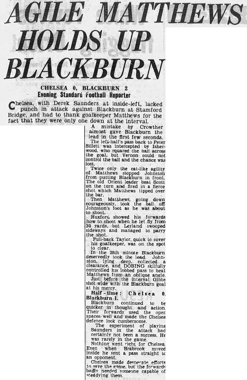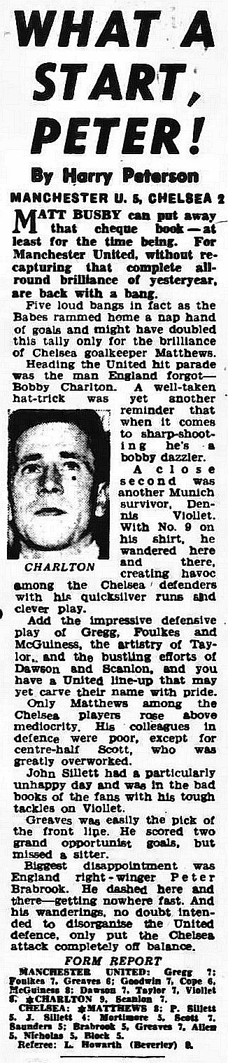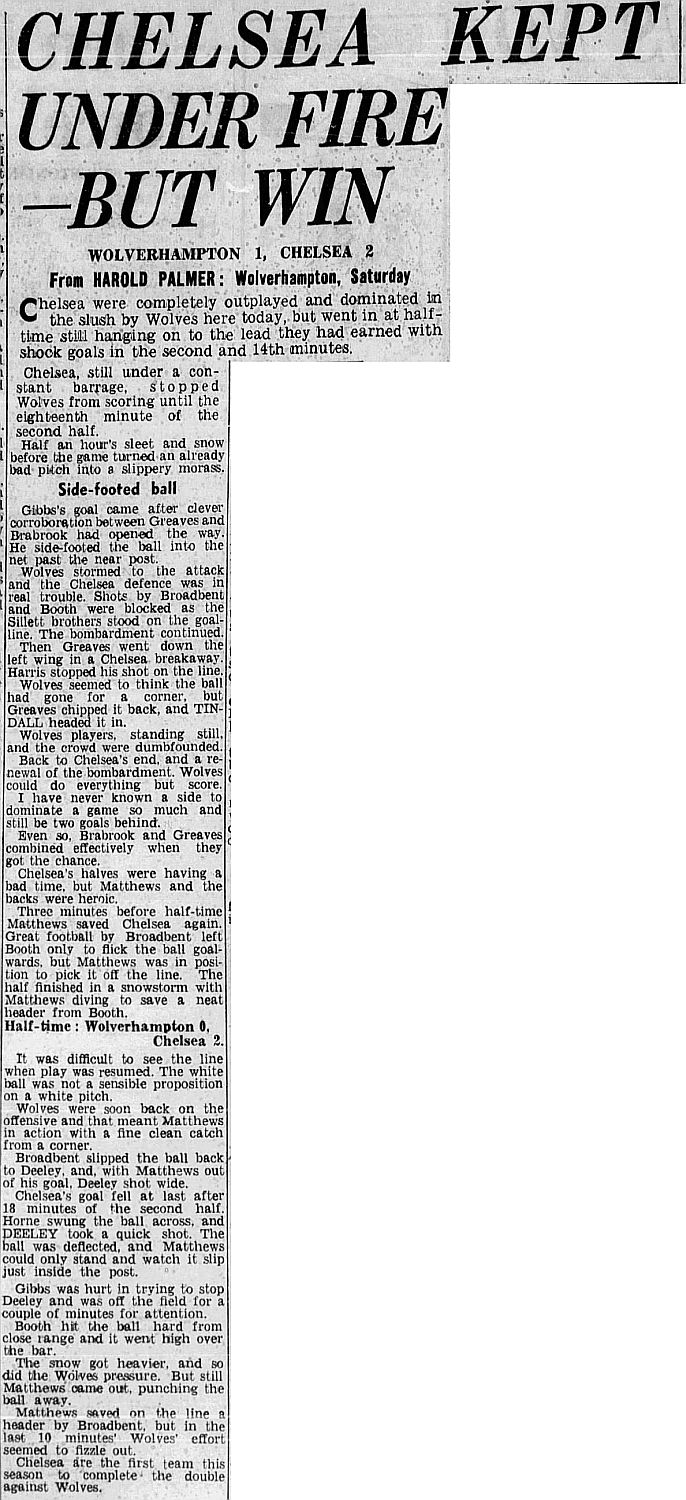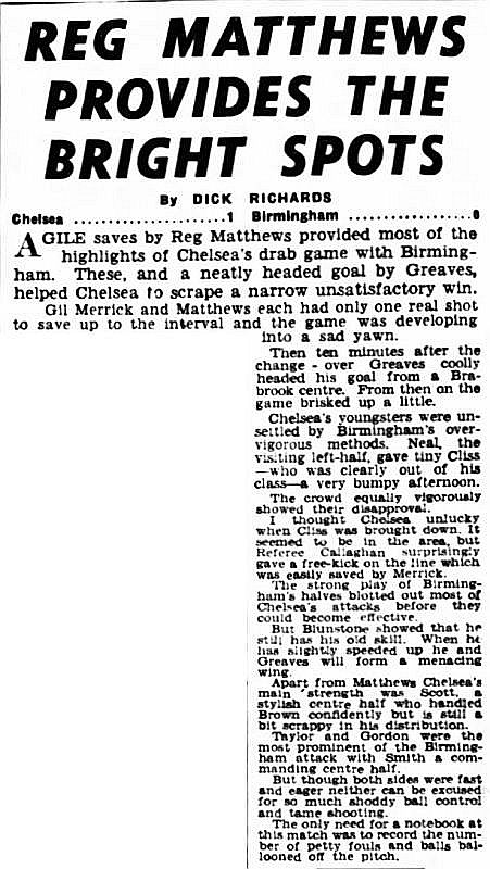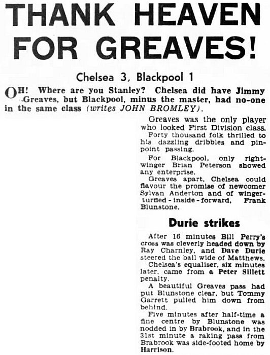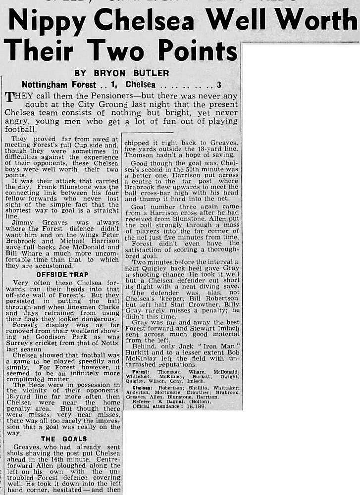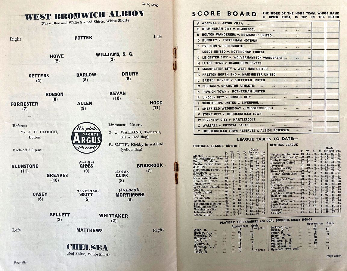 1 Reg Matthews, 2 Peter Sillett, 3 John Sillett, 4 John Mortimore, 5 Mel Scott, 6 Derek Saunders, 7 Peter Brabrook, 8 Jimmy Greaves, 9 Les Allen, 10 Tony Nicholas, 11 Michael Block |