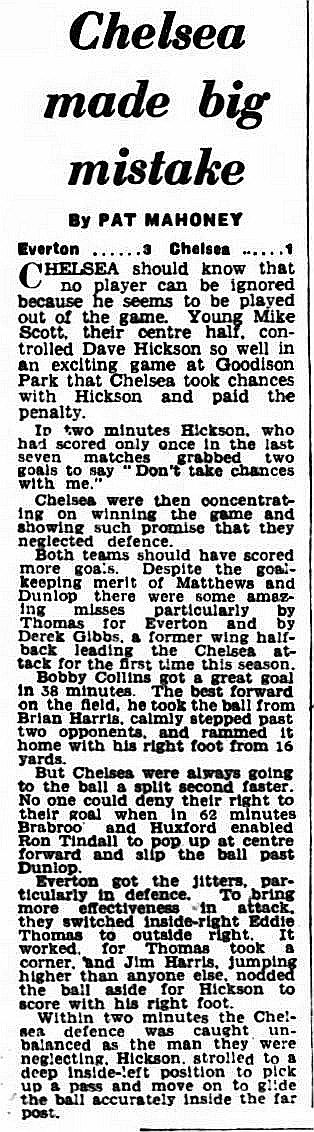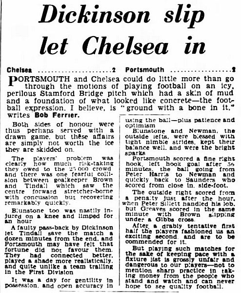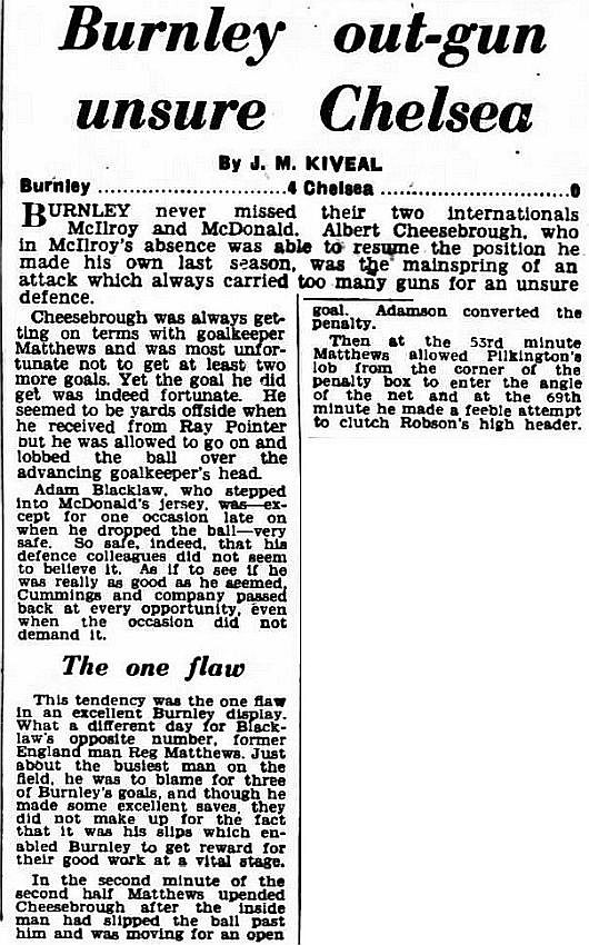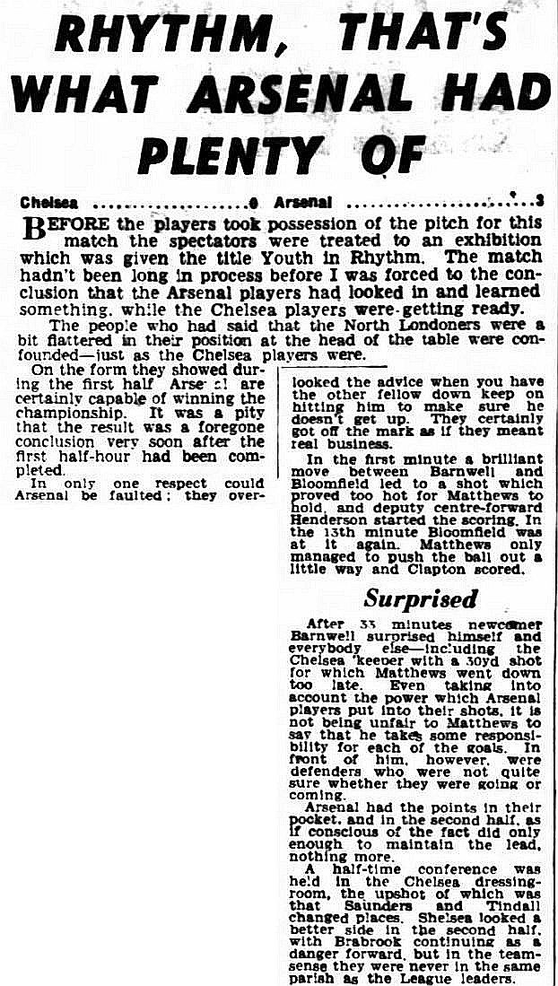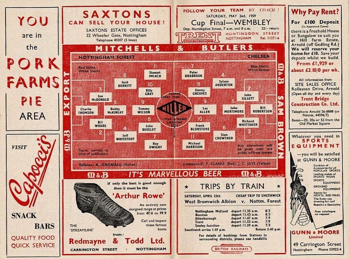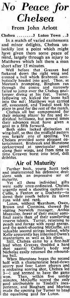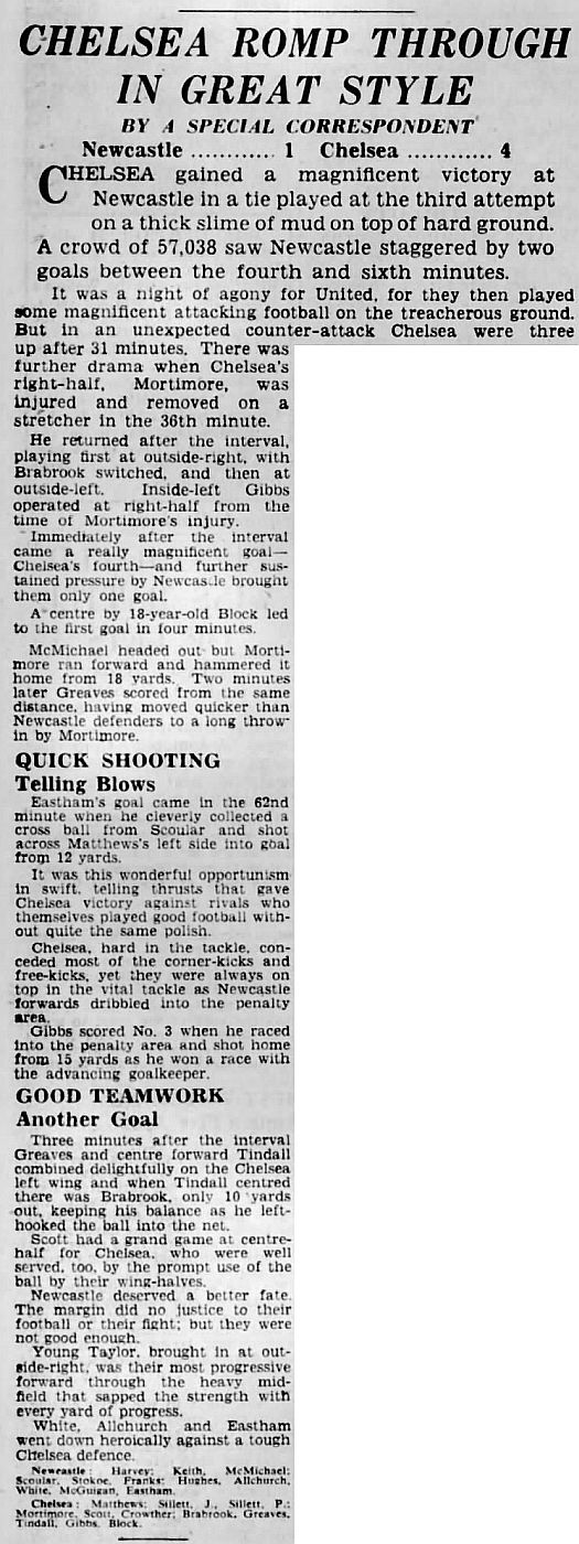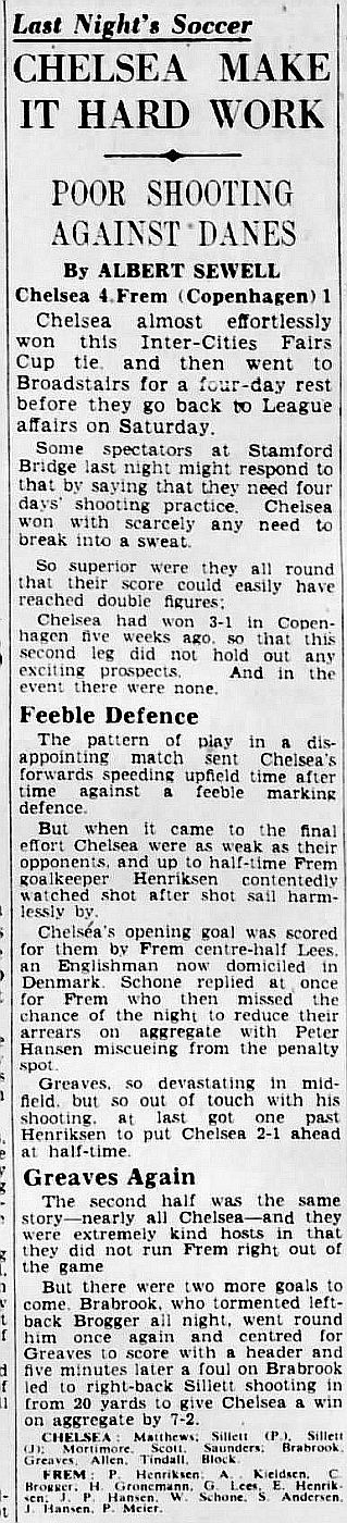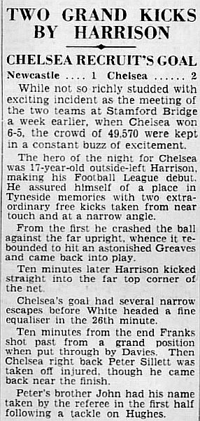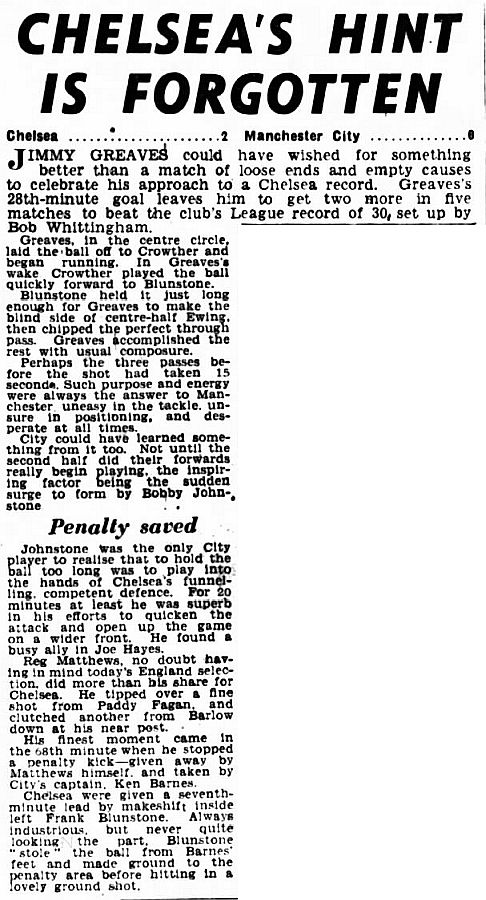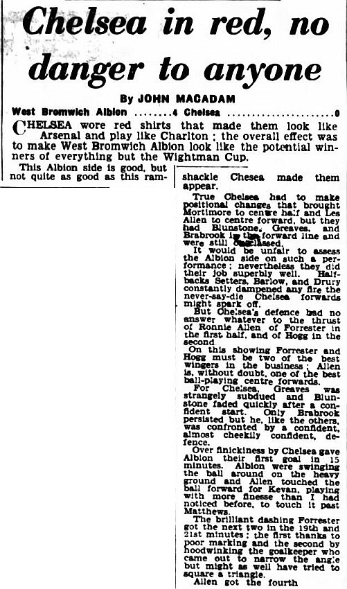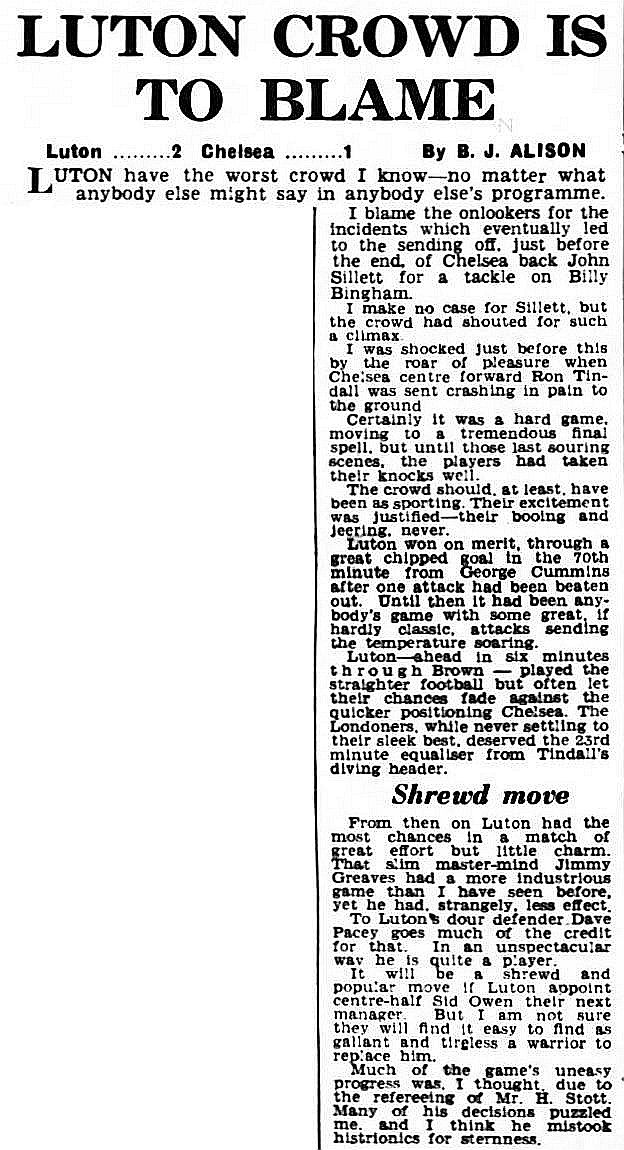 1 Reg Matthews, 2 Peter Sillett, 3 John Sillett, 4 John Mortimore, 5 Mel Scott, 6 Derek Saunders, 7 Peter Brabrook, 8 Jimmy Greaves, 9 Les Allen, 10 Tony Nicholas, 11 Michael Block |