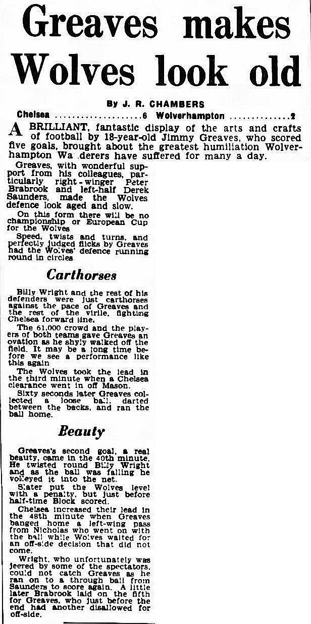 Billy Wright 30, Len White 37, Billy Wright 49, Albert Franks 53, Reg Davies 68 |
