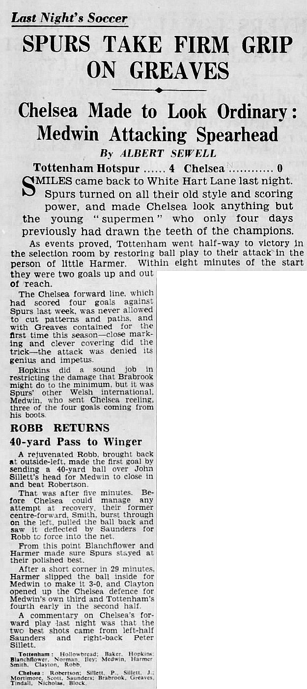 John Hollowbread, Peter Baker, Mel Hopkins, Danny Blanchflower, Maurice Norman, Jim Iley, Terry Medwin, Tommy Harmer, Bobby Smith, Eddie Clayton, George Robb |