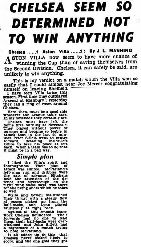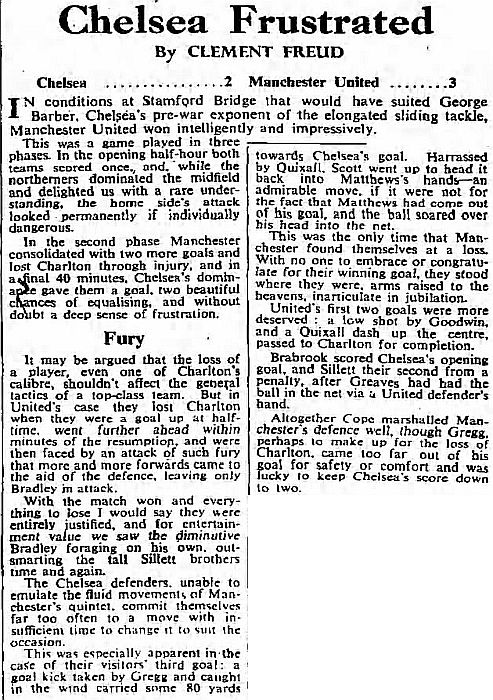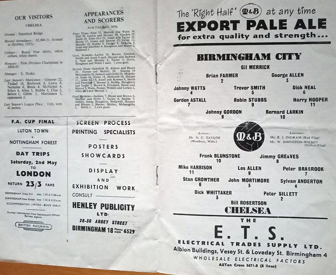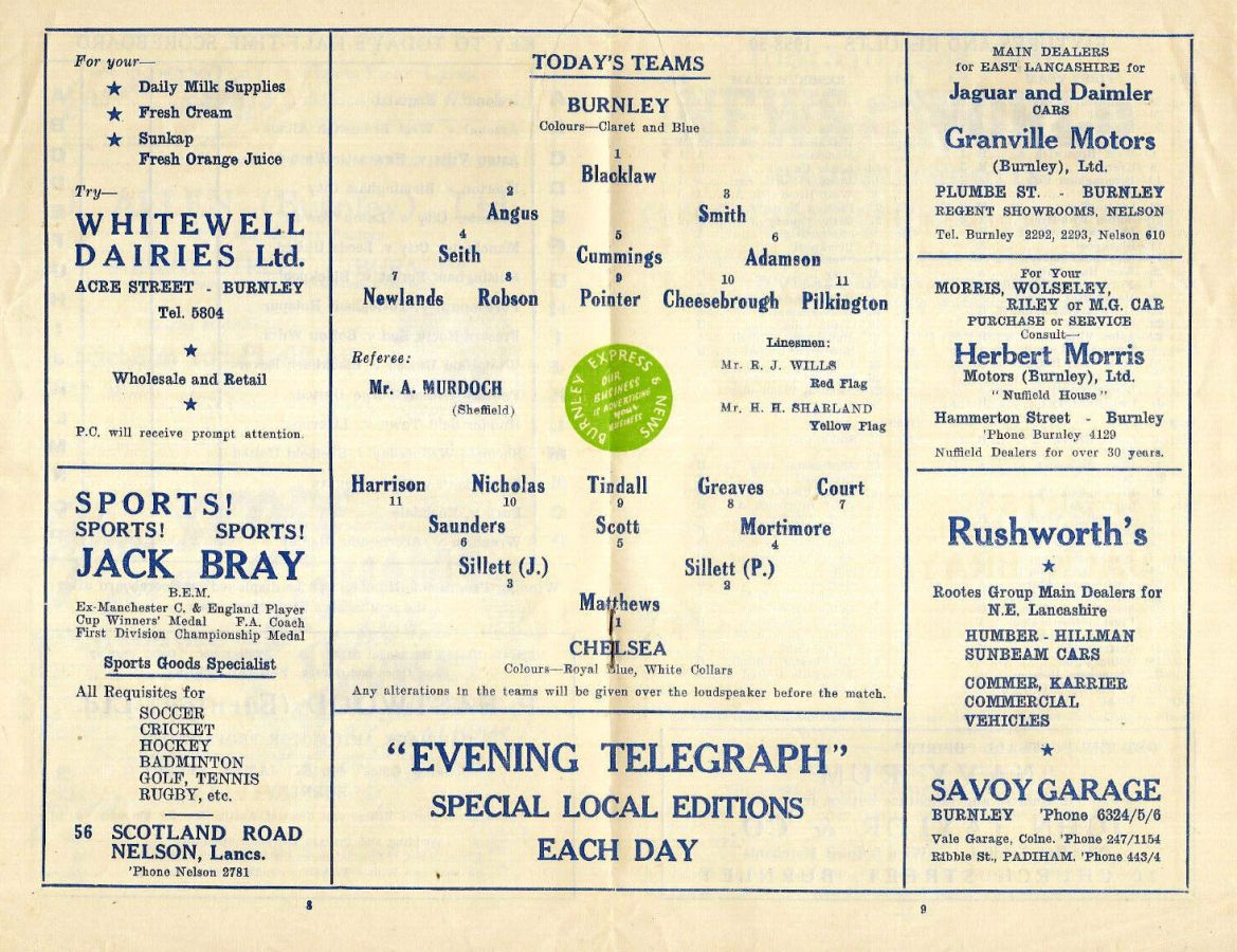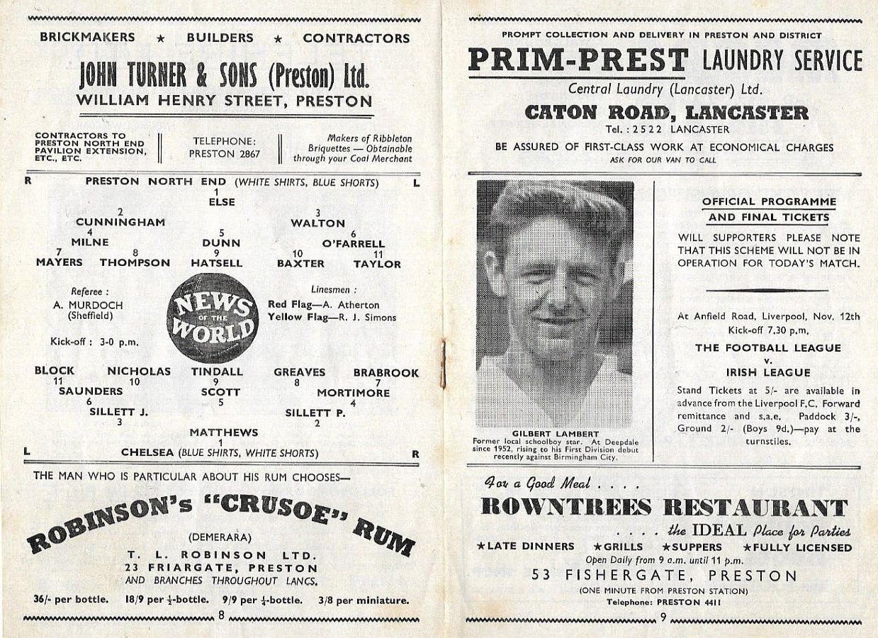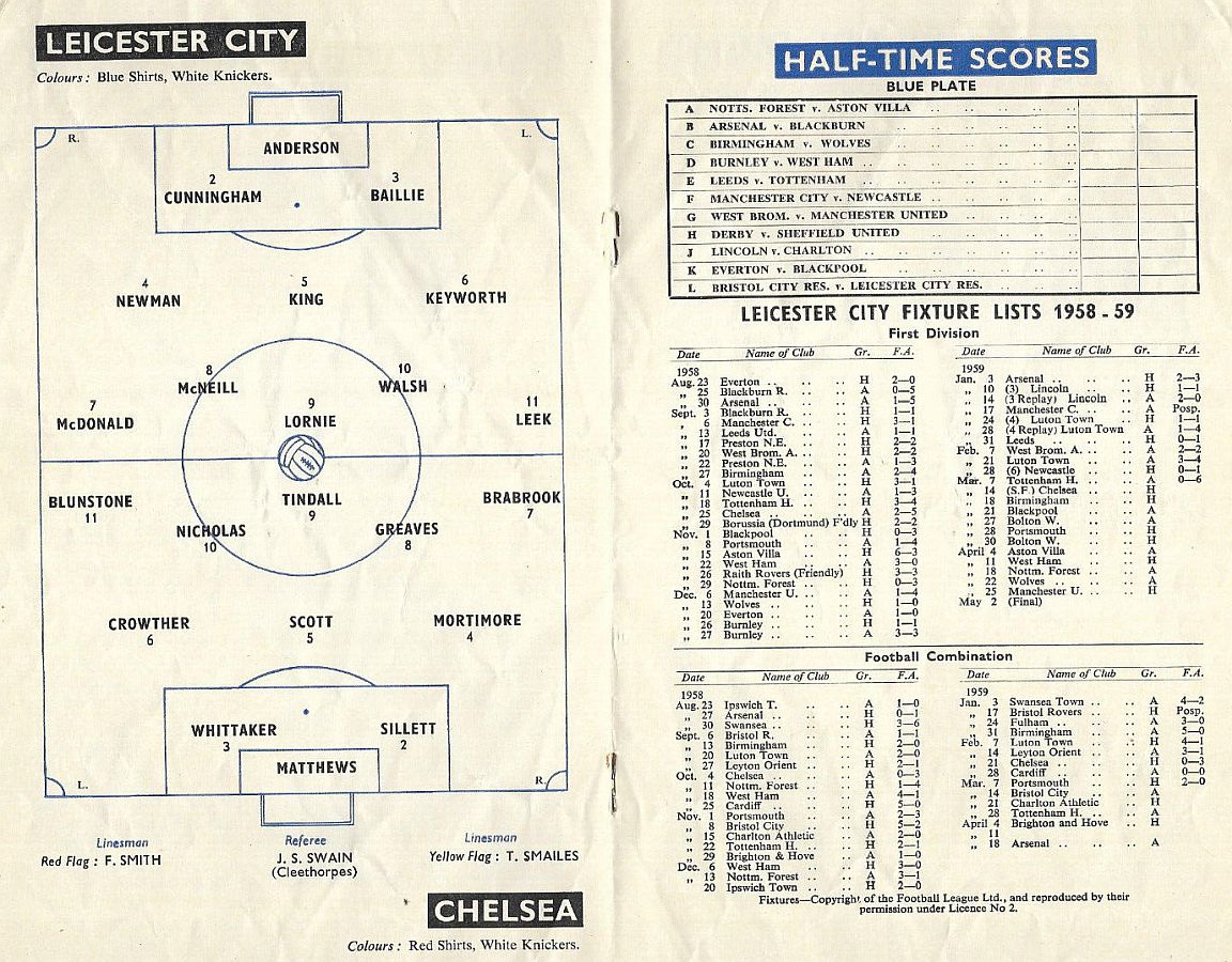1 Reg Matthews, 2 Peter Sillett, 3 Richard Whittaker, 4 Sylvan Anderton, 5 John Mortimore, 6 Stan Crowther, 7 Peter Brabrook, 8 Jimmy Greaves, 9 Les Allen, 10 Frank Blunstone, 11 Mike Harrison |