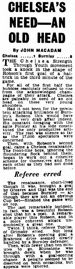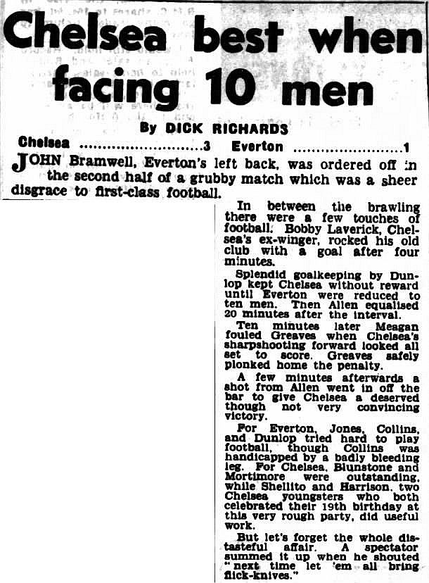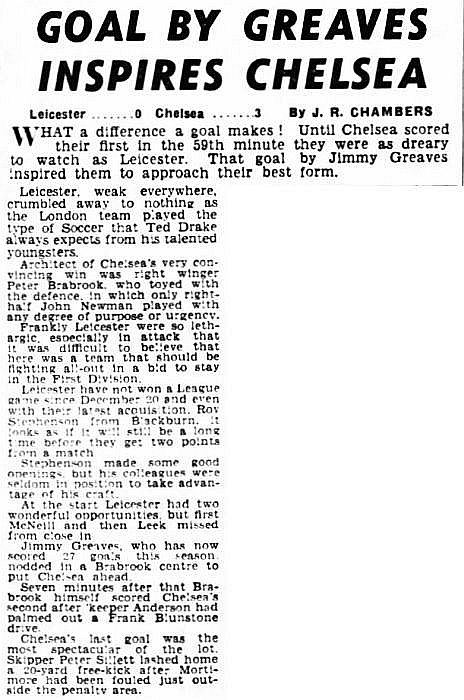 1 Bill Robertson, 2 Ken Shellito, 3 Richard Whittaker, 4 Sylvan Anderton, 5 John Mortimore, 6 Stan Crowther, 7 Peter Brabrook, 8 Jimmy Greaves, 9 Les Allen, 10 Frank Blunstone, 11 Mike Harrison |