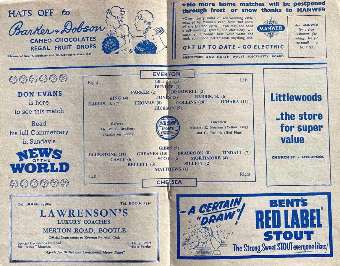 Albert Dunlop, Alex Parker, John Bramwell, Brian Harris, Tommy Jones, Mick Meagan, Jimmy Harris, Eddie Thomas, Dave Hickson, Bobby Collins, Bobby Laverick |