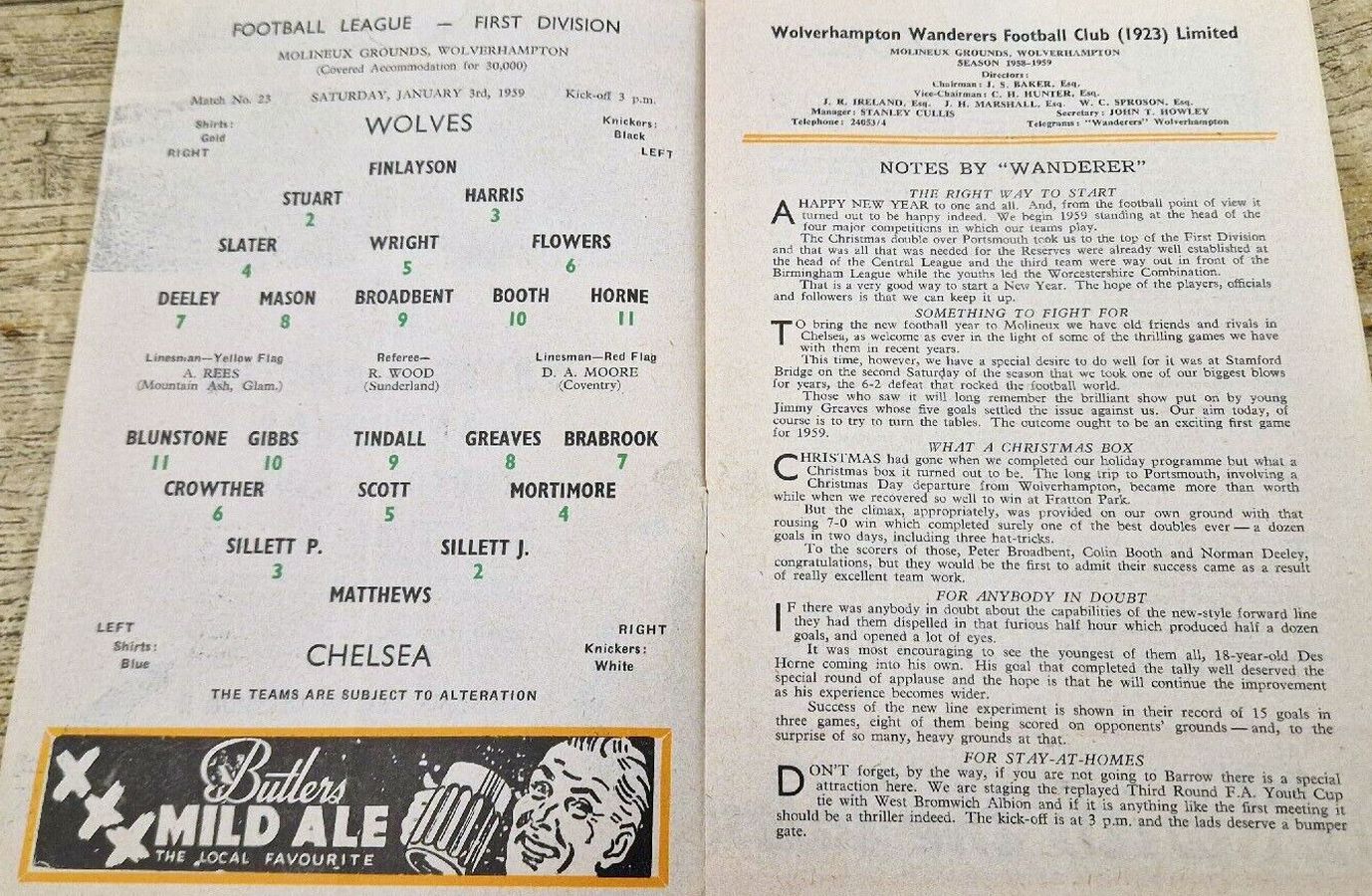 1 Reg Matthews, 2 Peter Sillett, 3 Richard Whittaker, 4 John Mortimore, 5 Mel Scott, 6 Stan Crowther, 7 Frank Blunstone, 8 Jimmy Greaves, 9 Ron Tindall, 10 Tony Nicholas, 11 Mike Harrison |