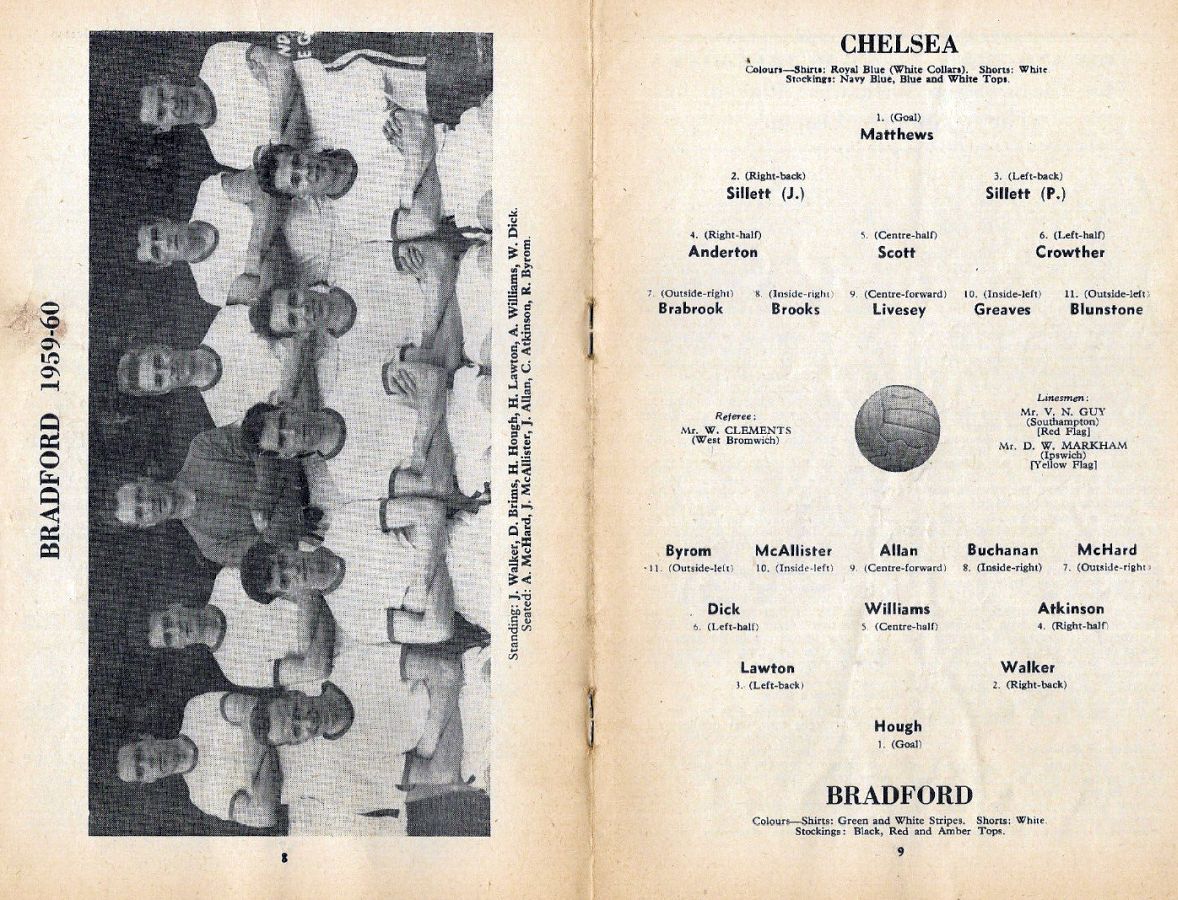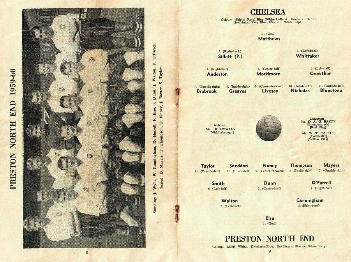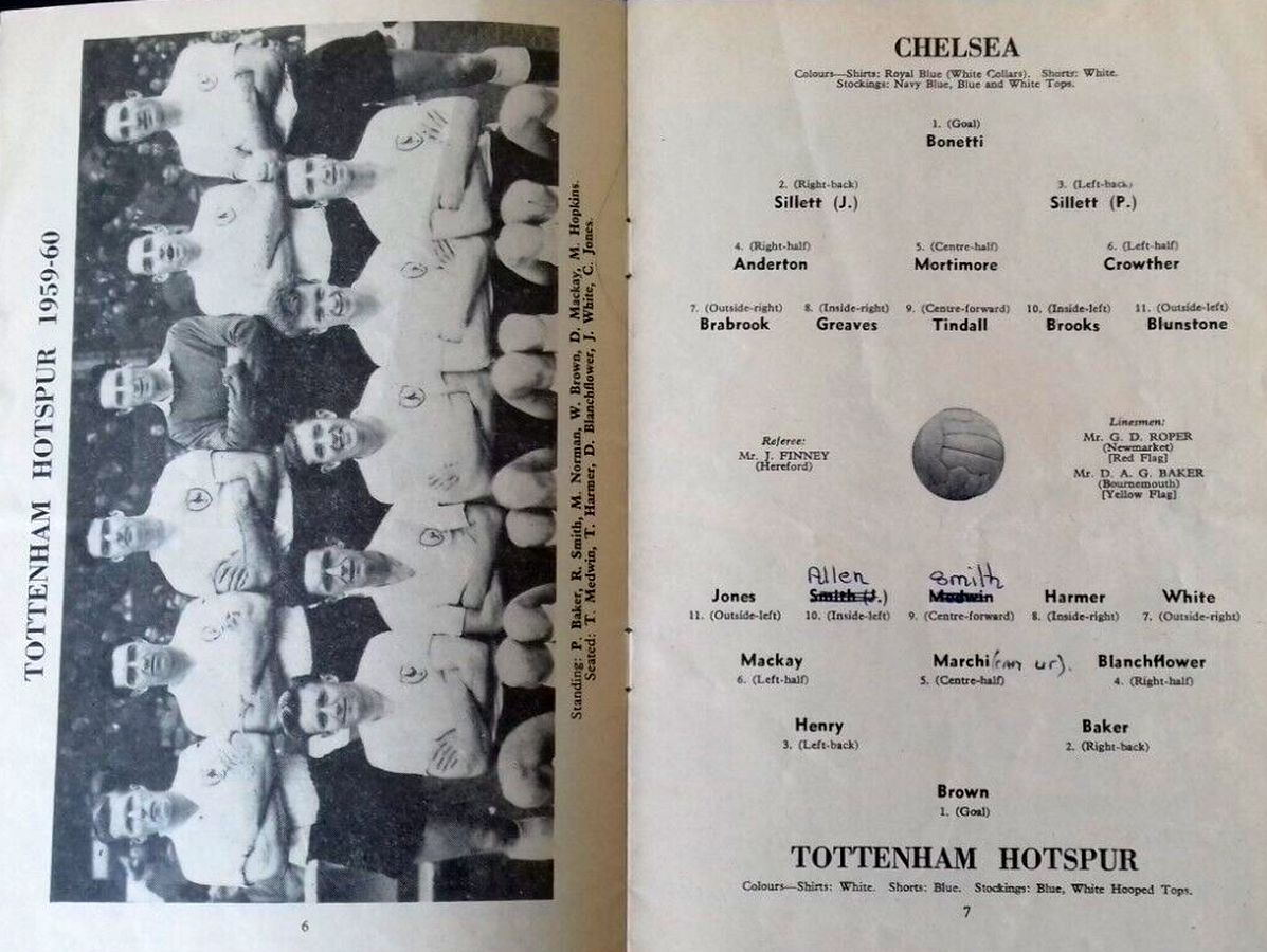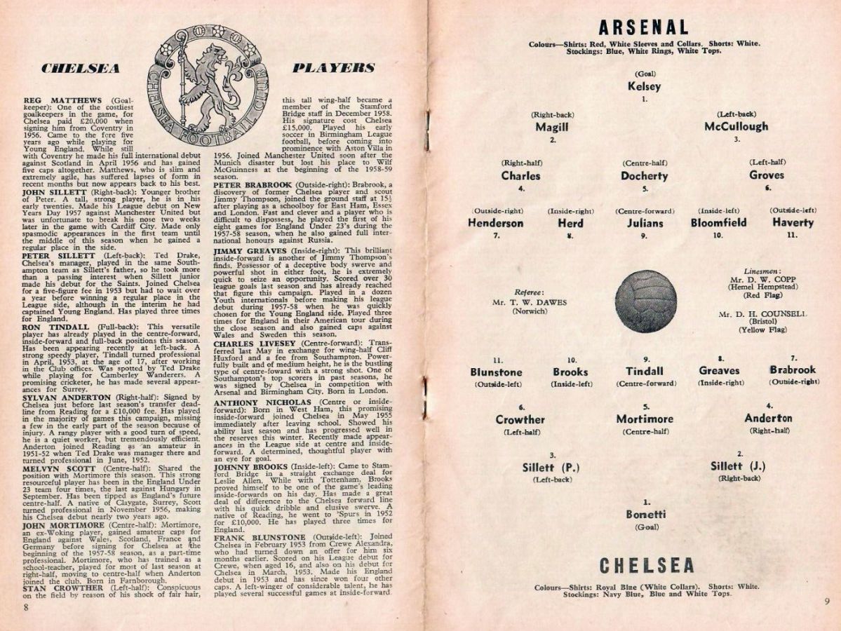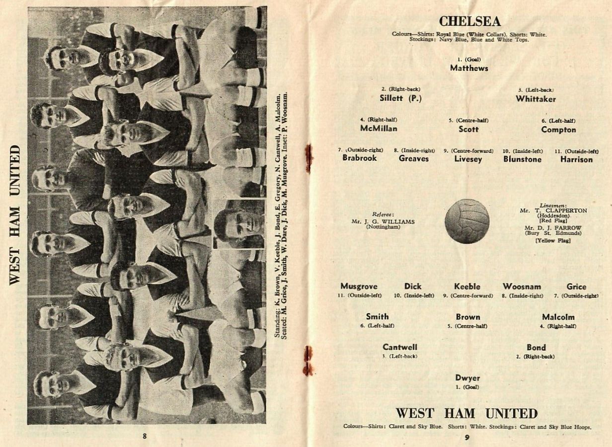 1 Reg Matthews, 2 Peter Sillett, 3 Richard Whittaker, 4 Eric McMillan, 5 Mel Scott, 6 John Compton, 7 Peter Brabrook, 8 Jimmy Greaves, 9 Charlie Livesey, 10 Frank Blunstone, 11 Mike Harrison |
