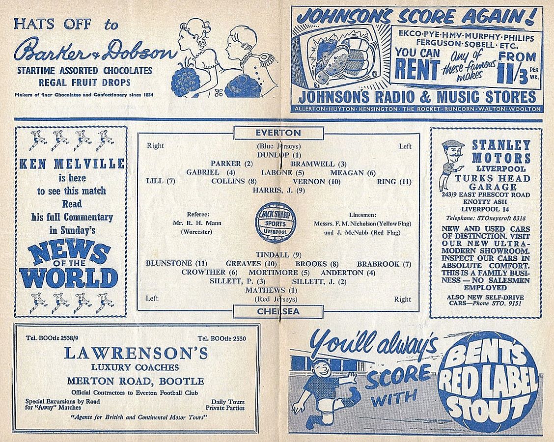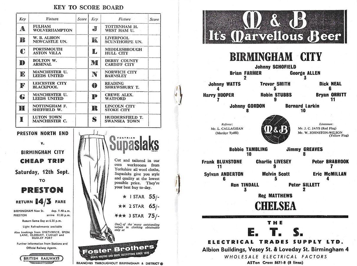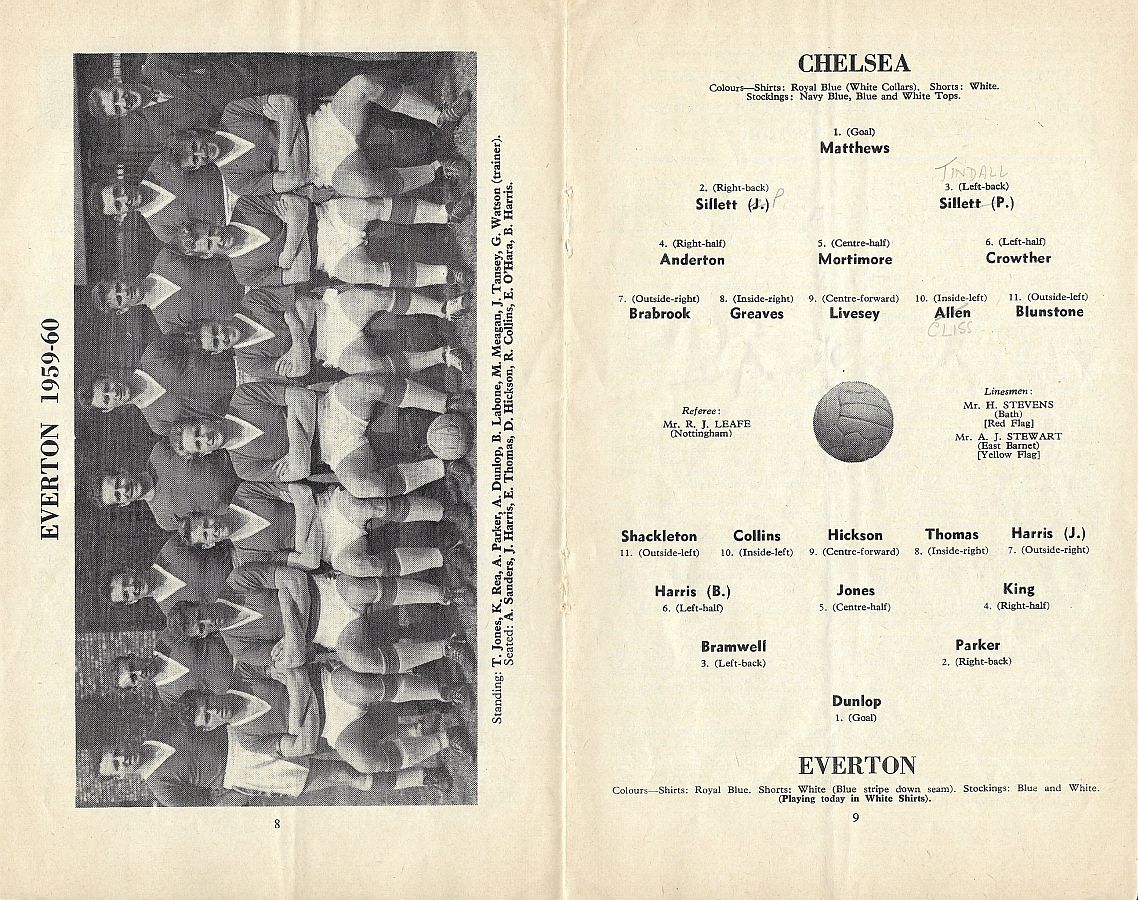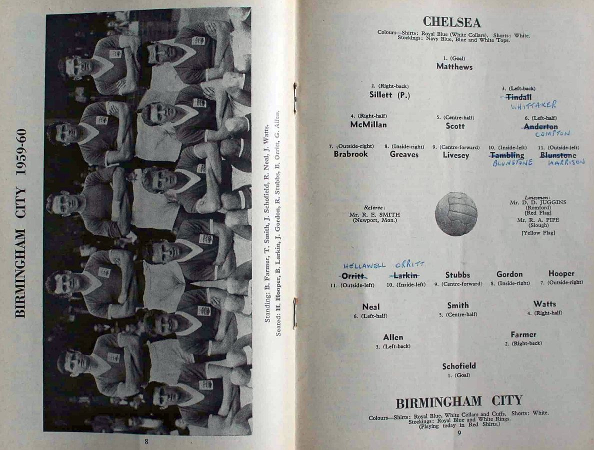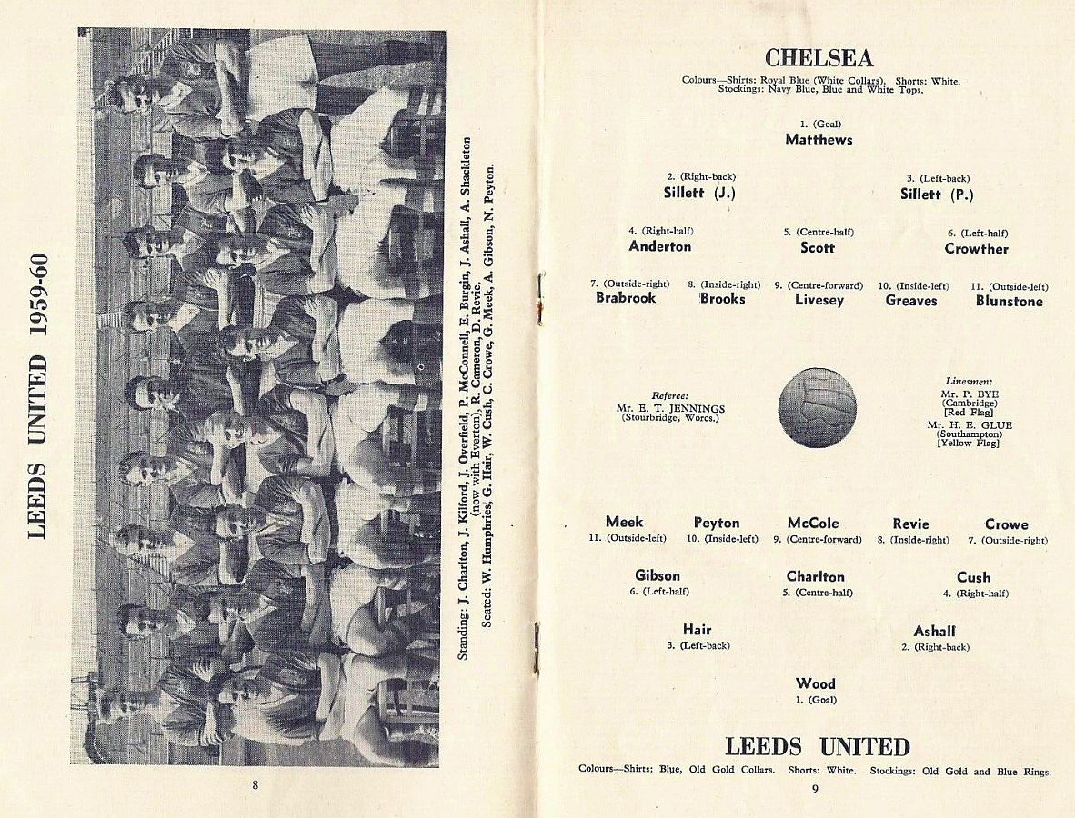 1 Reg Matthews, 2 Peter Sillett, 3 Richard Whittaker, 4 Eric McMillan, 5 Mel Scott, 6 John Compton, 7 Peter Brabrook, 8 Jimmy Greaves, 9 Charlie Livesey, 10 Frank Blunstone, 11 Mike Harrison |