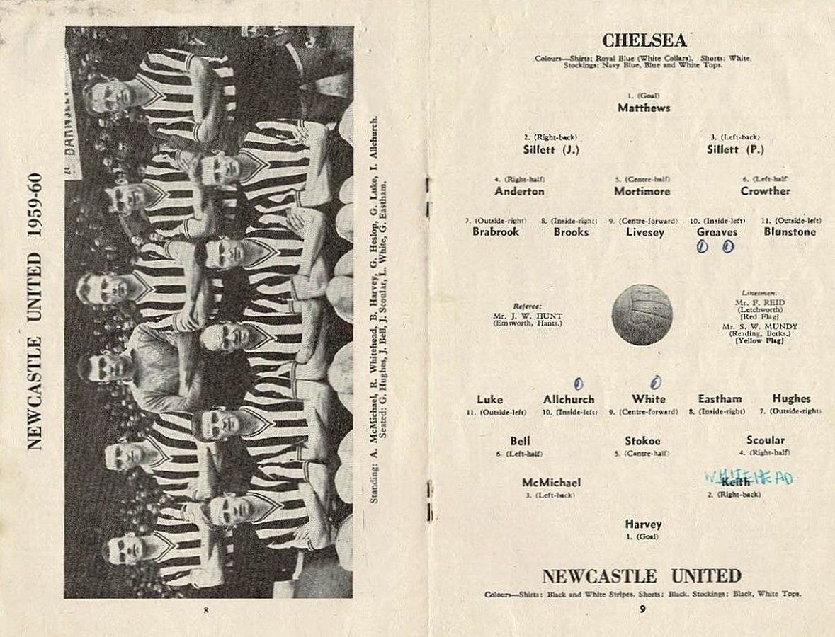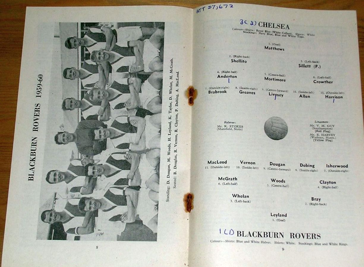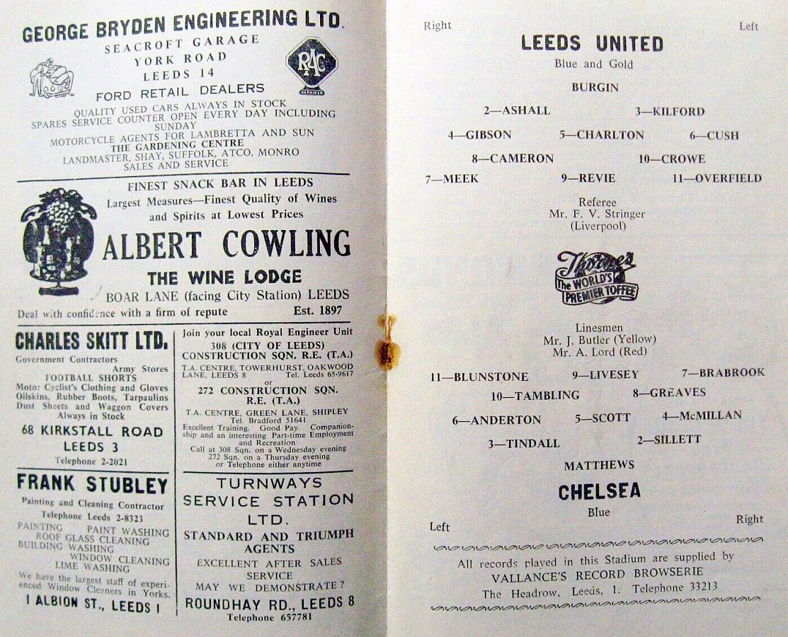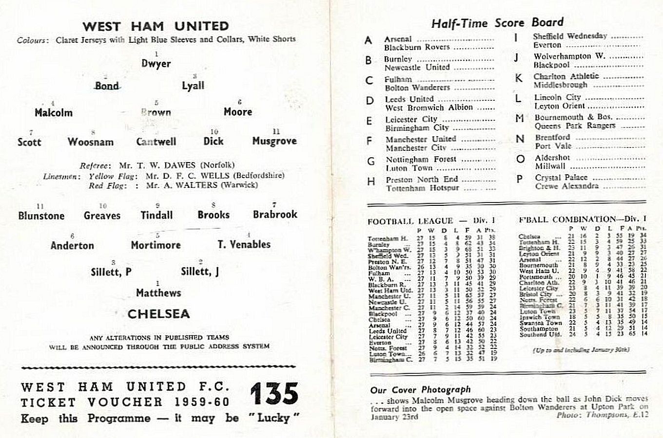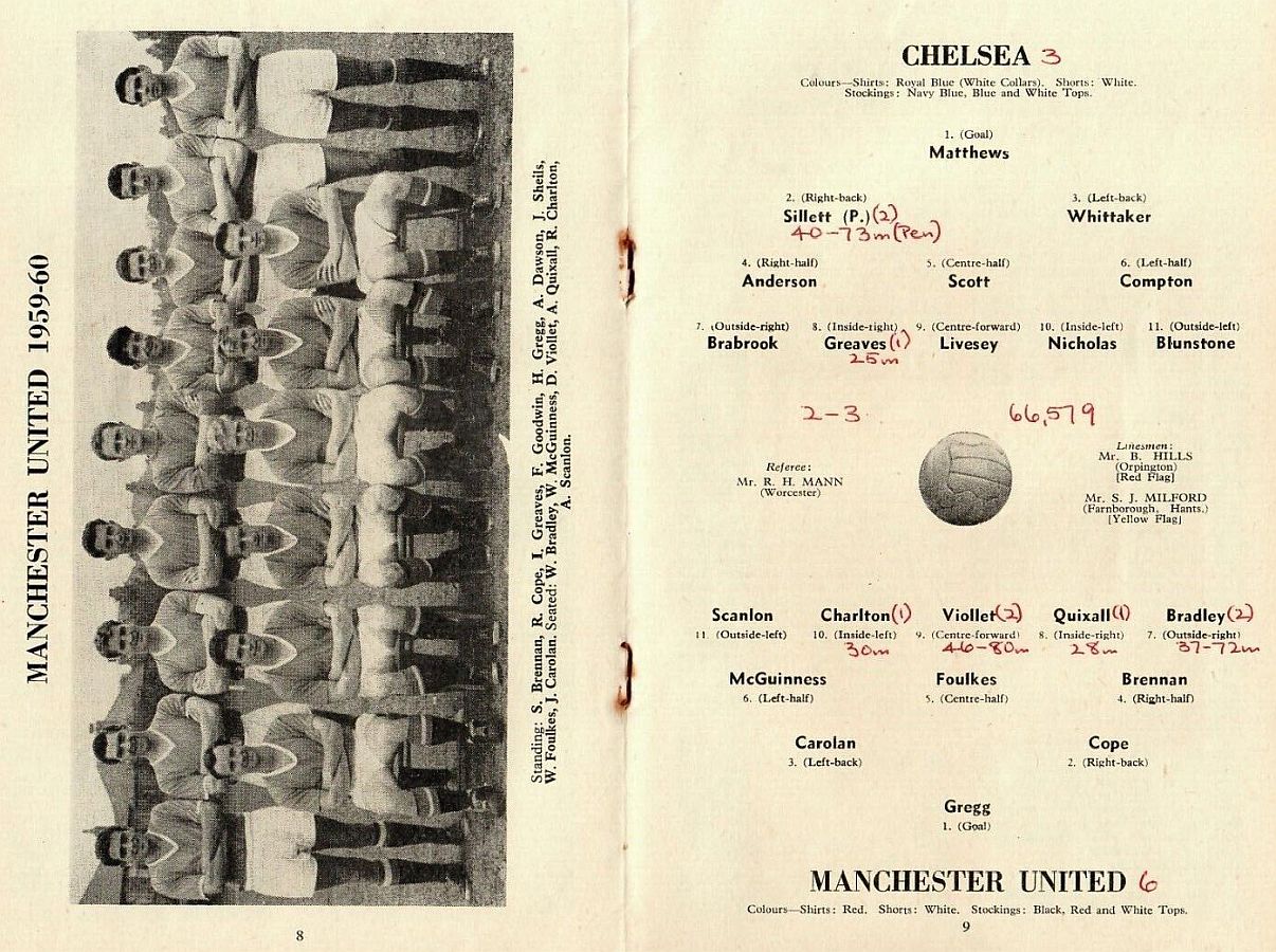1 Reg Matthews, 2 Peter Sillett, 3 Richard Whittaker, 4 Eric McMillan, 5 Mel Scott, 6 John Compton, 7 Peter Brabrook, 8 Jimmy Greaves, 9 Charlie Livesey, 10 Frank Blunstone, 11 Mike Harrison |