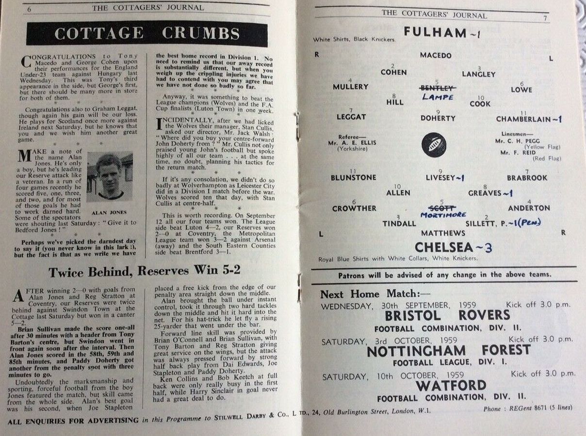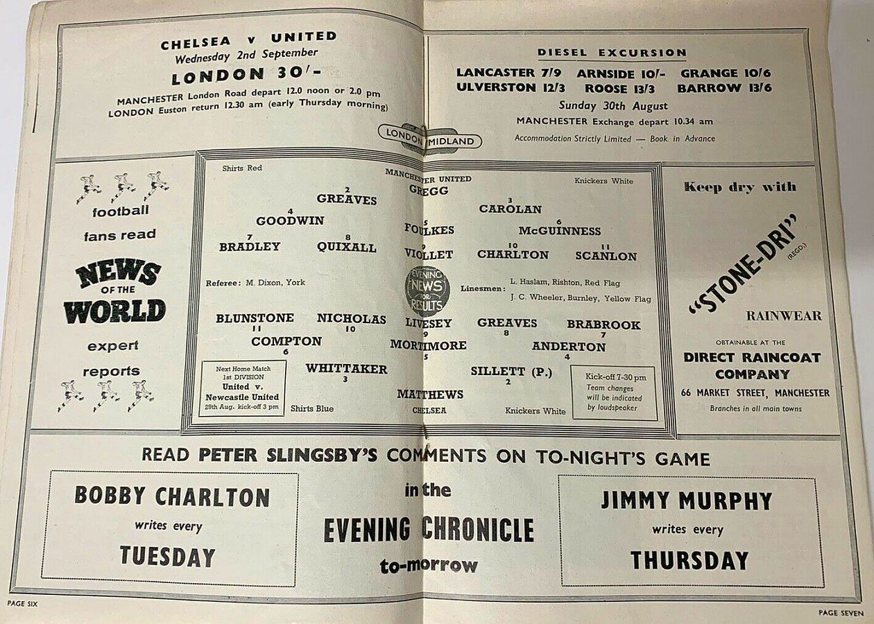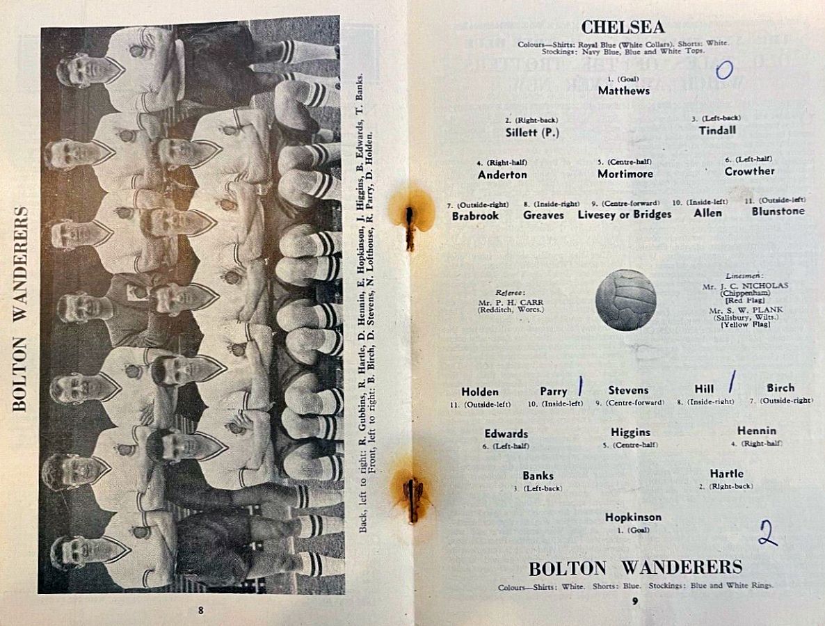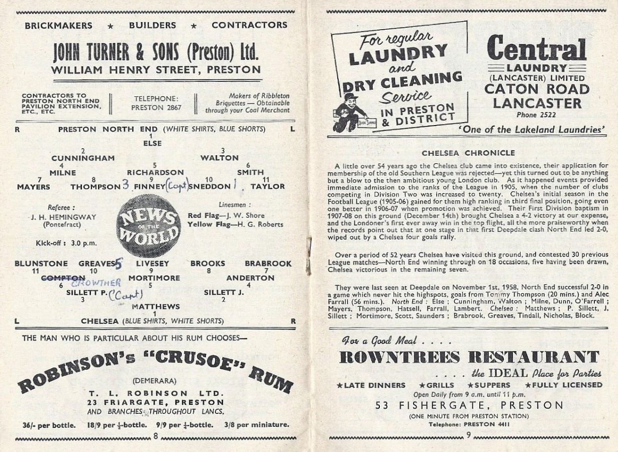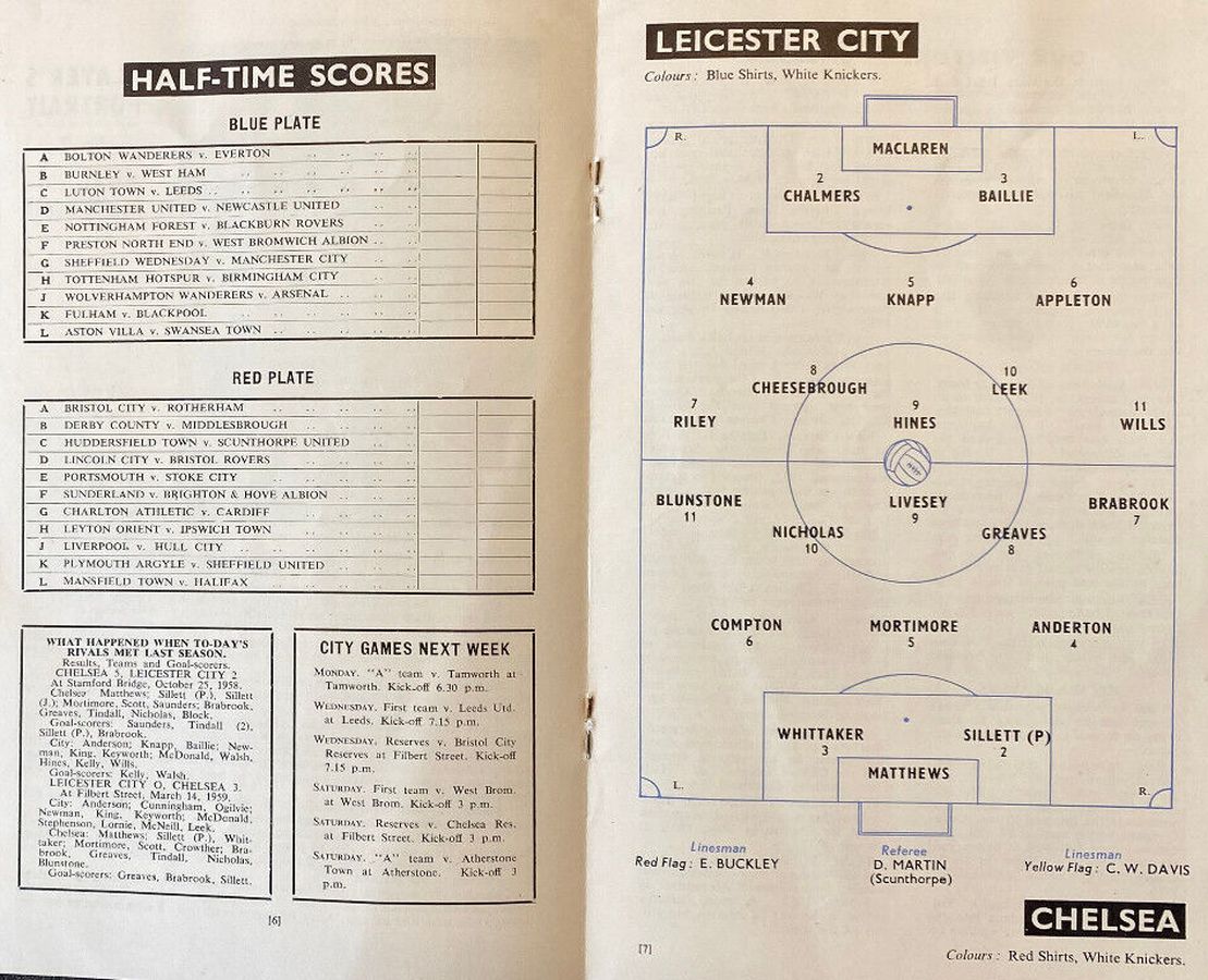 1 Reg Matthews, 2 Peter Sillett, 3 Richard Whittaker, 4 Eric McMillan, 5 Mel Scott, 6 John Compton, 7 Peter Brabrook, 8 Jimmy Greaves, 9 Charlie Livesey, 10 Frank Blunstone, 11 Mike Harrison |