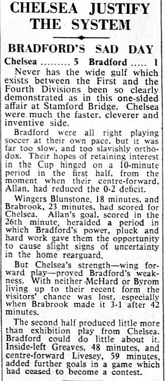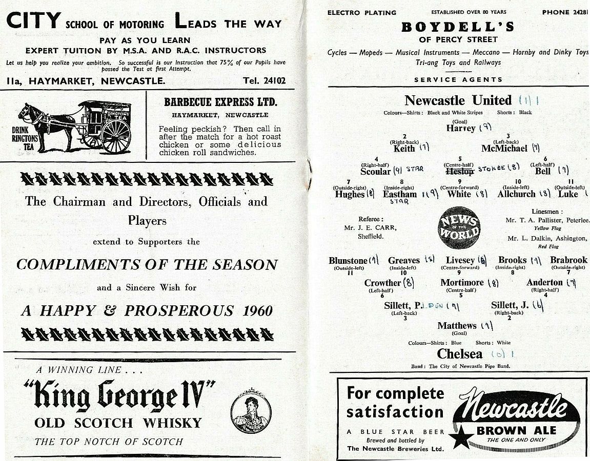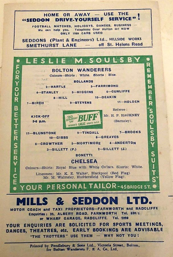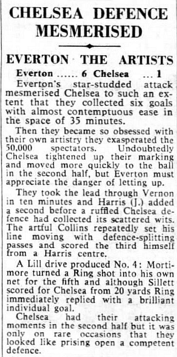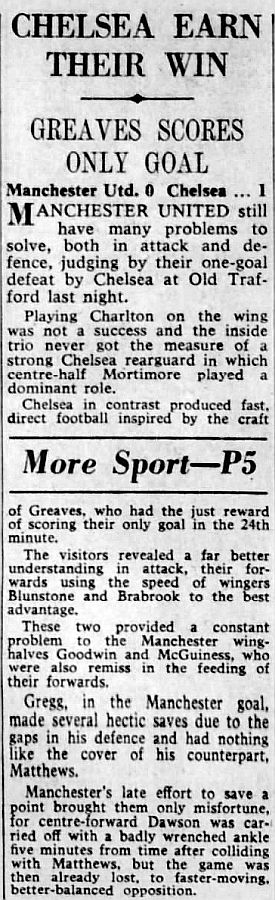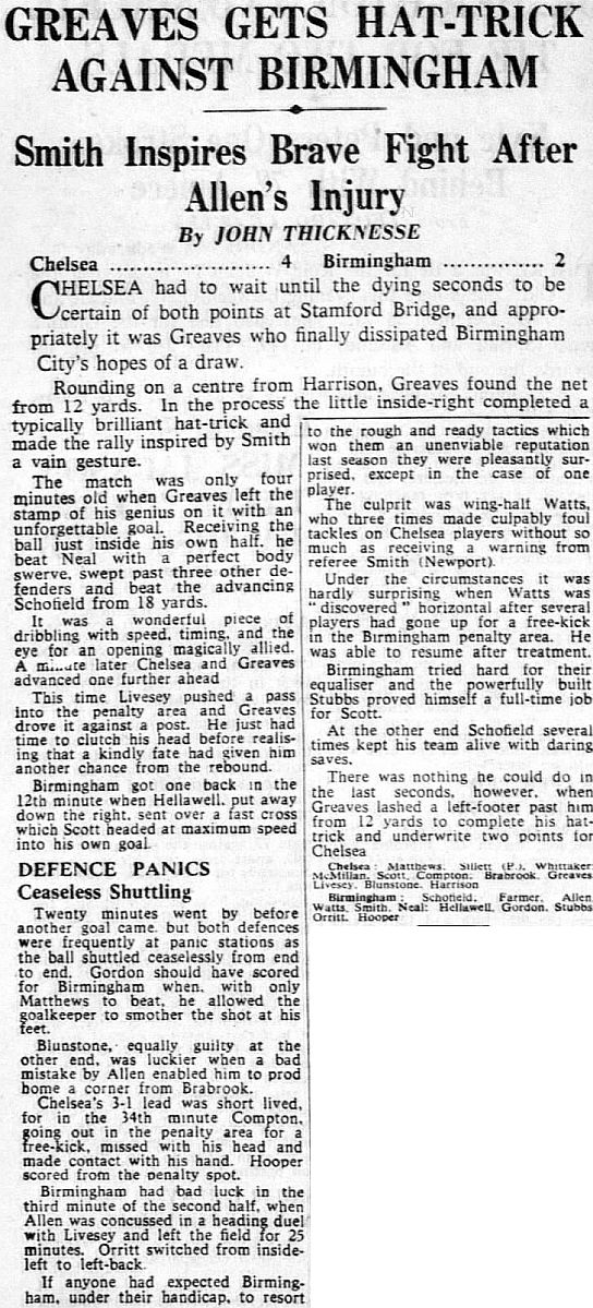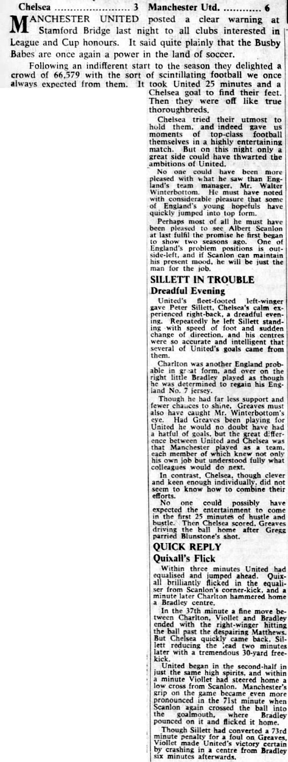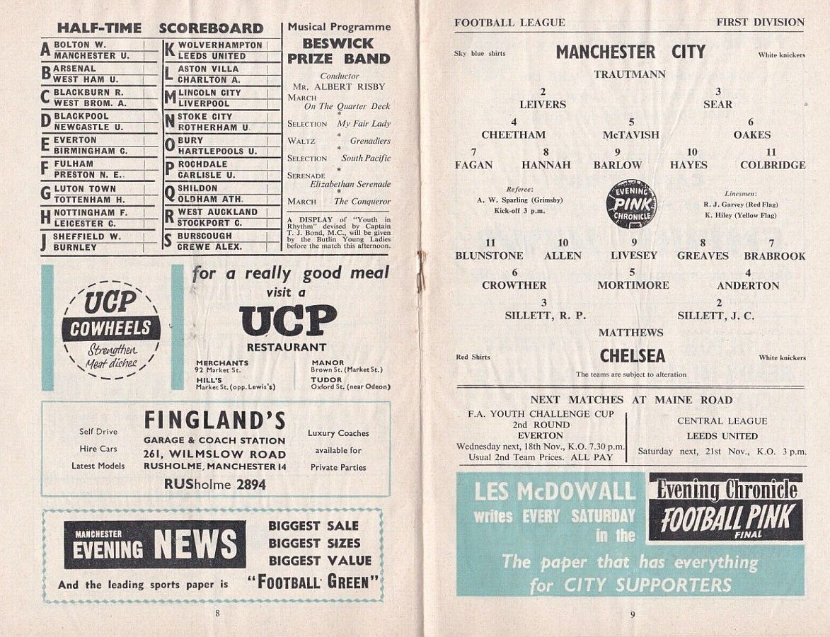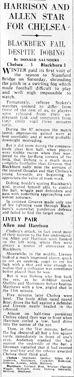 1 Reg Matthews, 2 Peter Sillett, 3 Richard Whittaker, 4 Eric McMillan, 5 Mel Scott, 6 John Compton, 7 Peter Brabrook, 8 Jimmy Greaves, 9 Charlie Livesey, 10 Frank Blunstone, 11 Mike Harrison |