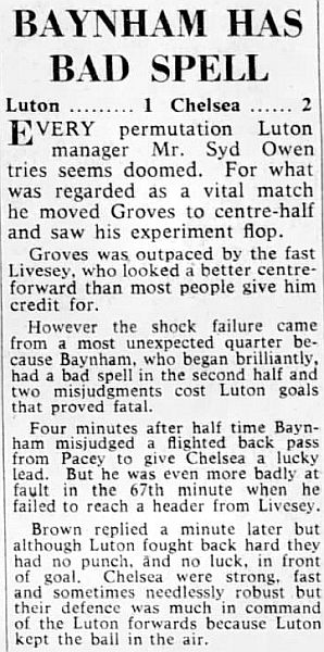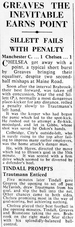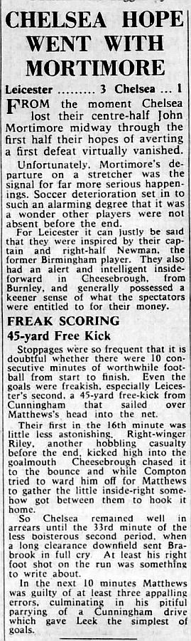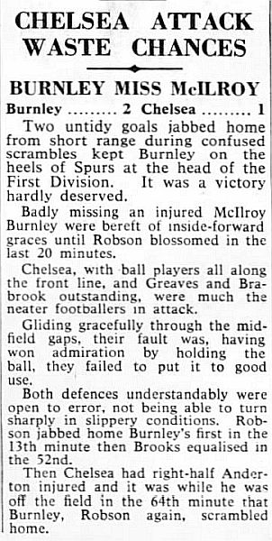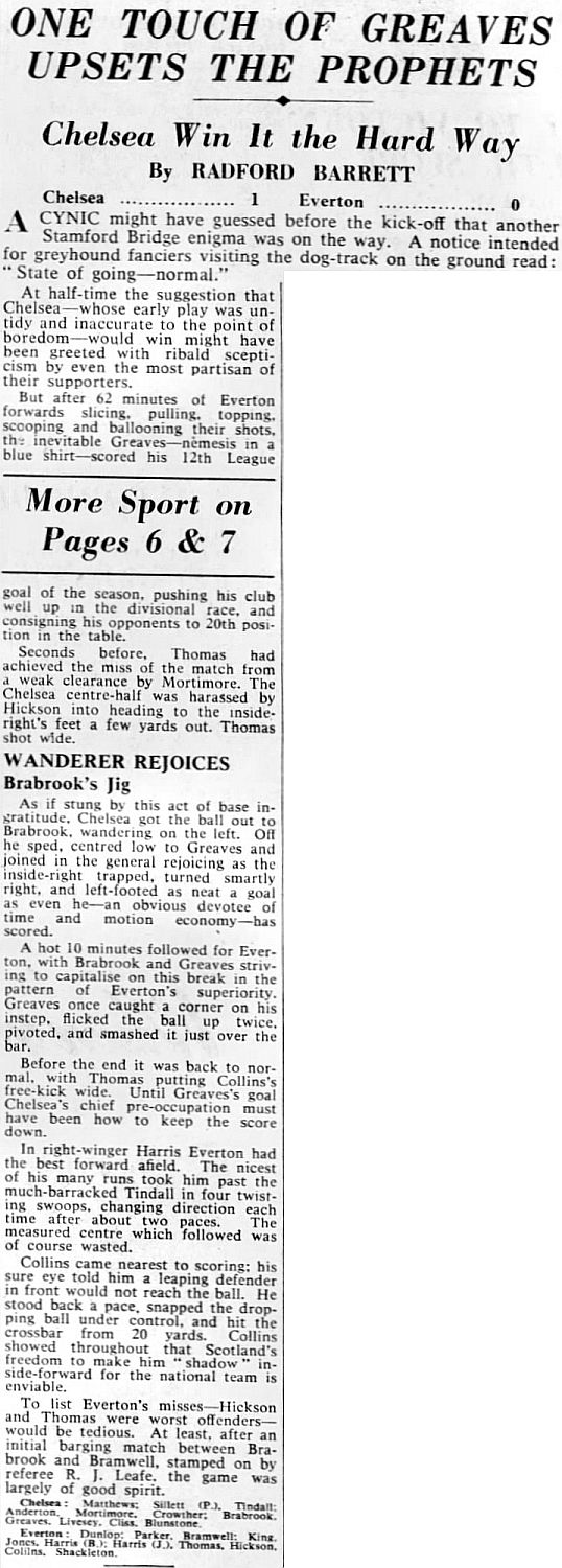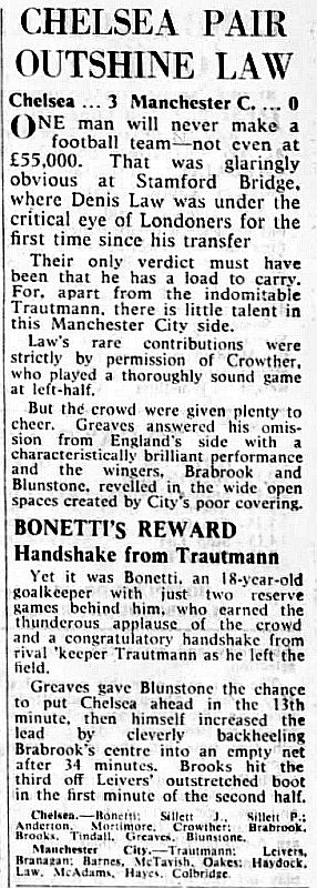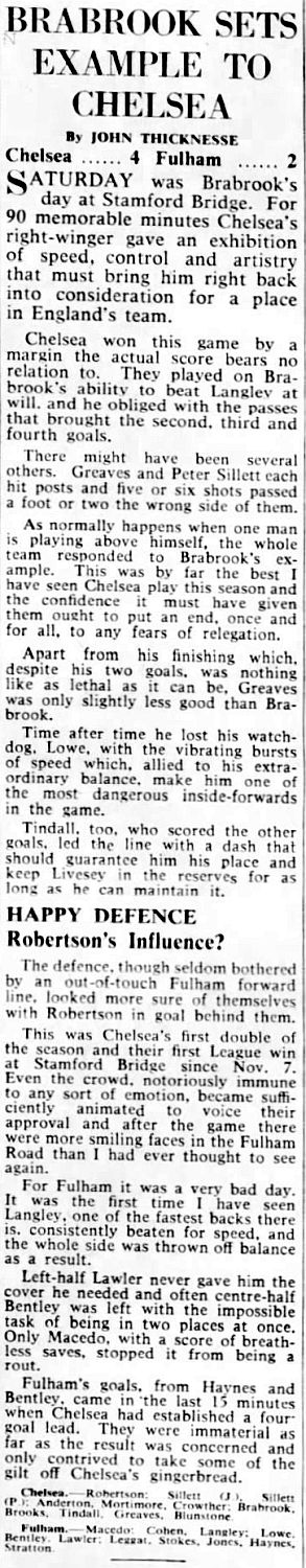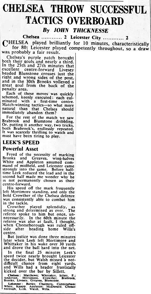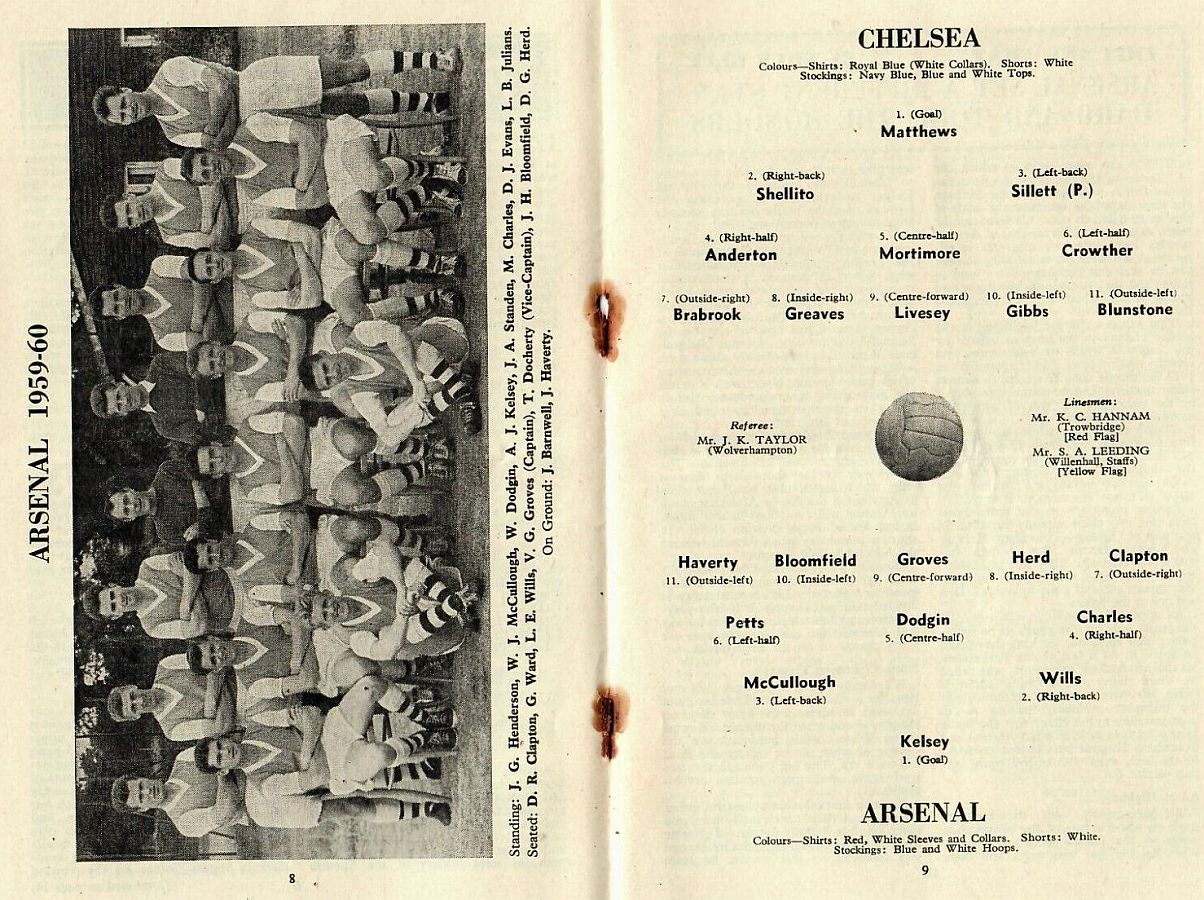 1 Peter Bonetti, 2 John Sillett, 3 Peter Sillett, 4 Sylvan Anderton, 5 John Mortimore, 6 Stan Crowther, 7 Peter Brabrook, 8 Jimmy Greaves, 9 Ron Tindall, 10 Johnny Brooks, 11 Frank Blunstone |