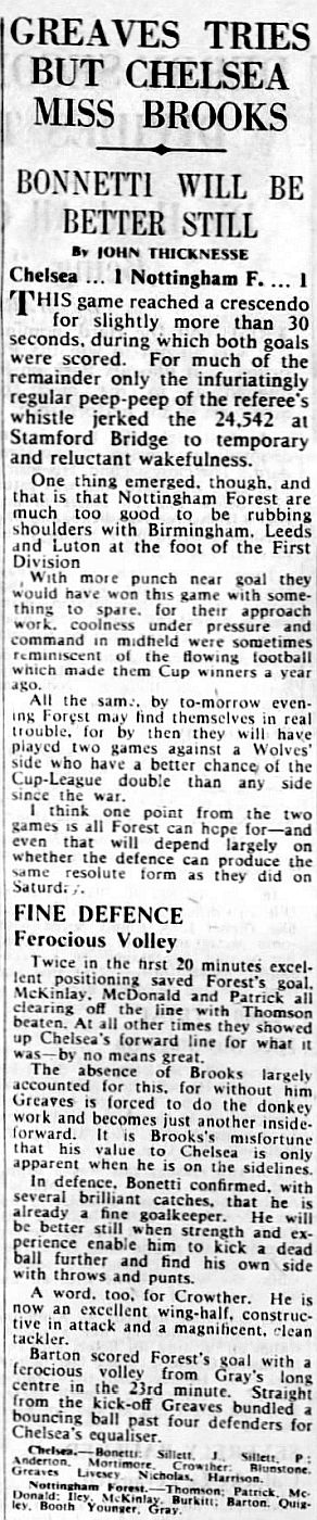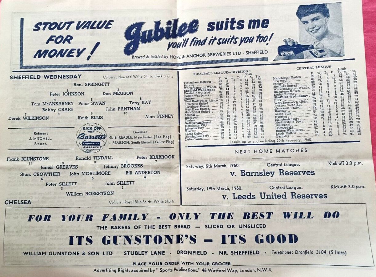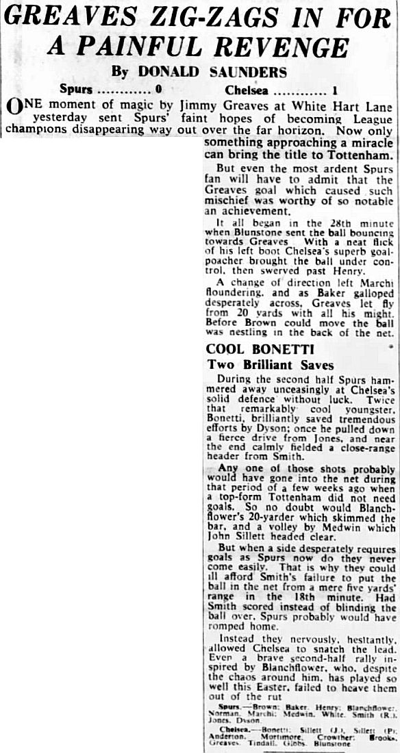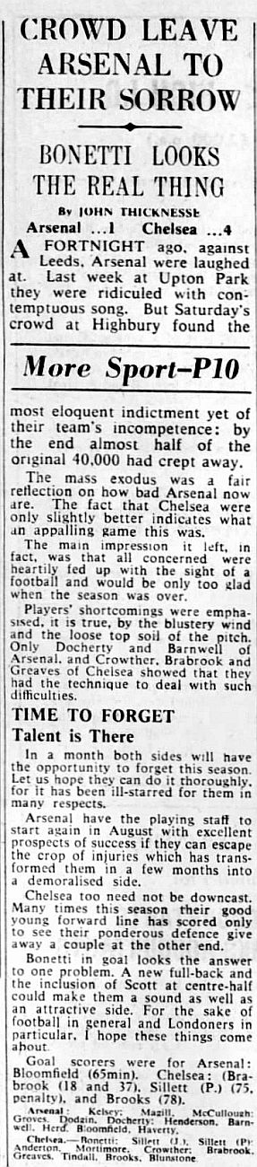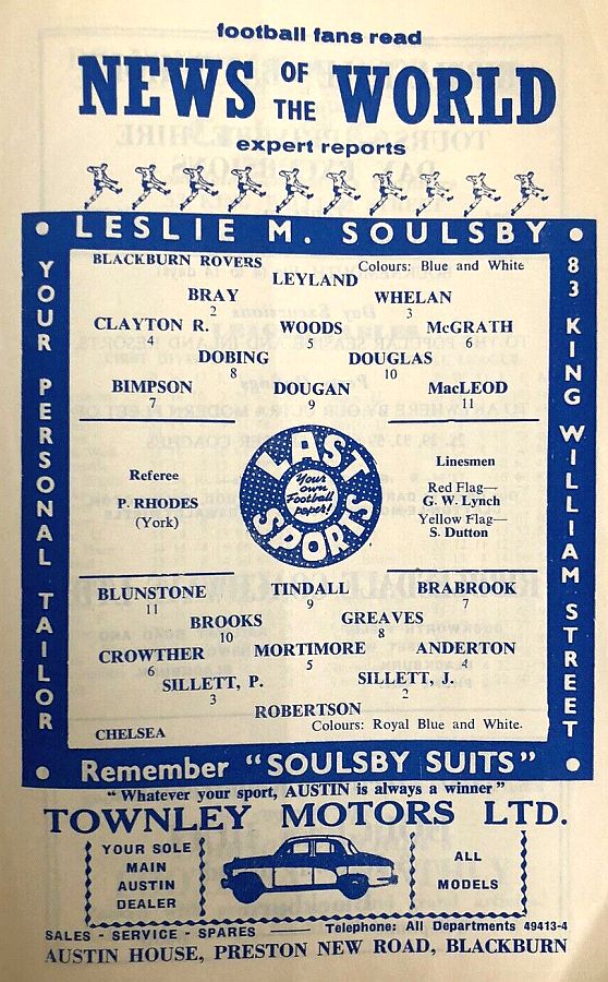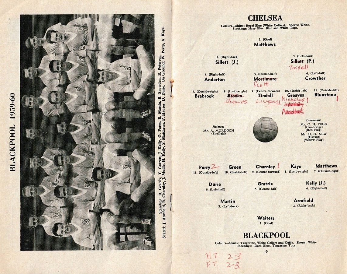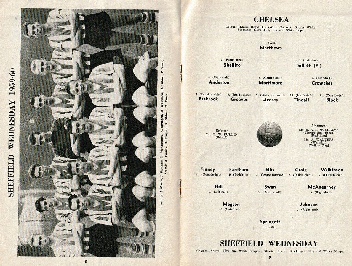 1 Peter Bonetti, 2 John Sillett, 3 Peter Sillett, 4 Sylvan Anderton, 5 John Mortimore, 6 Stan Crowther, 7 Frank Blunstone, 8 Jimmy Greaves, 9 Charlie Livesey, 10 Tony Nicholas, 11 Mike Harrison |