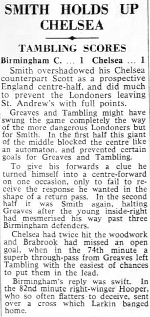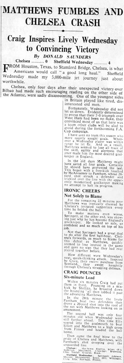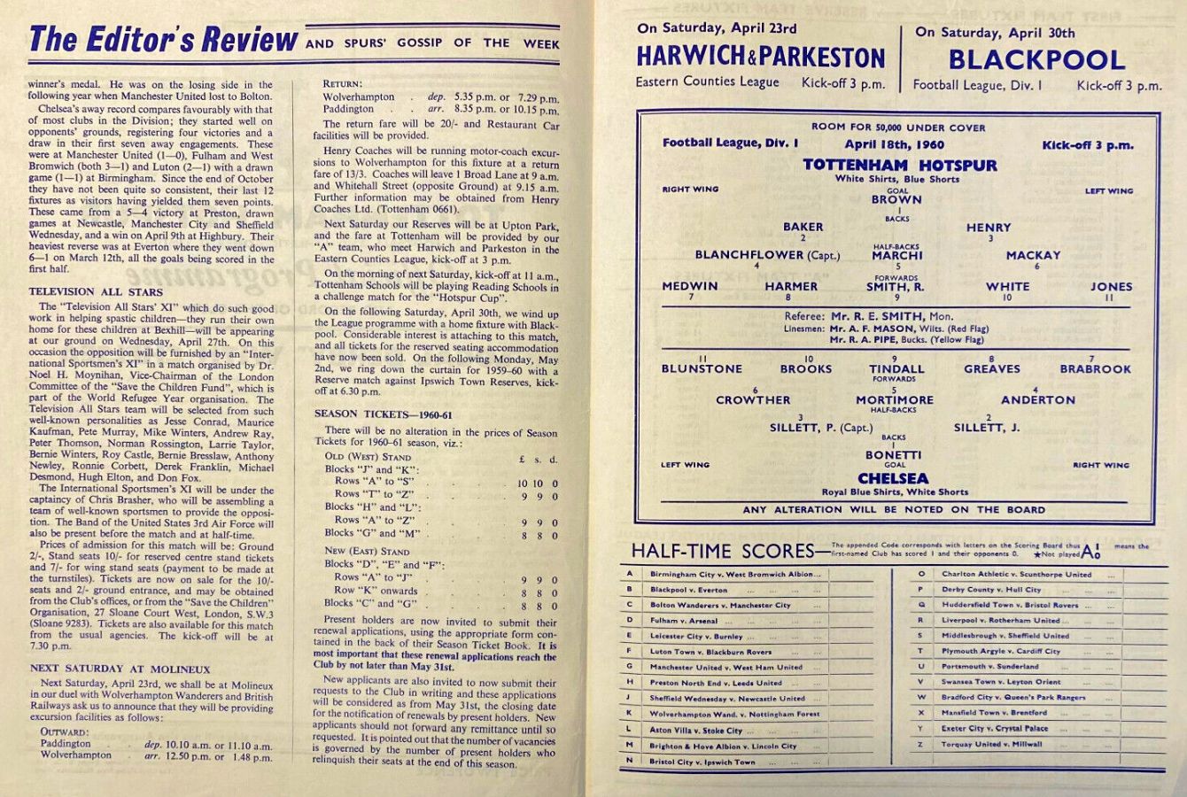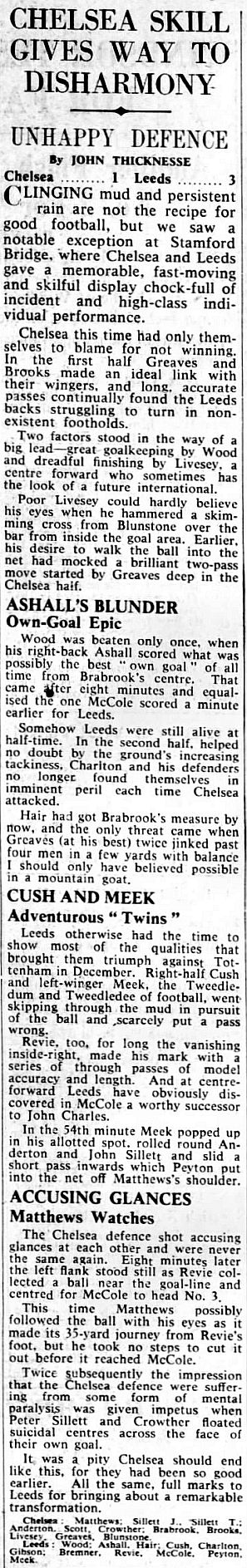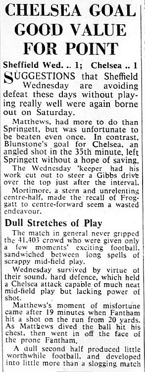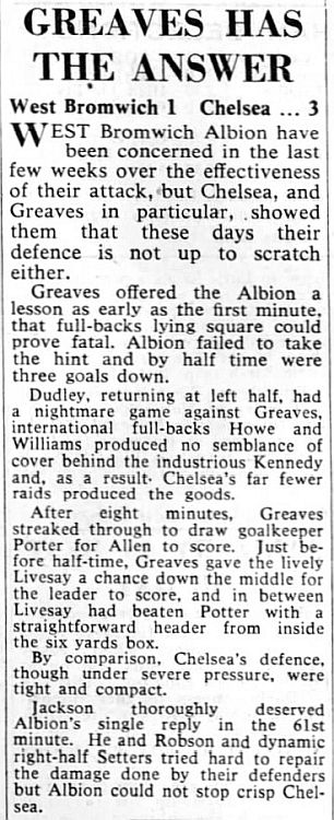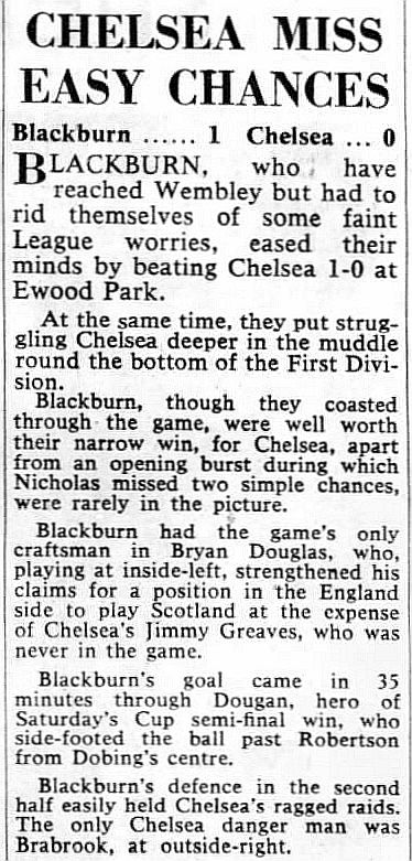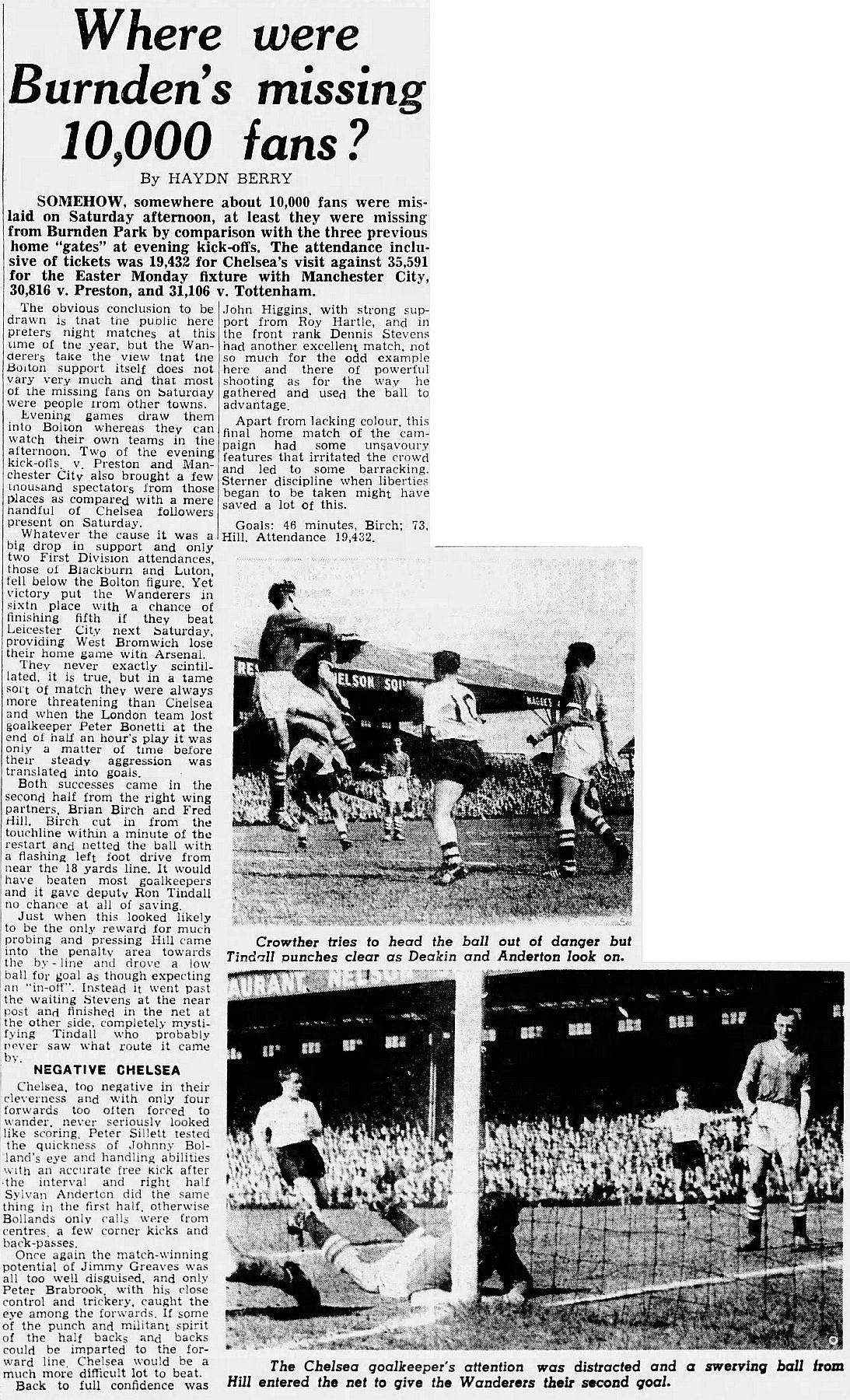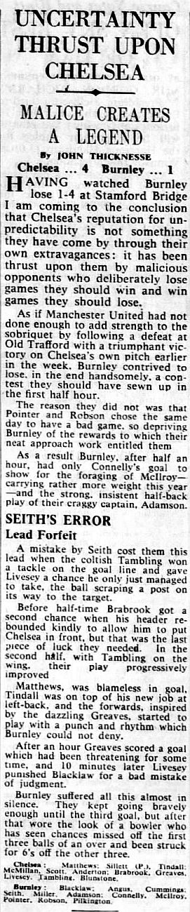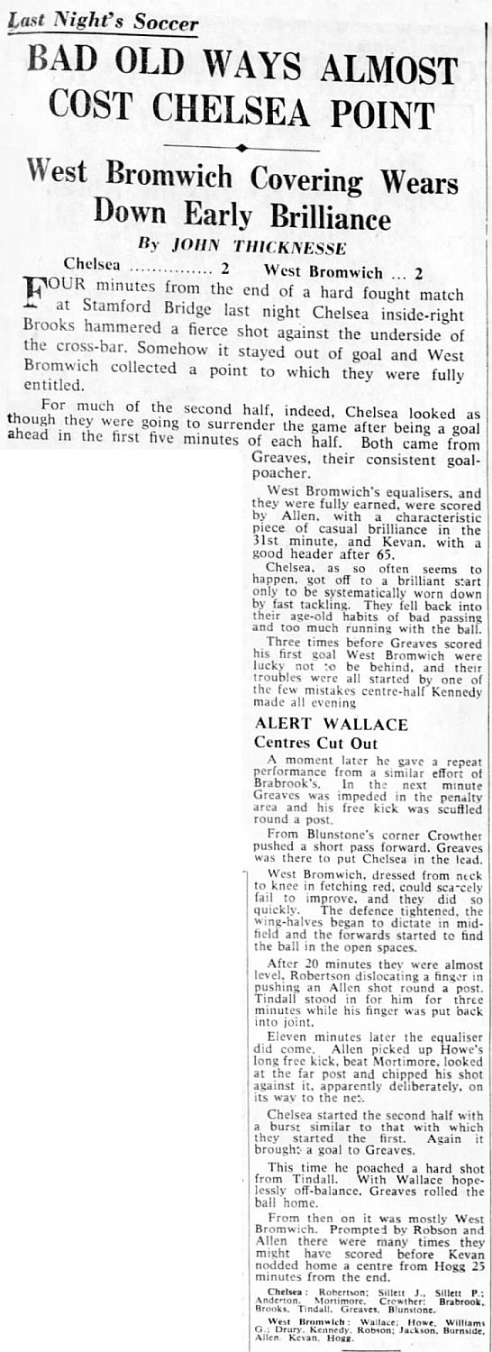 1 Peter Bonetti, 2 John Sillett, 3 Peter Sillett, 4 Sylvan Anderton, 5 John Mortimore, 6 Stan Crowther, 7 Frank Blunstone, 8 Jimmy Greaves, 9 Charlie Livesey, 10 Tony Nicholas, 11 Mike Harrison |
