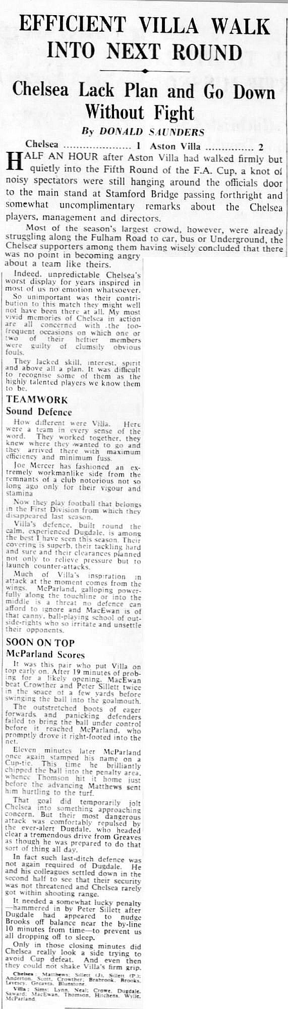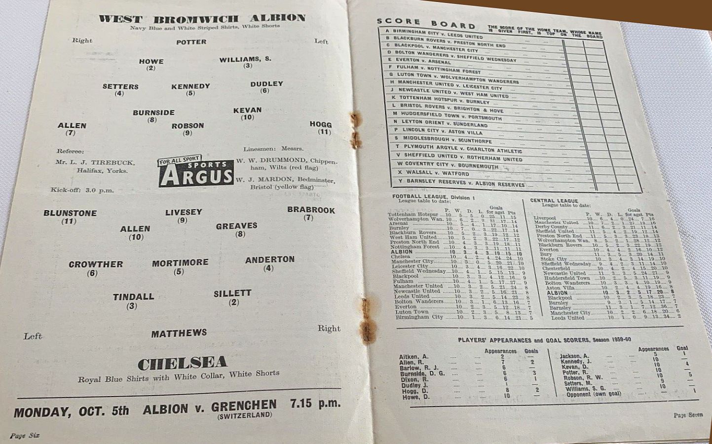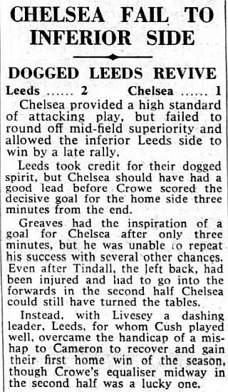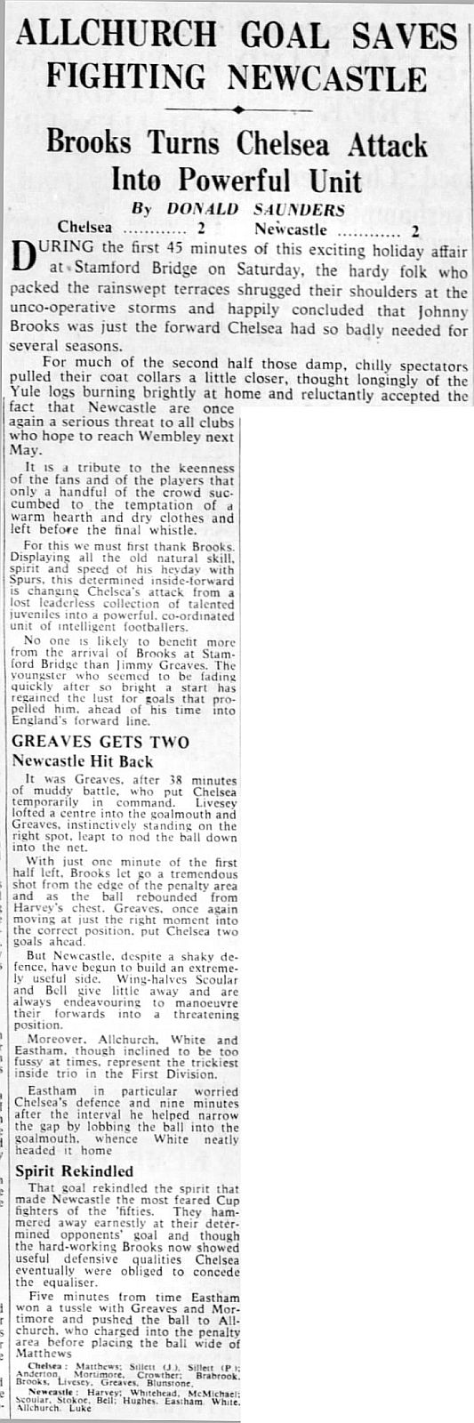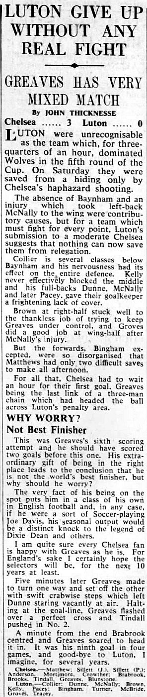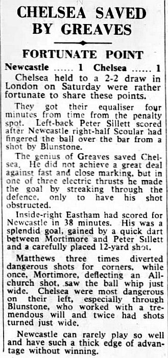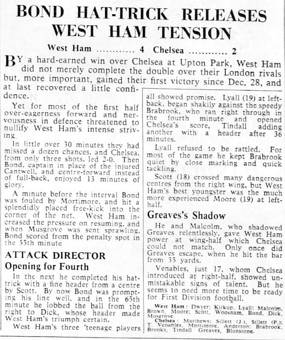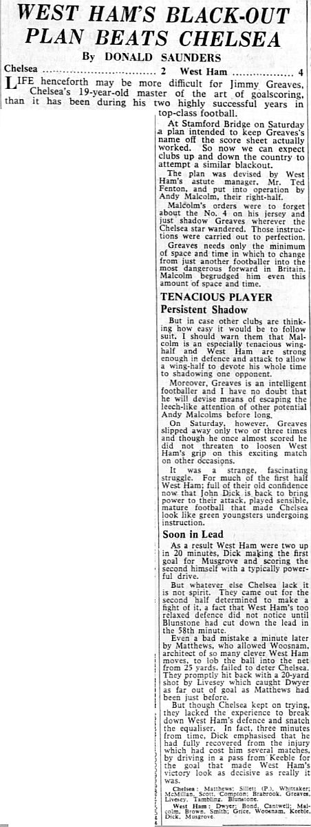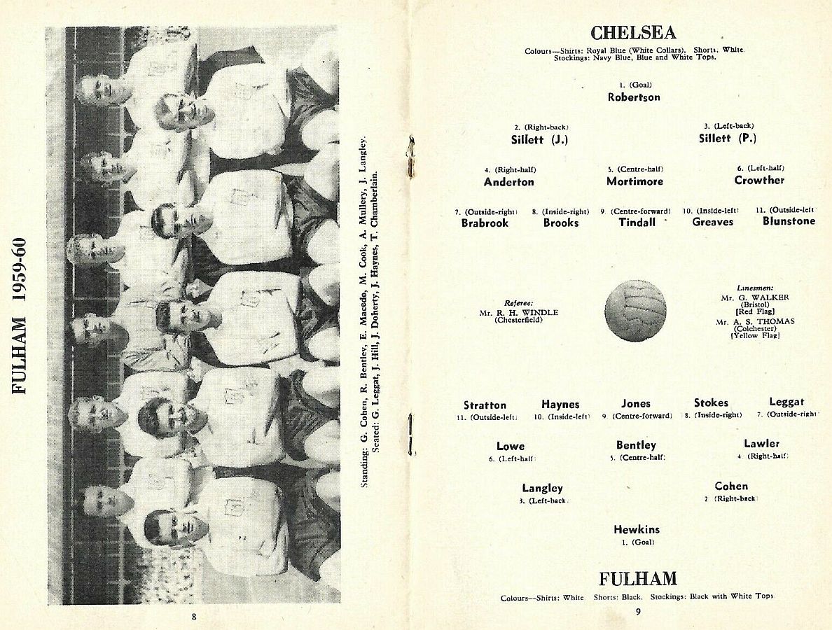 1 Reg Matthews, 2 John Sillett, 3 Ron Tindall, 4 Sylvan Anderton, 5 Mel Scott, 6 Stan Crowther, 7 Peter Brabrook, 8 Jimmy Greaves, 9 Charlie Livesey, 10 Tony Nicholas, 11 Frank Blunstone |
