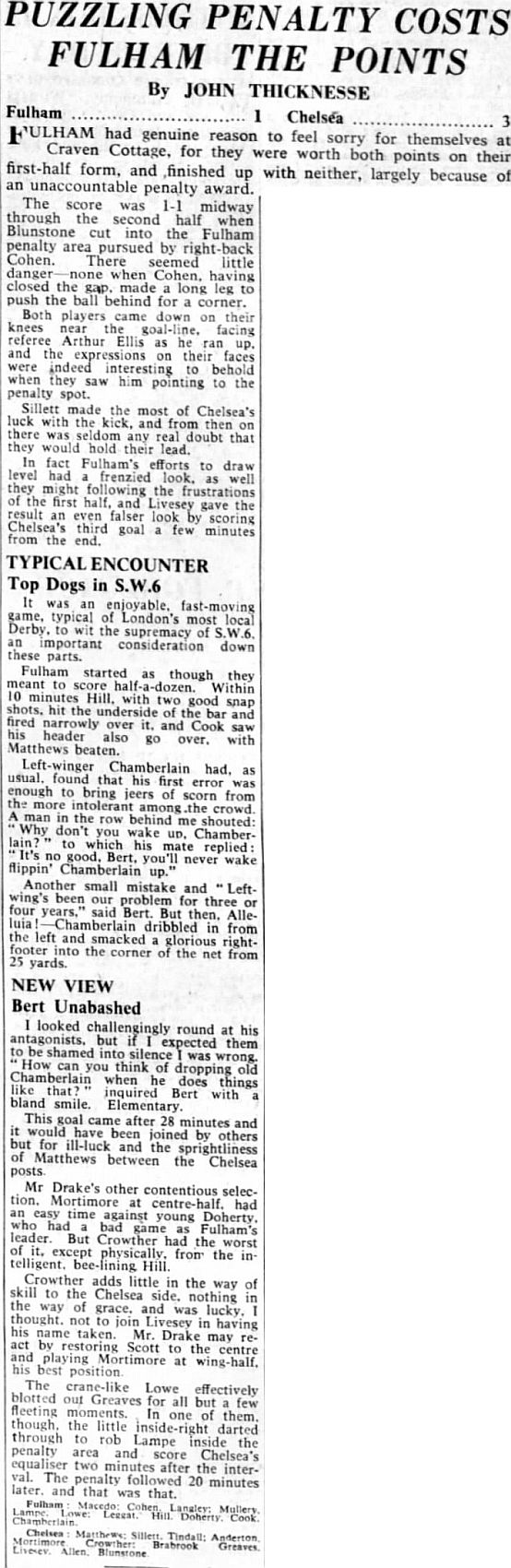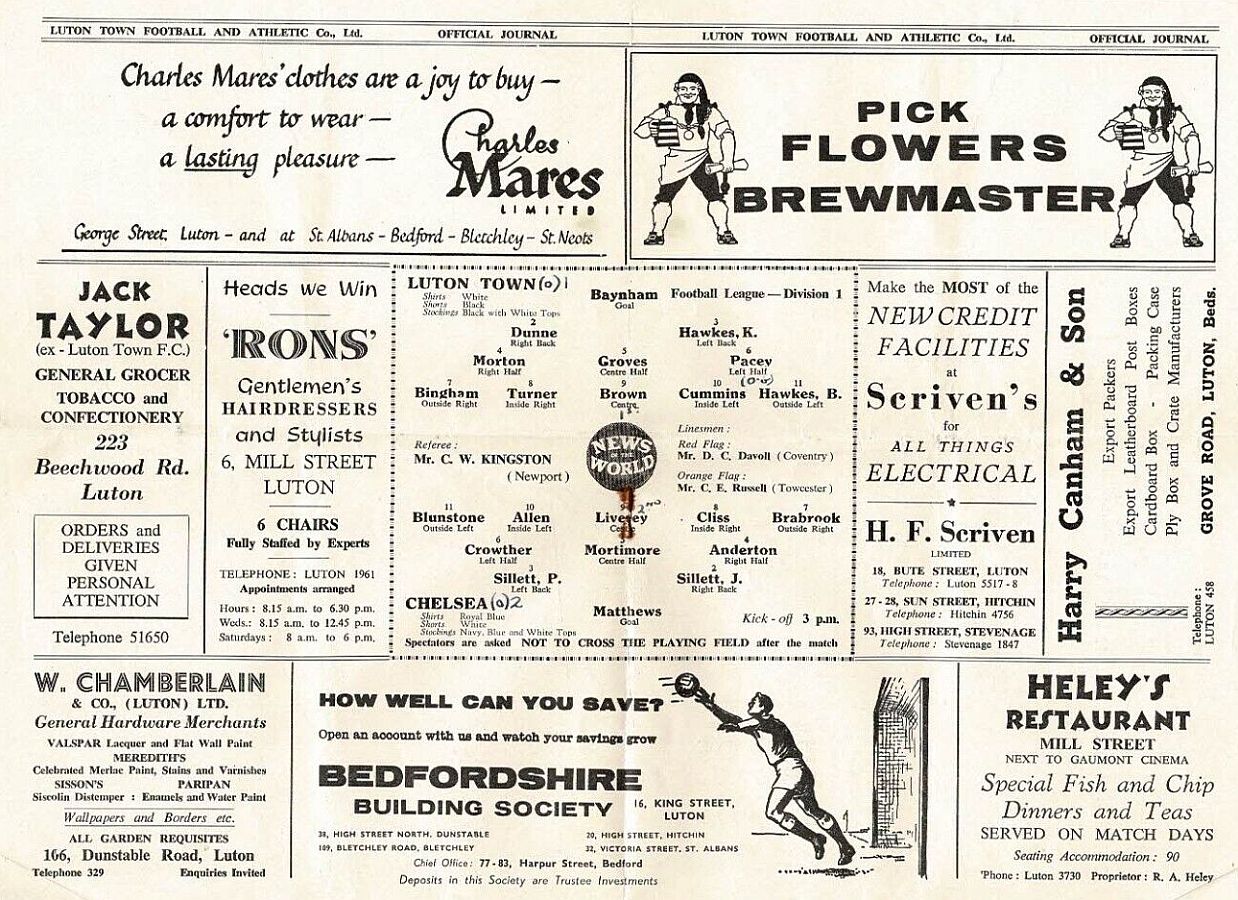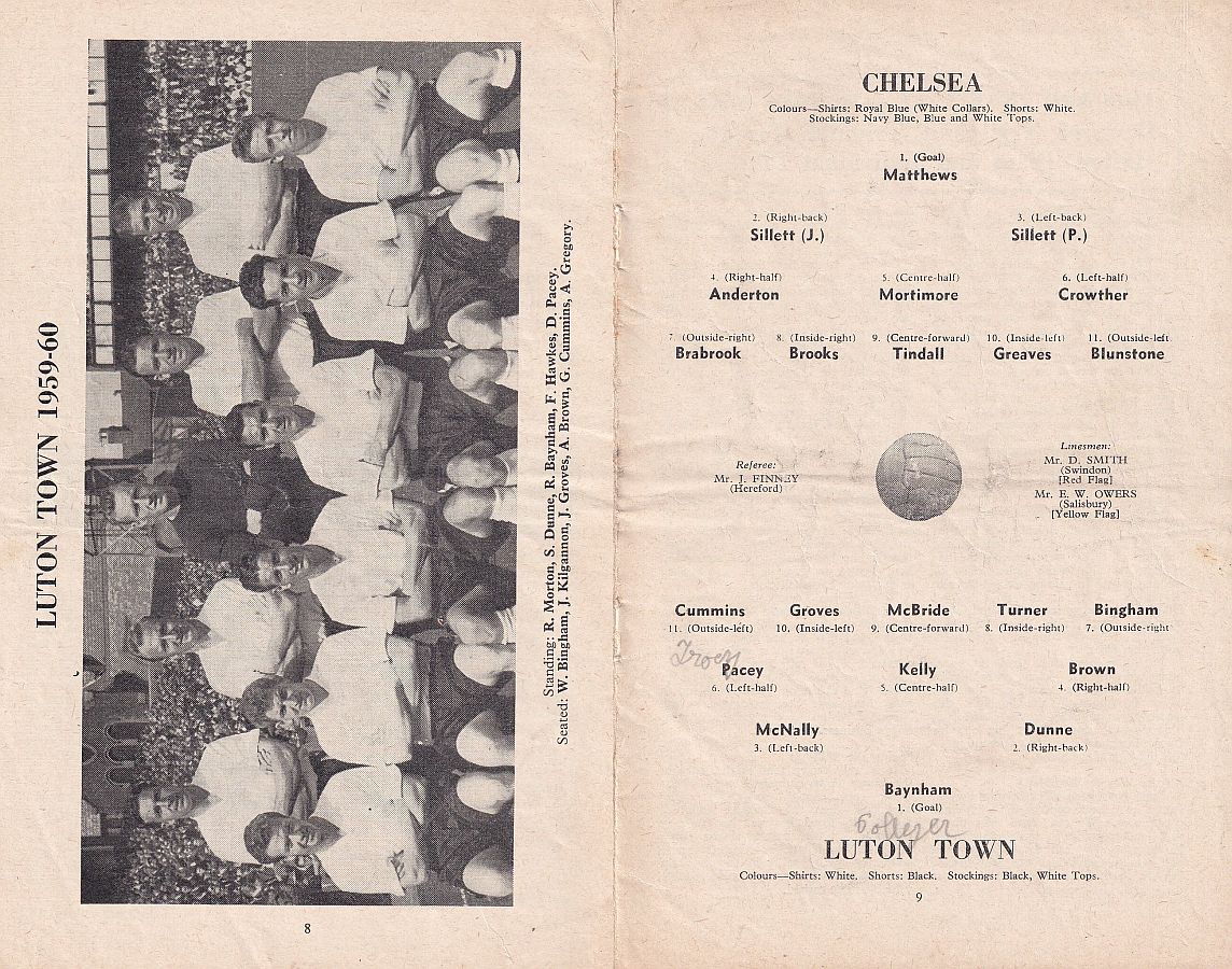 1 Reg Matthews, 2 John Sillett, 3 Peter Sillett, 4 Sylvan Anderton, 5 John Mortimore, 6 Stan Crowther, 7 Peter Brabrook, 8 Jimmy Greaves, 9 Ron Tindall, 10 Johnny Brooks, 11 Frank Blunstone |