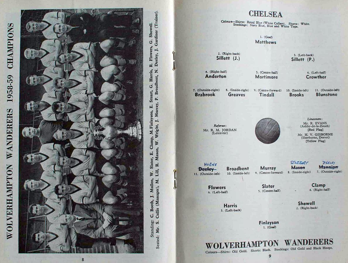 1 Bill Robertson, 2 Peter Sillett, 3 Ron Tindall, 4 Sylvan Anderton, 5 John Mortimore, 6 Stan Crowther, 7 Peter Brabrook, 8 Jimmy Greaves, 9 Tony Nicholas, 10 Johnny Brooks, 11 Frank Blunstone |