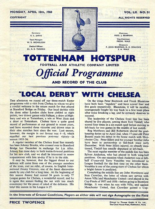 Bill Brown, Peter Baker, Ron Henry, Danny Blanchflower, Maurice Norman, Tony Marchi, Terry Medwin, John White, Bobby Smith, Cliff Jones, Terry Dyson |