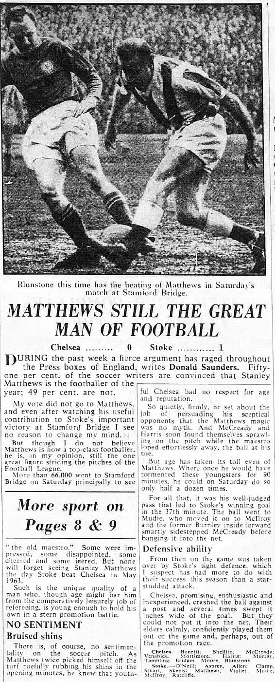 Jimmy O'Neill, Bill Asprey, Tony Allen, Eddie Clamp, Eddie Stuart, Eric Skeels, Stanley Matthews, Dennis Viollet, Jackie Mudie, Jimmy McIlroy, Don Ratcliffe |