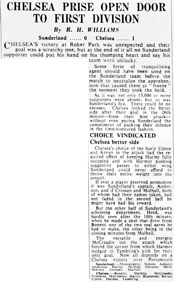 1 Peter Bonetti, 2 Allan Harris, 3 Eddie McCreadie, 4 Terry Venables, 5 John Mortimore, 6 Frank Upton, 7 Bert Murray, 8 Bobby Tambling, 9 Barry Bridges, 10 Derek Kevan, 11 Frank Blunstone |