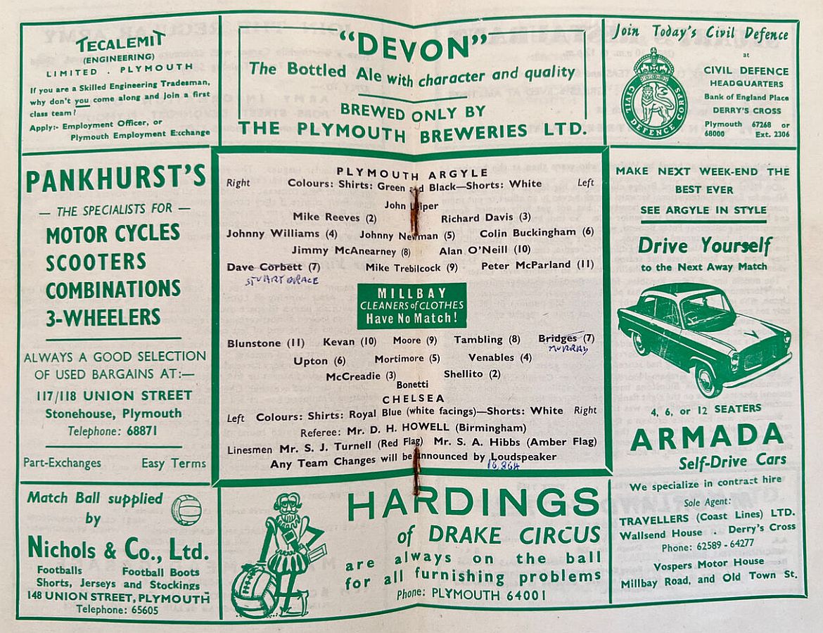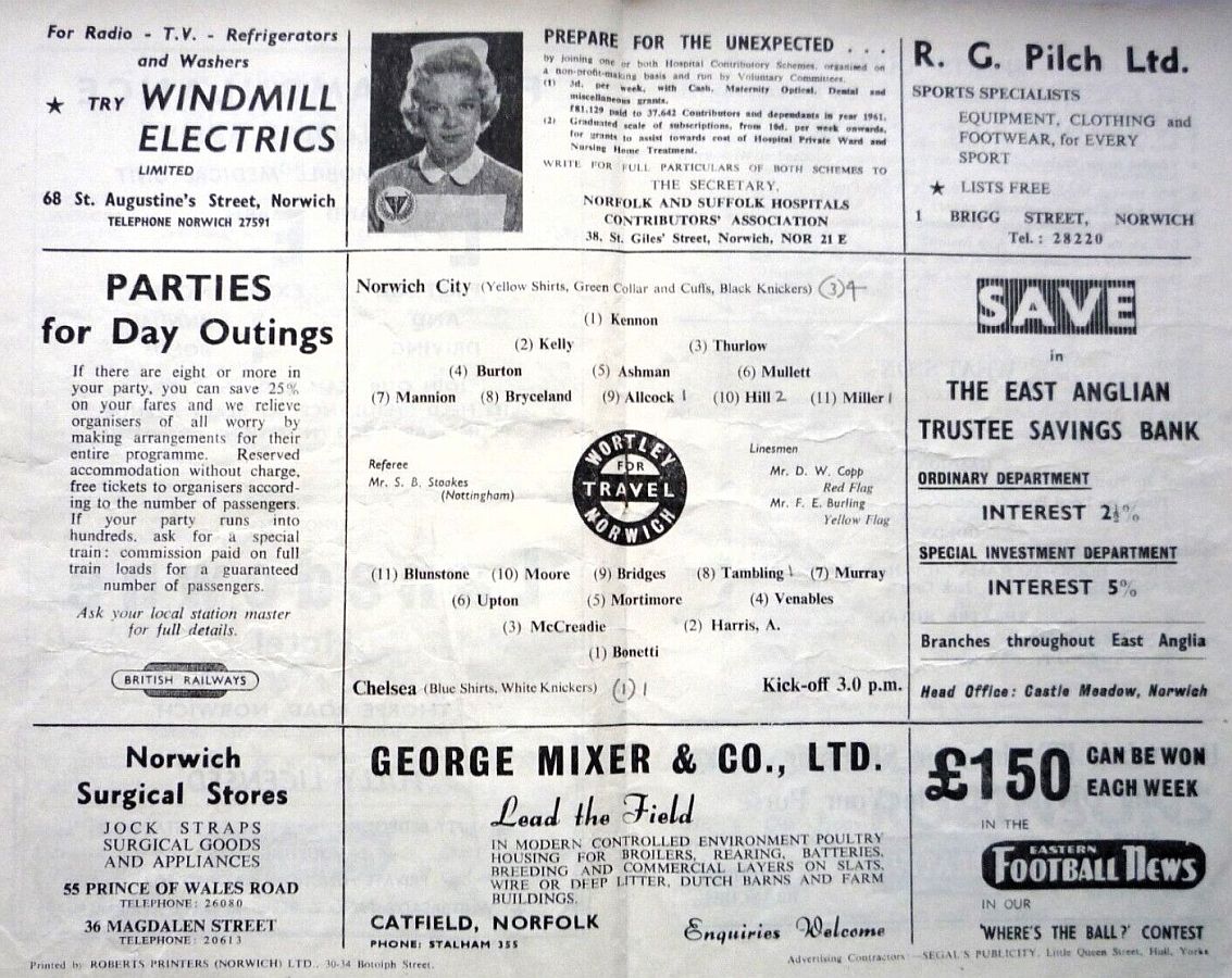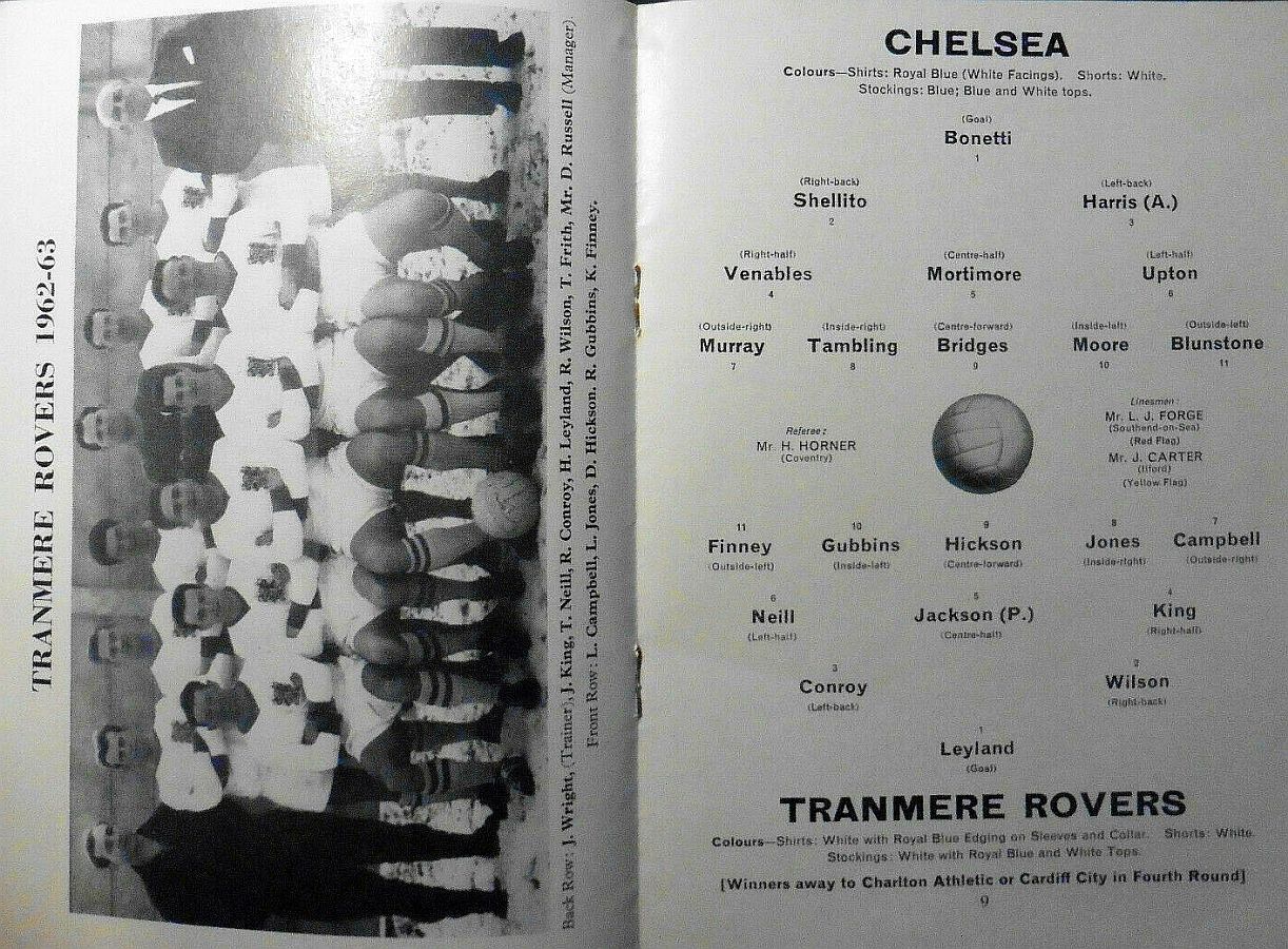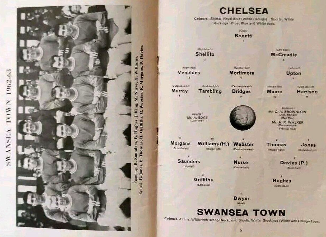 1 Peter Bonetti, 2 Ken Shellito, 3 Eddie McCreadie, 4 Terry Venables, 5 John Mortimore, 6 Frank Upton, 7 Bert Murray, 8 Bobby Tambling, 9 Barry Bridges, 10 Graham Moore, 11 Mike Harrison |