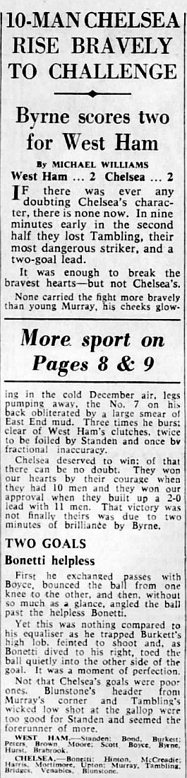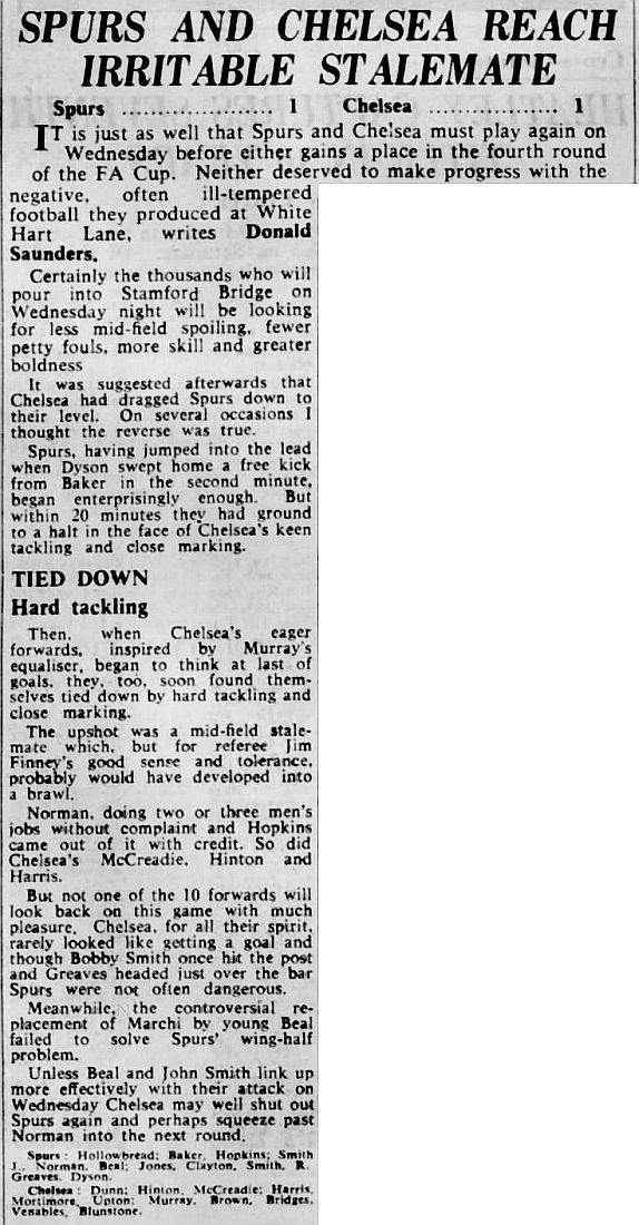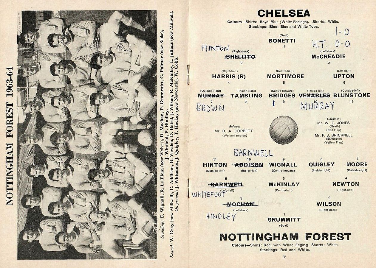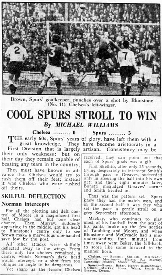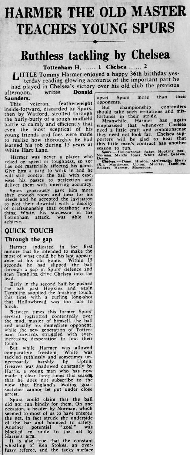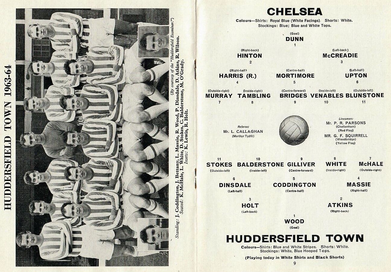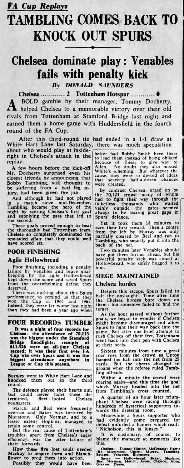 1 John Dunn, 2 Marvin Hinton, 3 Allan Harris, 4 Ron Harris, 5 John Mortimore, 6 Frank Upton, 7 Bert Murray, 8 Bobby Tambling, 9 Barry Bridges, 10 Tommy Harmer, 11 Frank Blunstone |