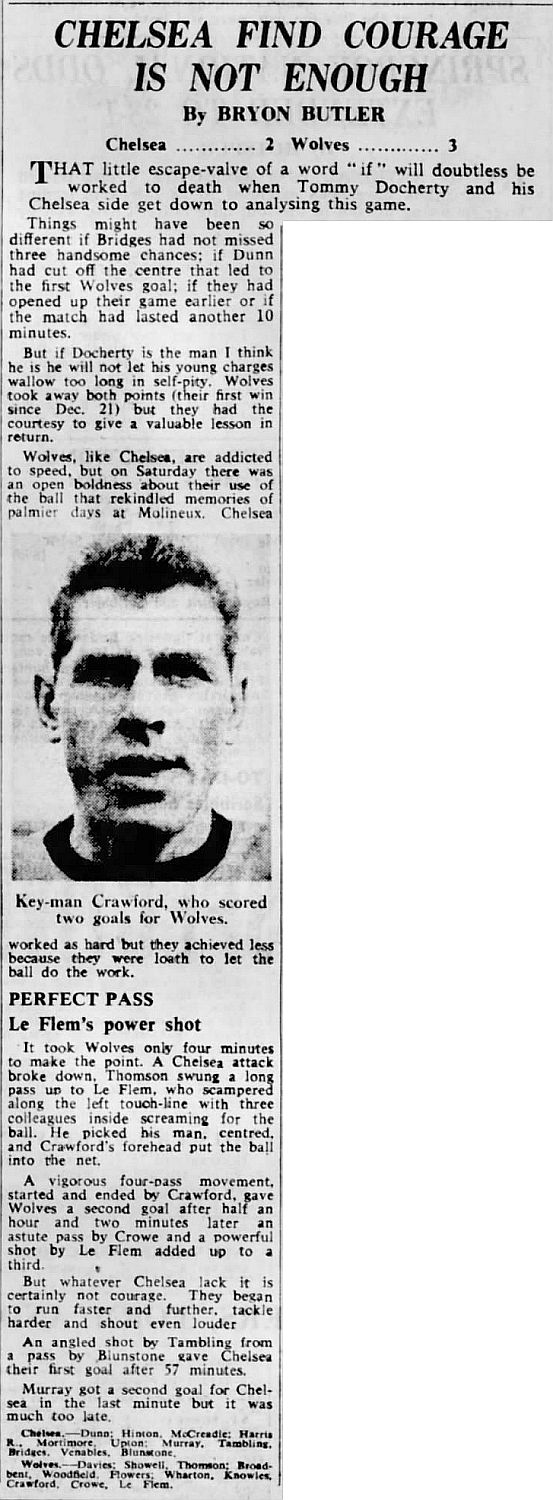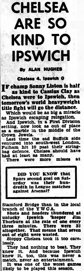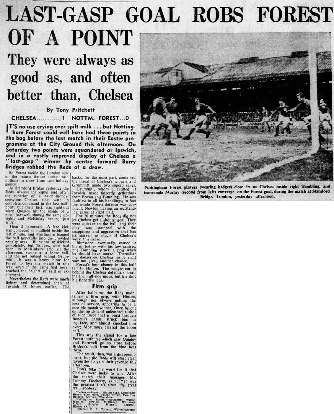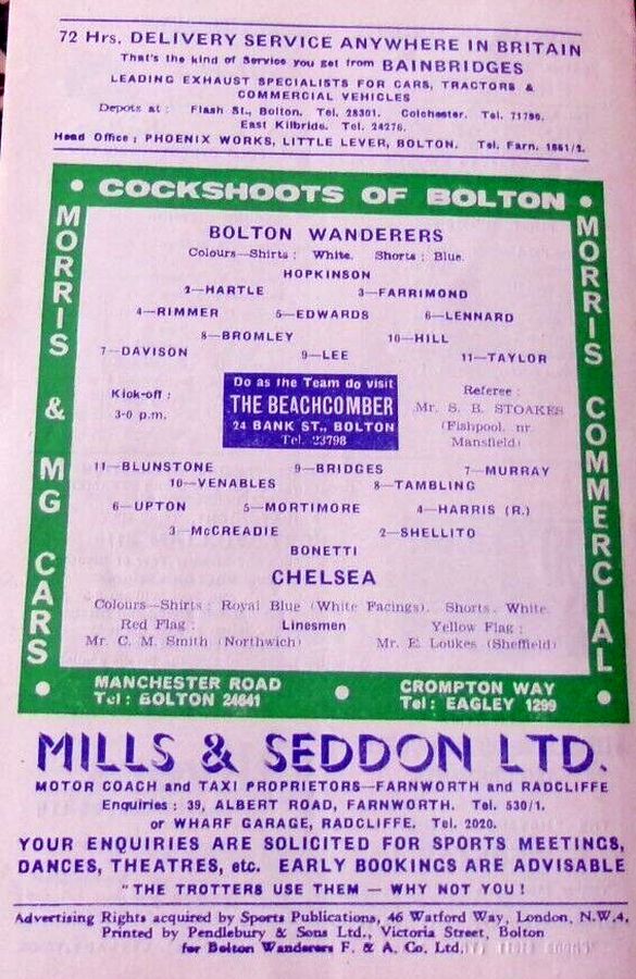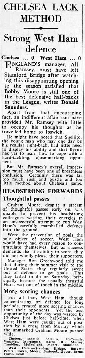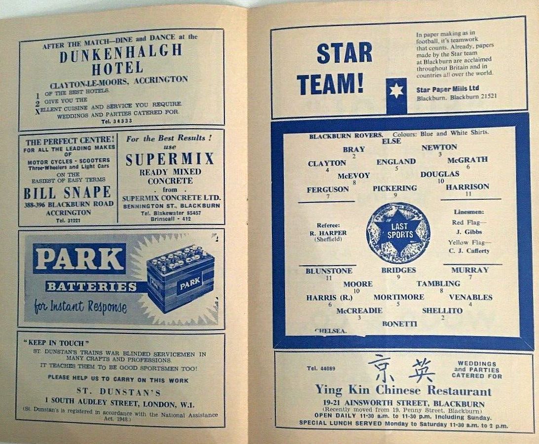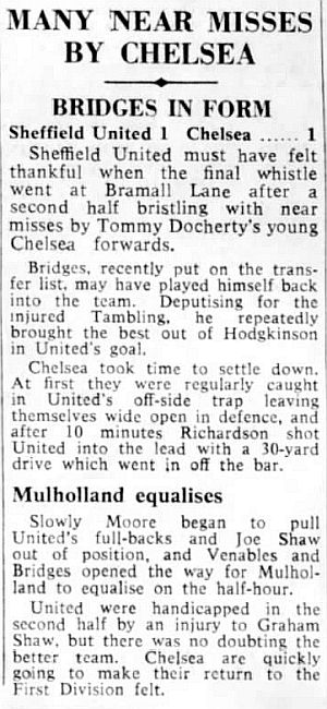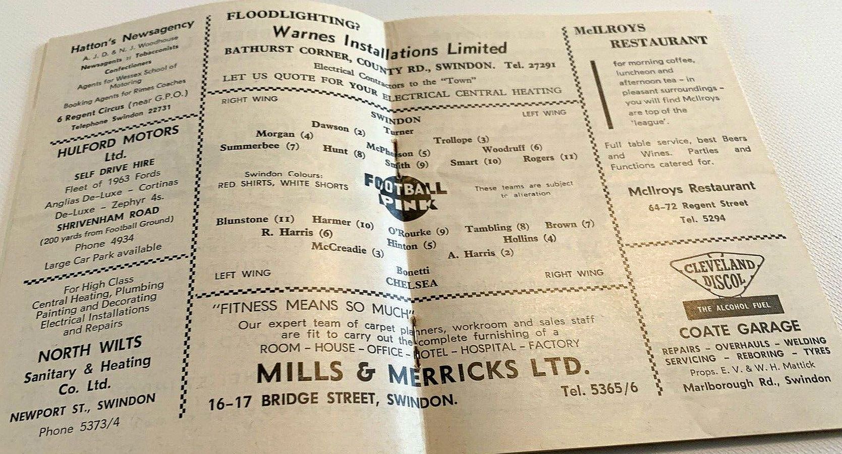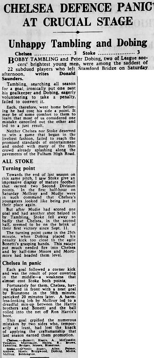 1 John Dunn, 2 Marvin Hinton, 3 Allan Harris, 4 Ron Harris, 5 John Mortimore, 6 Frank Upton, 7 Bert Murray, 8 Bobby Tambling, 9 Barry Bridges, 10 Tommy Harmer, 11 Frank Blunstone |