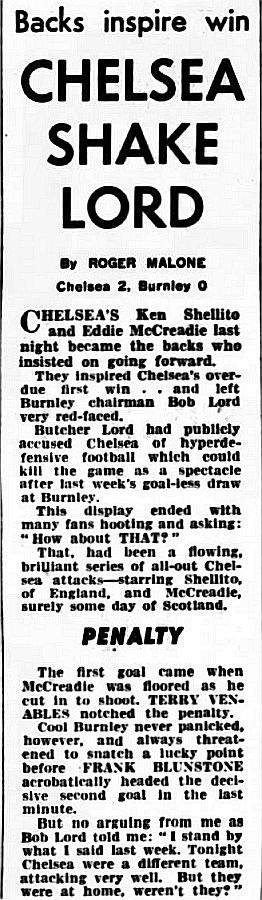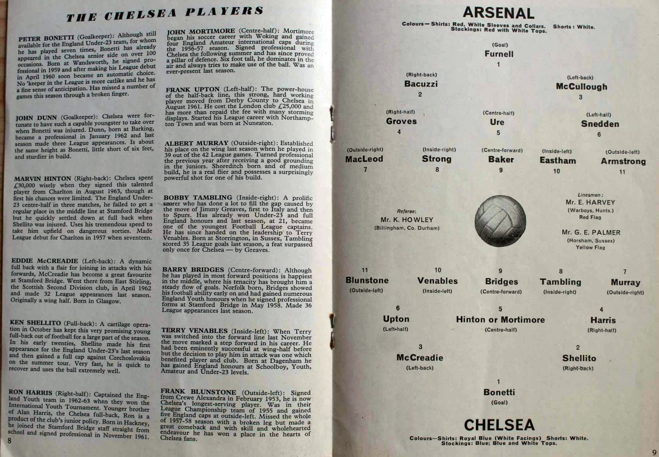 1 Errol McNally, 2 Ken Shellito, 3 Eddie McCreadie, 4 Terry Venables, 5 John Mortimore, 6 Ron Harris, 7 Bert Murray, 8 Bobby Tambling, 9 Barry Bridges, 10 Graham Moore, 11 Frank Blunstone |