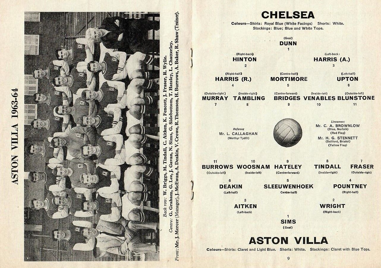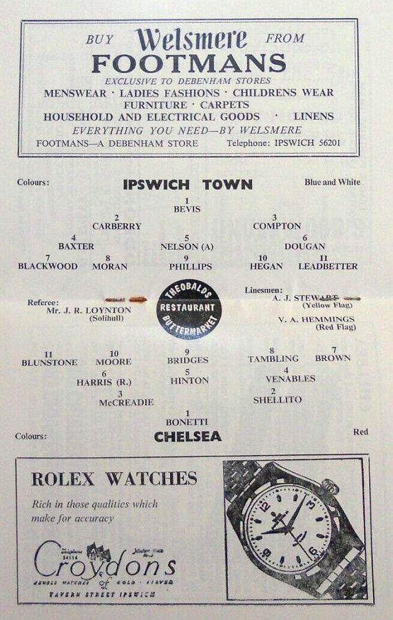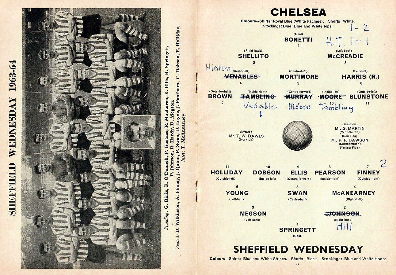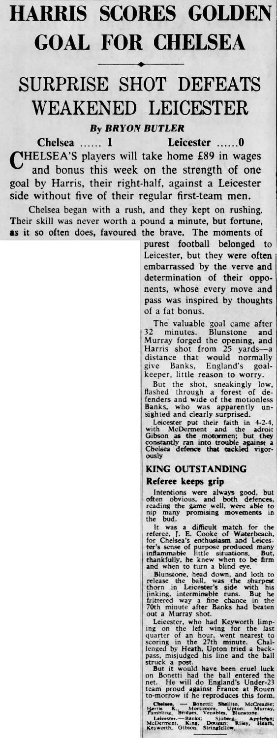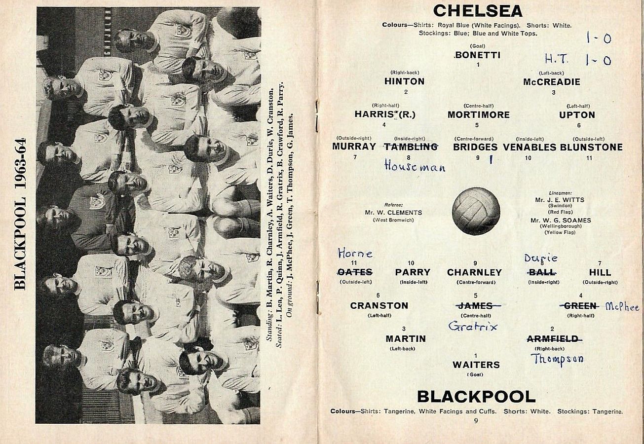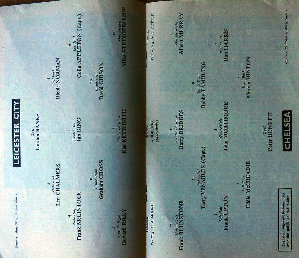 1 Peter Bonetti, 2 Marvin Hinton, 3 Allan Harris, 4 John Hollins, 5 John Mortimore, 6 Ron Harris, 7 Bert Murray, 8 Peter Houseman, 9 Jimmy Mulholland, 10 Terry Venables, 11 Frank Blunstone |