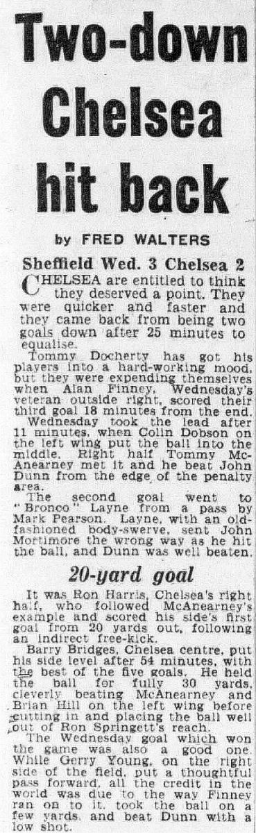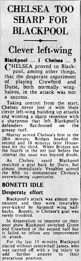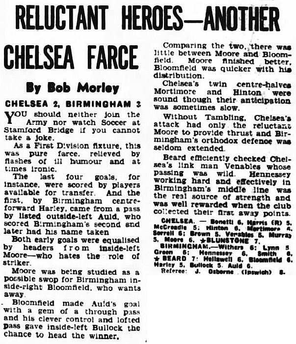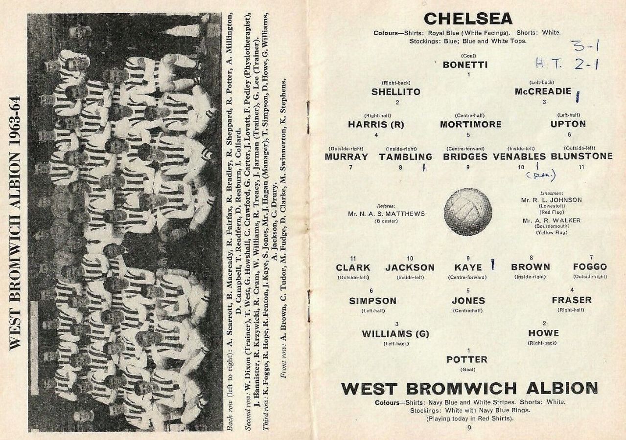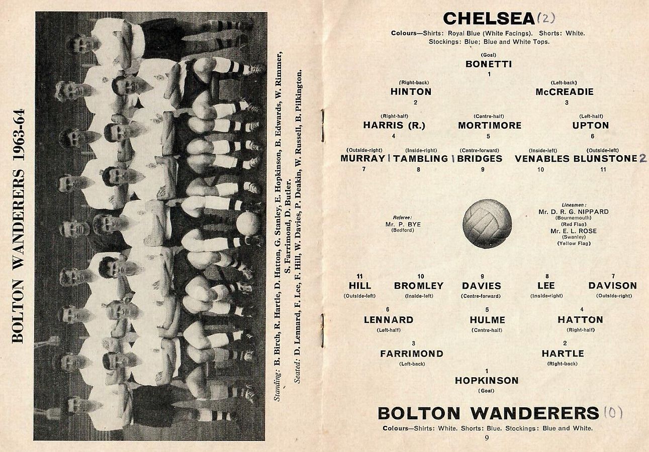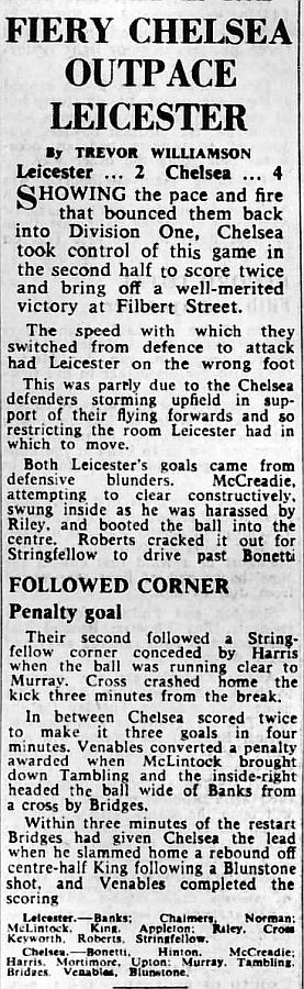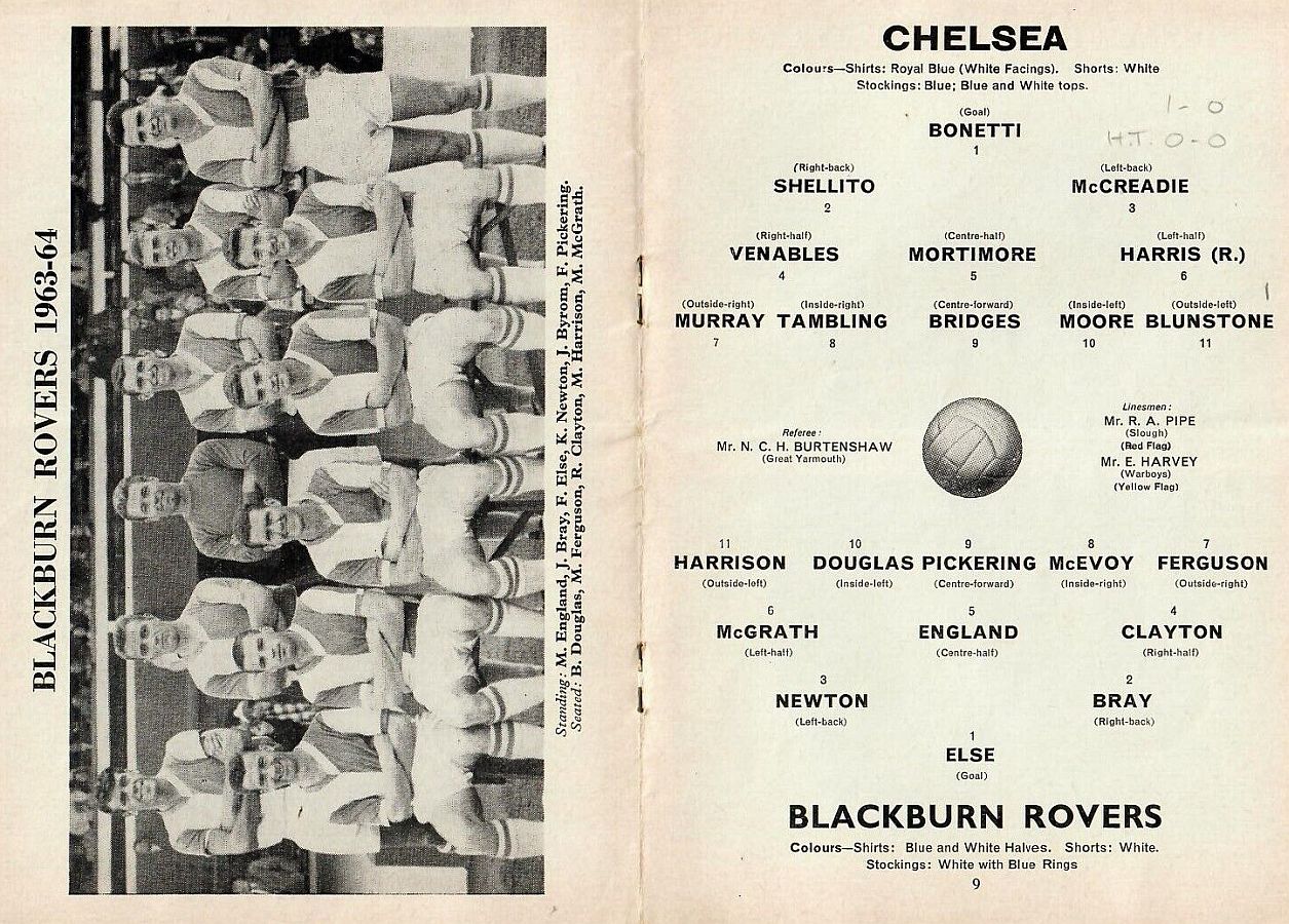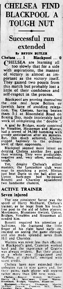 1 Peter Bonetti, 2 Marvin Hinton, 3 Allan Harris, 4 John Hollins, 5 John Mortimore, 6 Ron Harris, 7 Bert Murray, 8 Peter Houseman, 9 Jimmy Mulholland, 10 Terry Venables, 11 Frank Blunstone |