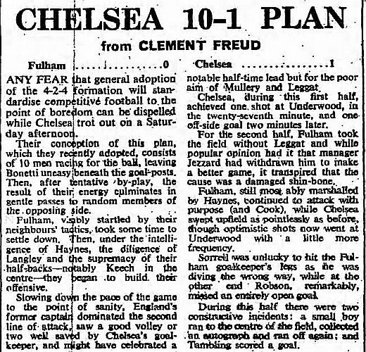 1 Peter Bonetti, 2 Ken Shellito, 3 Eddie McCreadie, 4 Ron Harris, 5 John Mortimore, 6 Frank Upton, 7 Dennis Brown, 8 Bobby Tambling, 9 Barry Bridges, 10 Terry Venables, 11 Frank Blunstone |