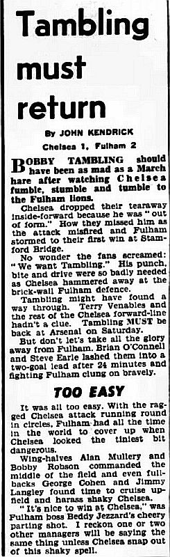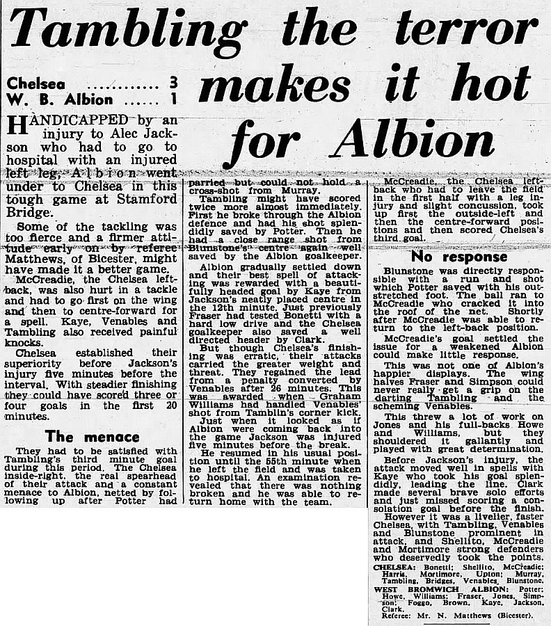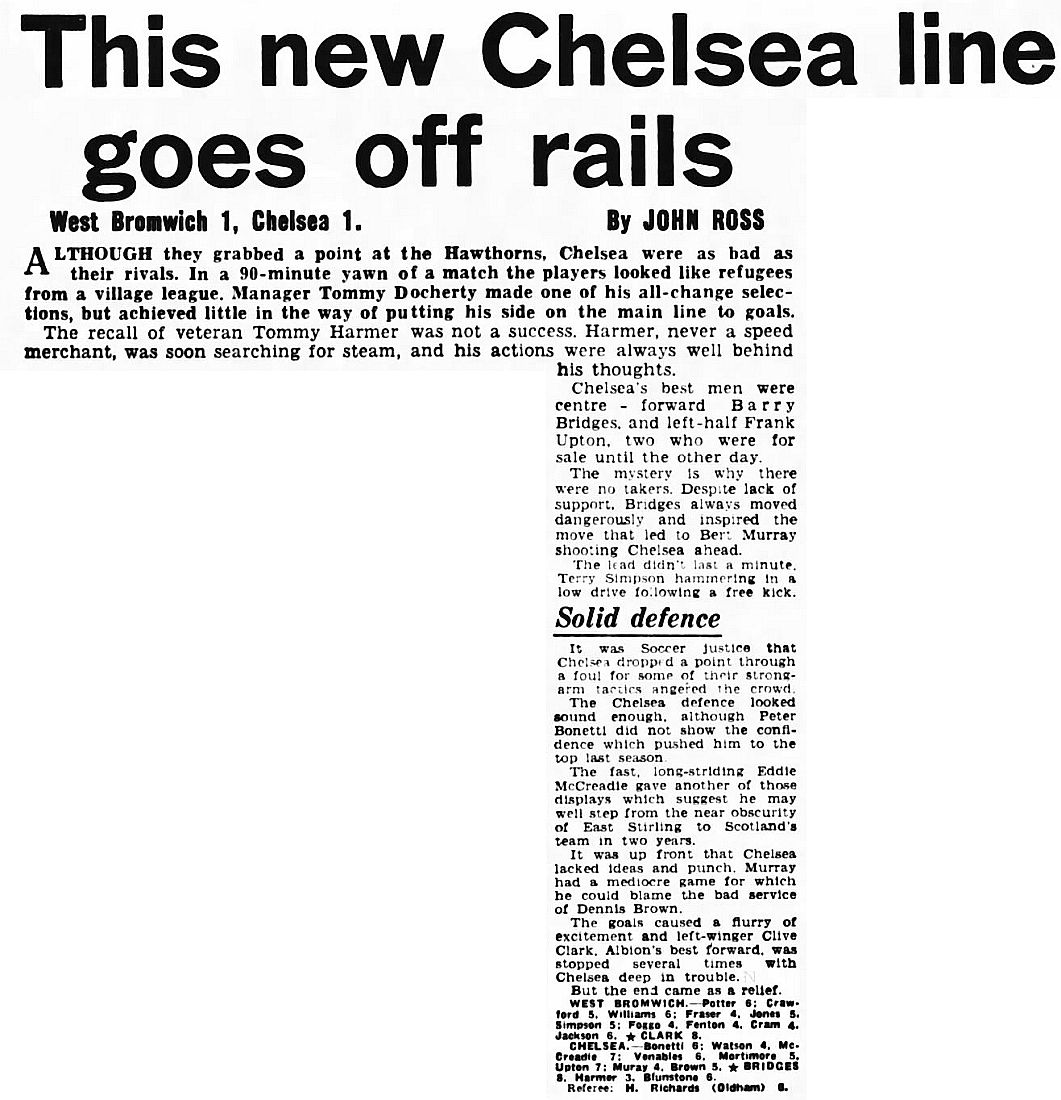 1 Peter Bonetti, 2 Ken Shellito, 3 Eddie McCreadie, 4 Ron Harris, 5 John Mortimore, 6 Frank Upton, 7 Dennis Brown, 8 Bobby Tambling, 9 Barry Bridges, 10 Bert Murray, 11 Frank Blunstone |