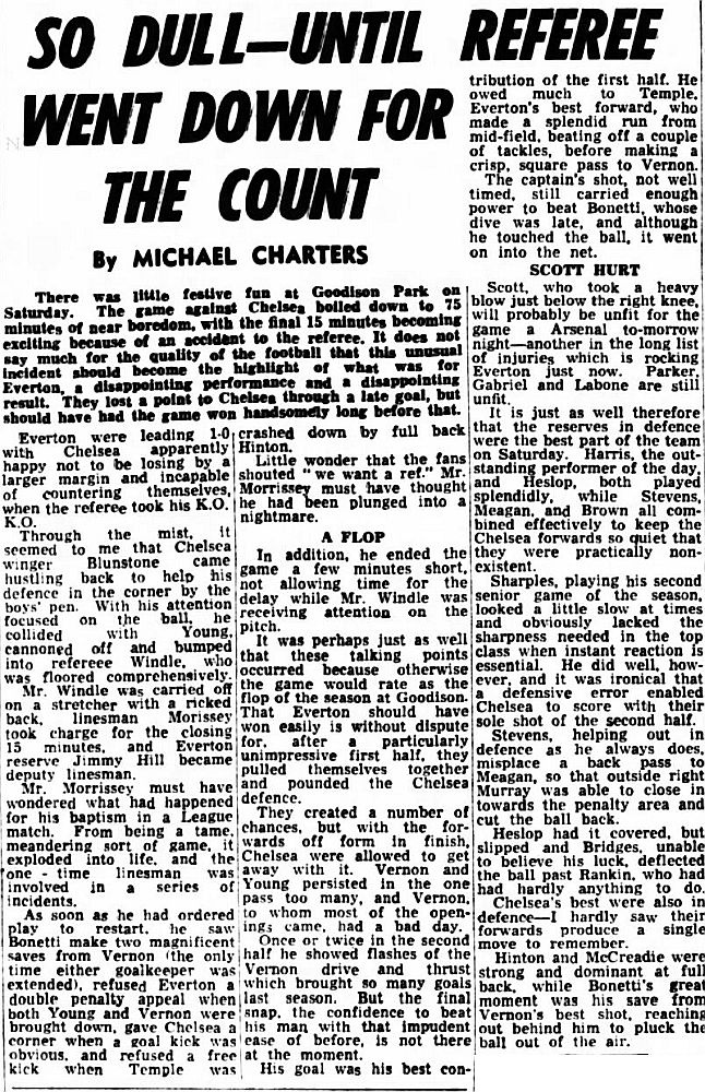 Andy Rankin, Sandy Brown, Mick Meagan, Jimmy Gabriel, Brian Labone, Brian Harris, Alex Scott, Dennis Stevens, Fred Pickering, Roy Vernon, Derek Temple |