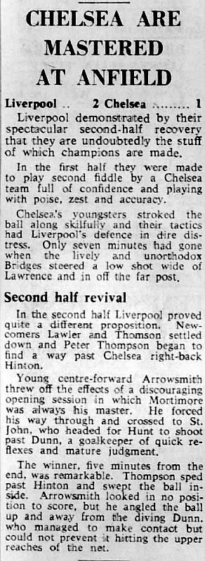Tommy Lawrence, Gerry Byrne, Ronnie Moran, Gordon Milne, Ron Yeats, Phil Ferns, Ian Callaghan, Roger Hunt, Ian St John, Jimmy Melia, Peter Thompson |