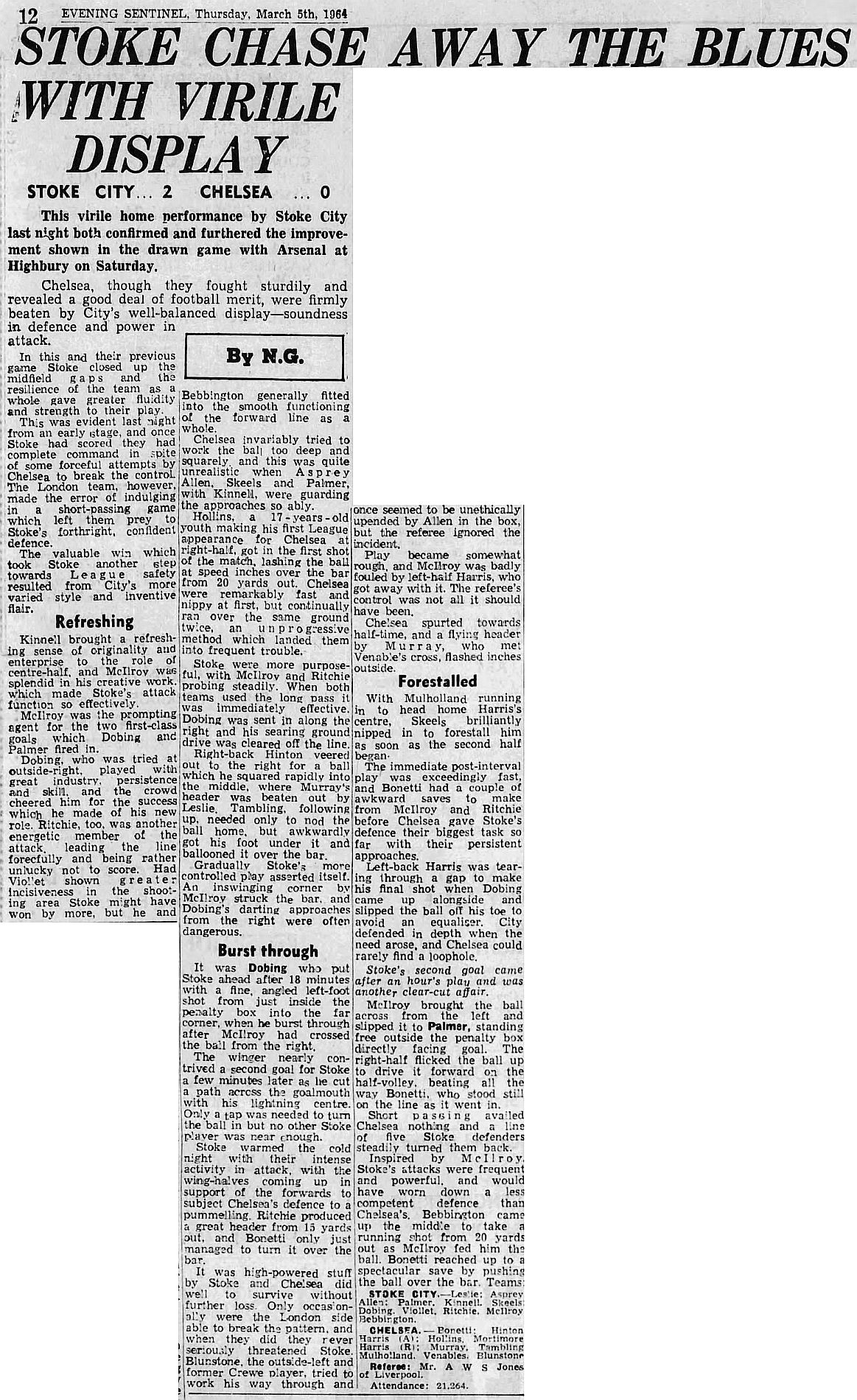 Lawrie Leslie, Bill Asprey, Tony Allen, Calvin Palmer, George Kinnell, Eric Skeels, Peter Dobing, Dennis Viollet, John Ritchie, Jimmy McIlroy, Keith Bebbington |