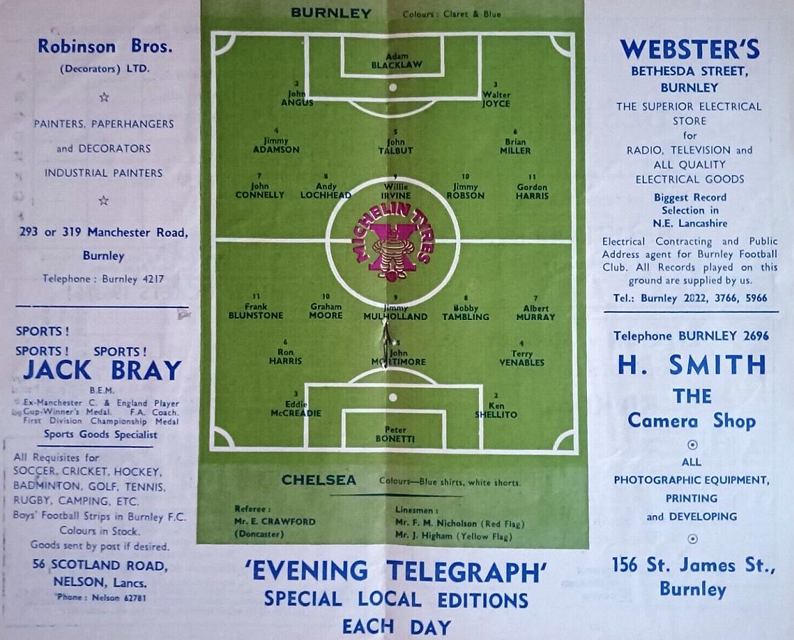 Adam Blacklaw, John Angus, Walter Joyce, Jimmy Adamson, John Talbut, Brian Miller, John Connelly, Andy Lochhead, Ray Pointer, Jimmy Robson, Gordon Harris |