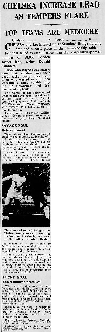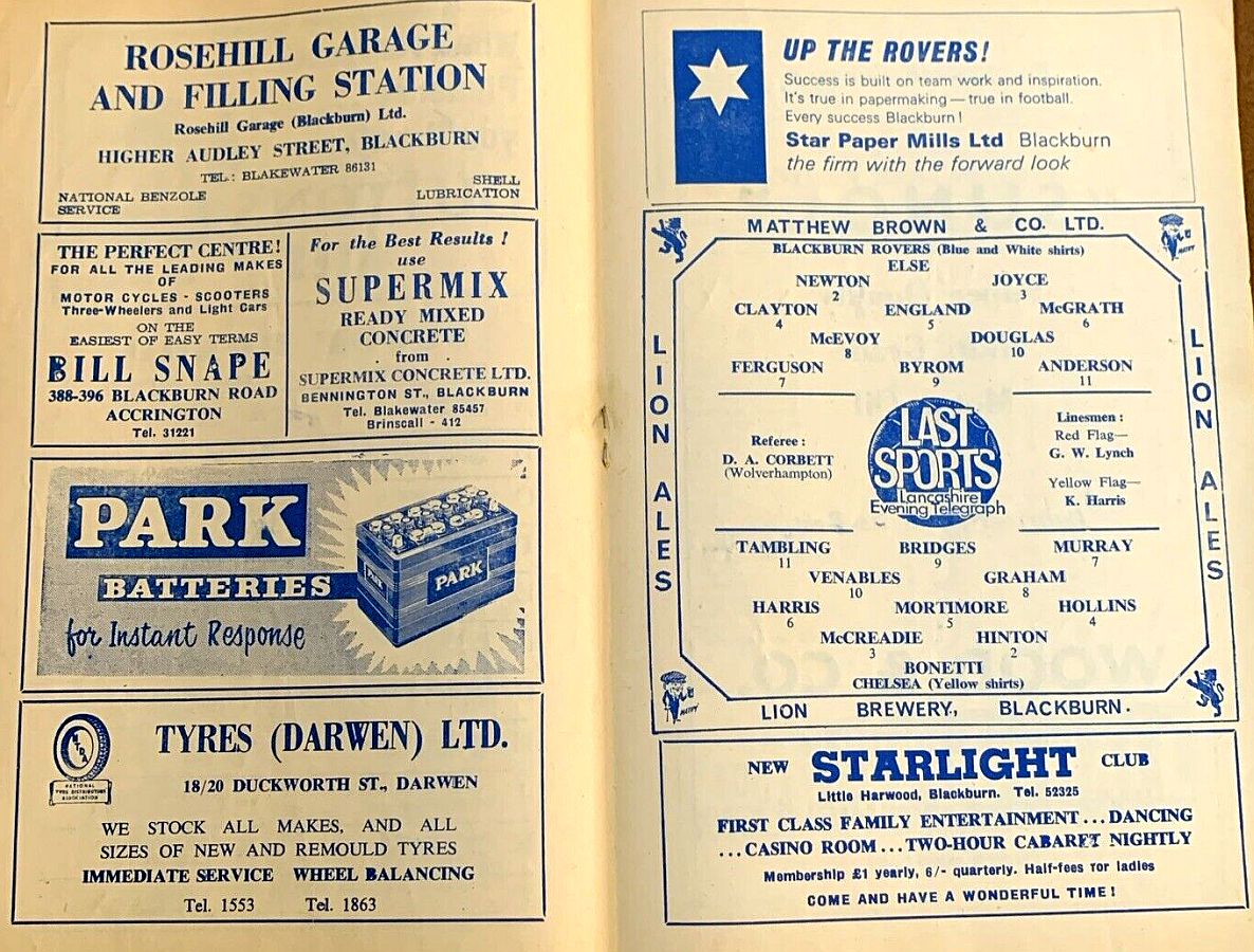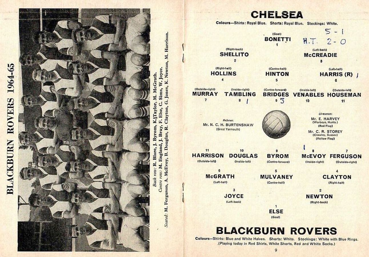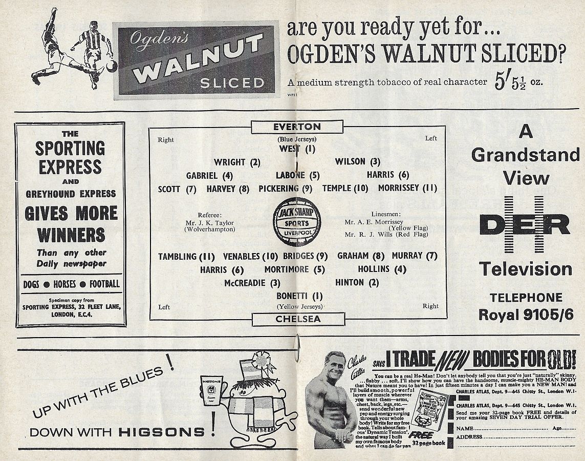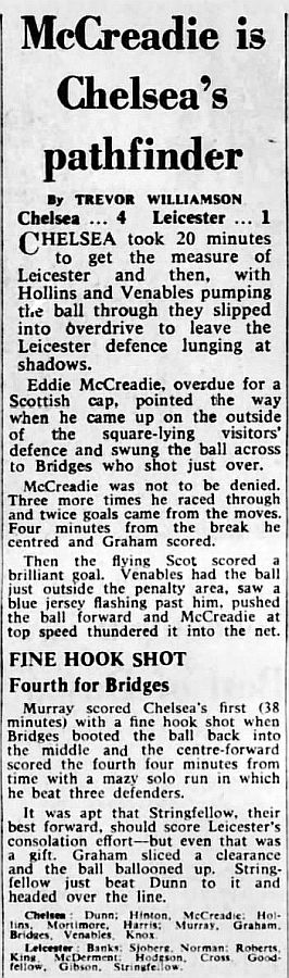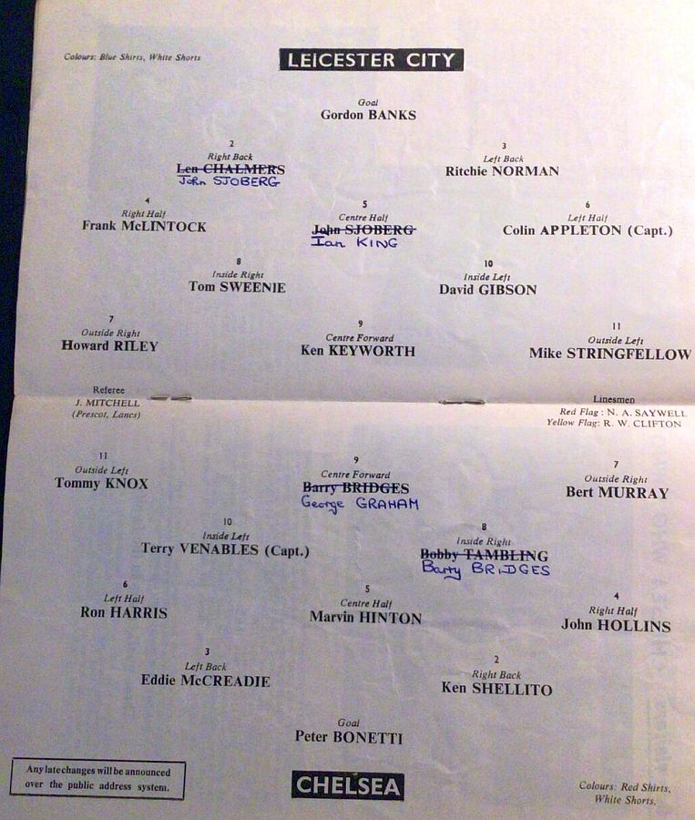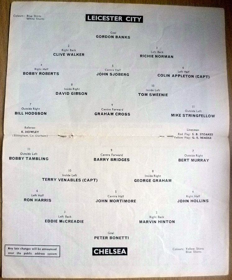 1 Peter Bonetti, 2 Ian Watson, 3 Eddie McCreadie, 4 John Hollins, 5 Marvin Hinton, 6 Ron Harris, 7 Bert Murray, 8 Bobby Tambling, 9 Barry Bridges, 10 Terry Venables, 11 Tommy Knox |