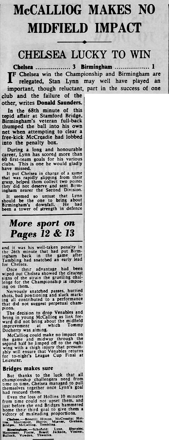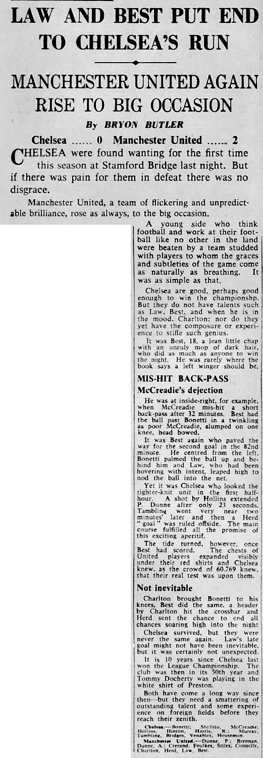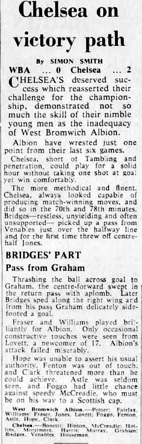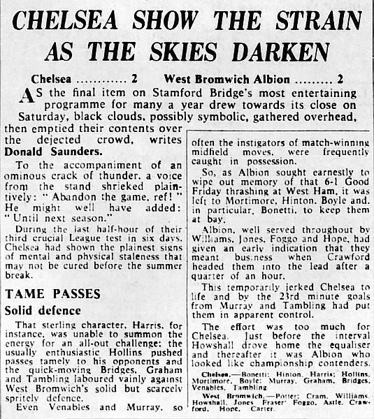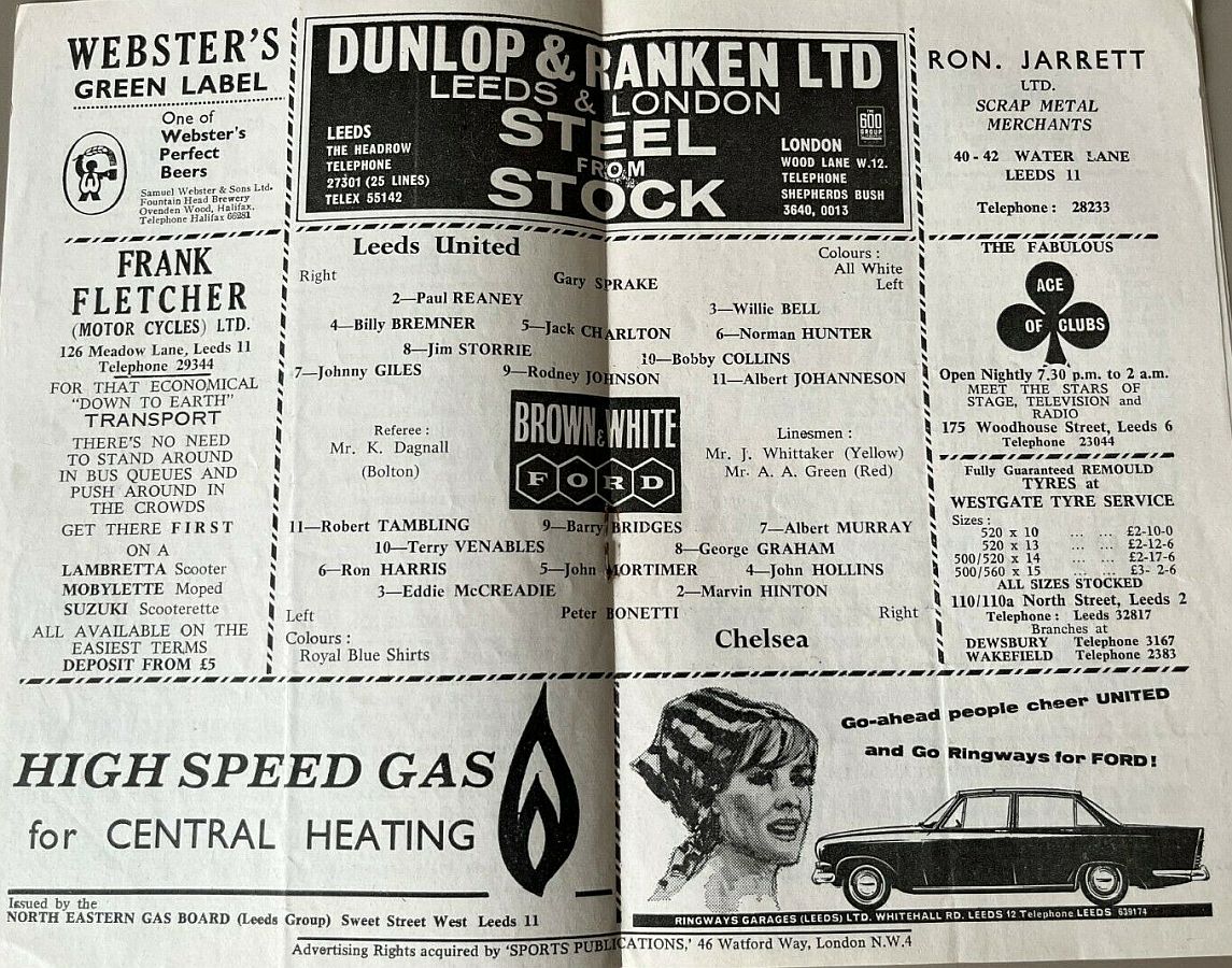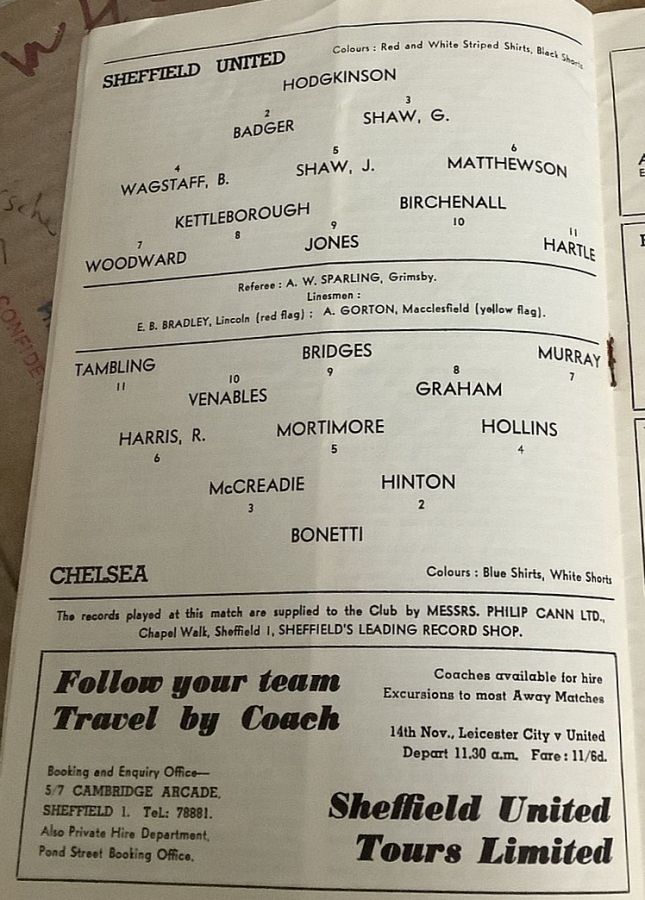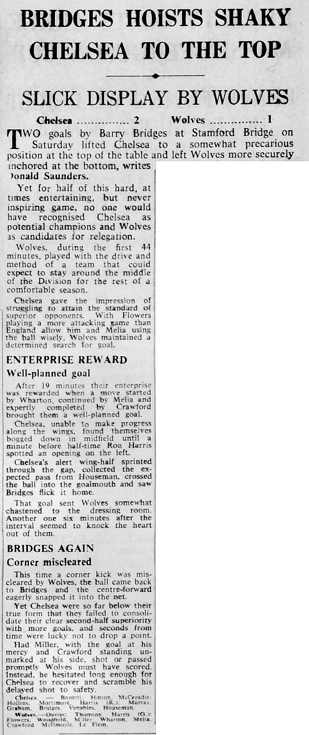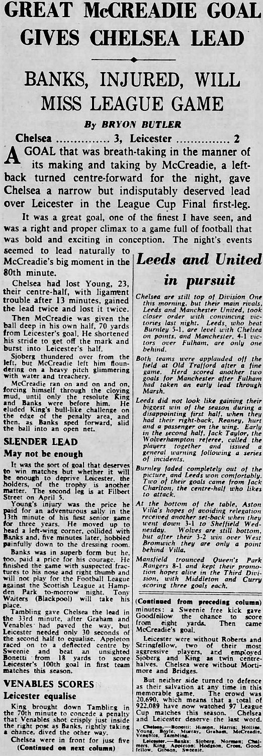 1 Peter Bonetti, 2 Ian Watson, 3 Eddie McCreadie, 4 John Hollins, 5 Marvin Hinton, 6 Ron Harris, 7 Bert Murray, 8 Bobby Tambling, 9 Barry Bridges, 10 Terry Venables, 11 Tommy Knox |