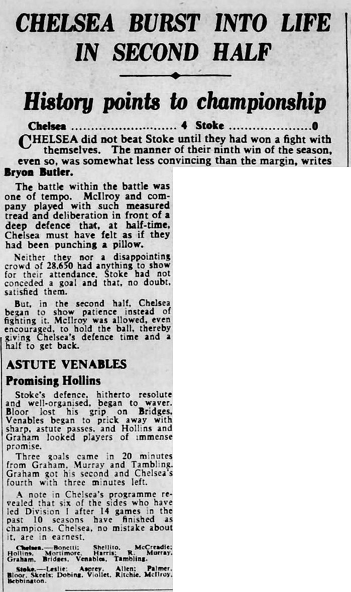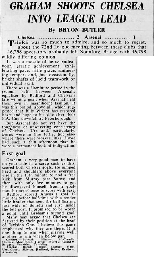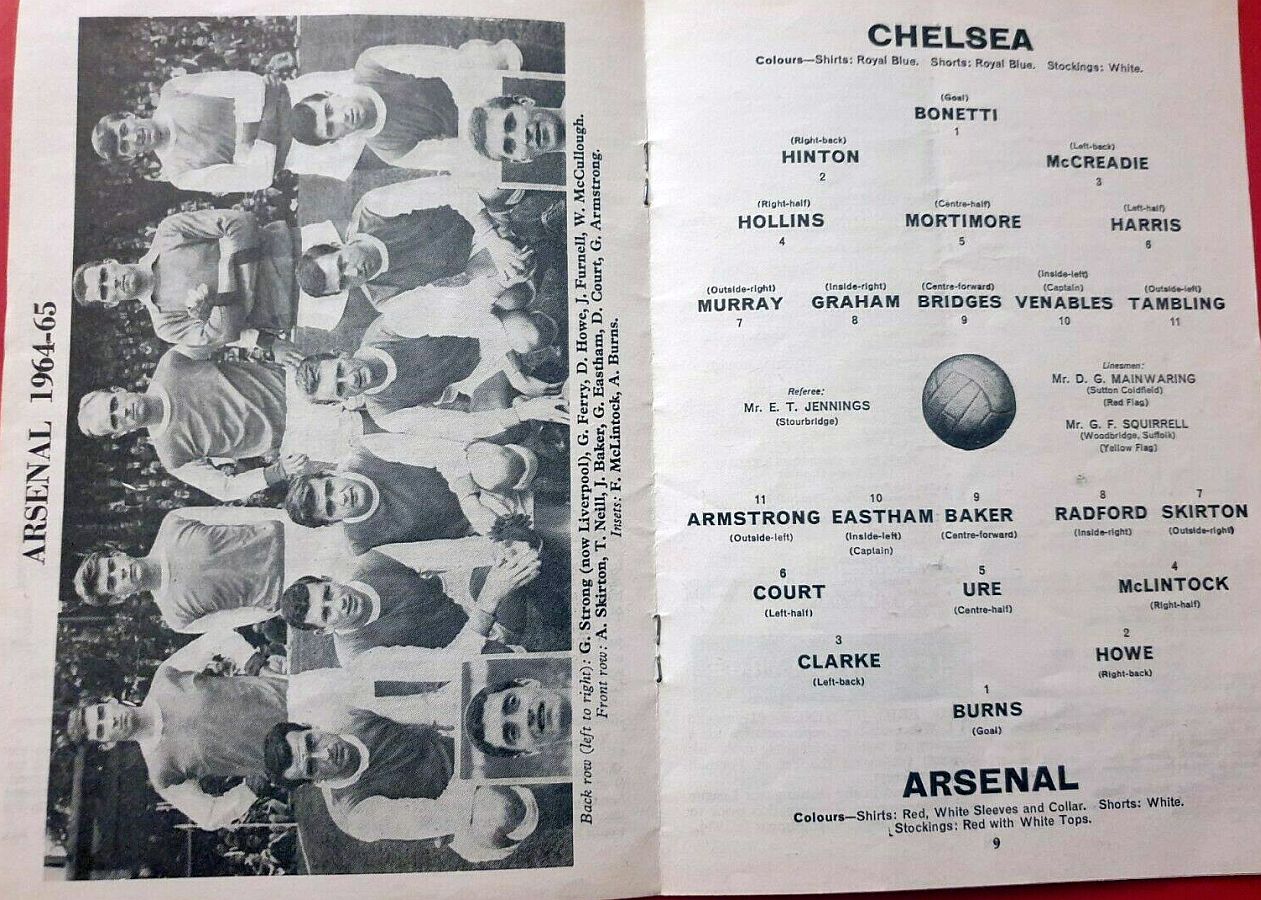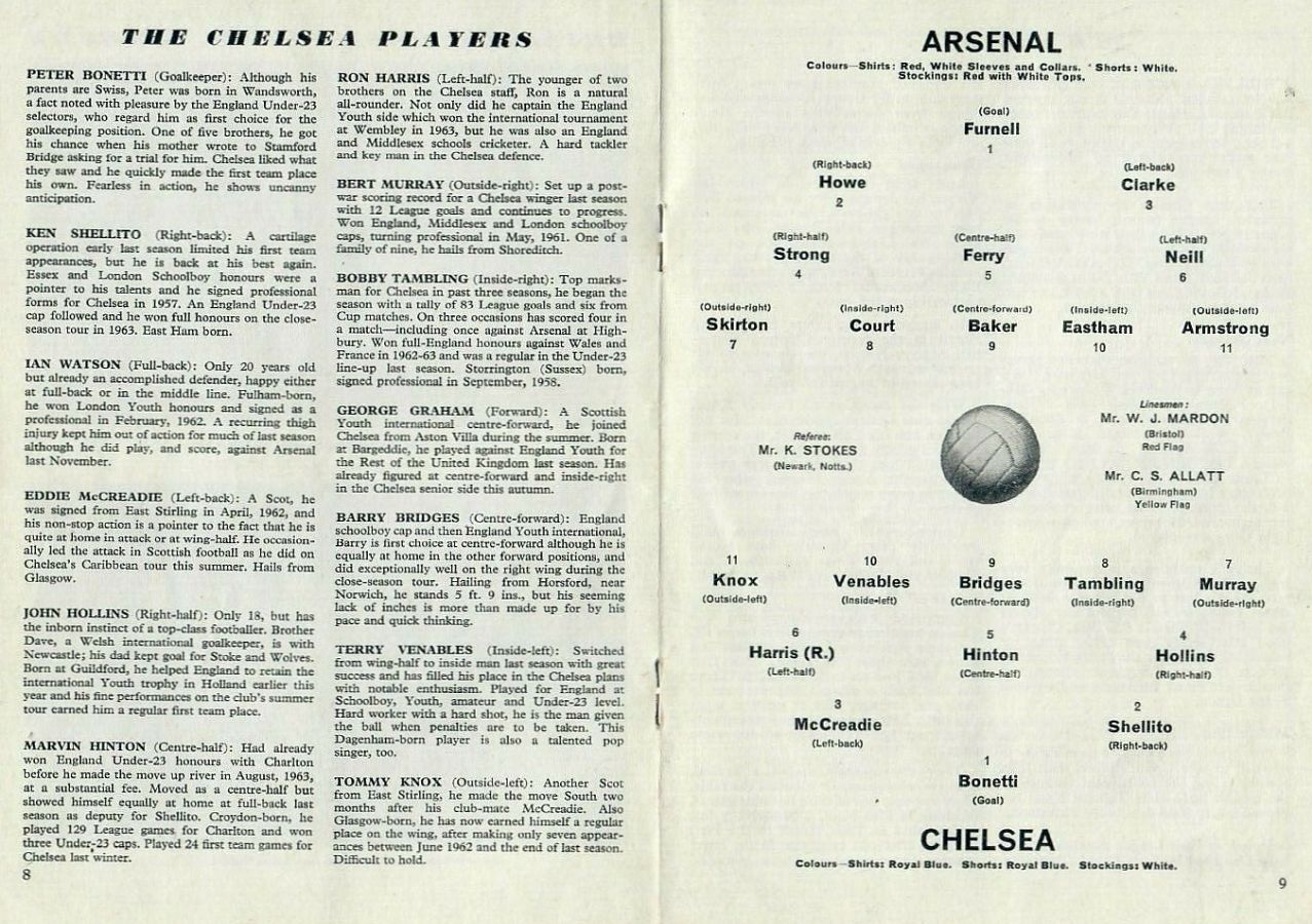 1 Peter Bonetti, 2 Ken Shellito, 3 Eddie McCreadie, 4 John Hollins, 5 Marvin Hinton, 6 Ron Harris, 7 Bert Murray, 8 George Graham, 9 Barry Bridges, 10 Terry Venables, 11 Tommy Knox |