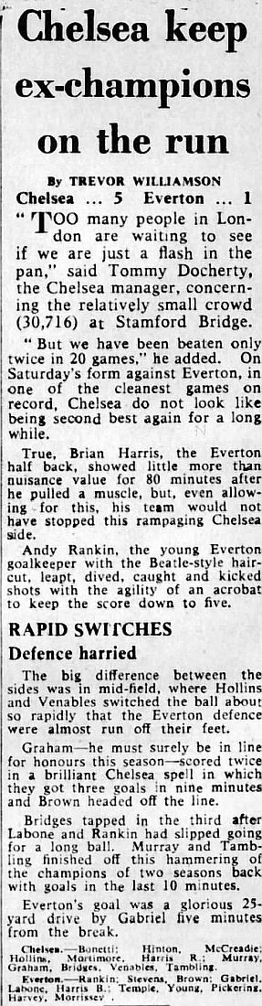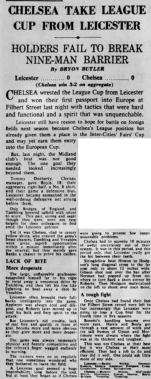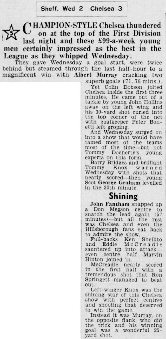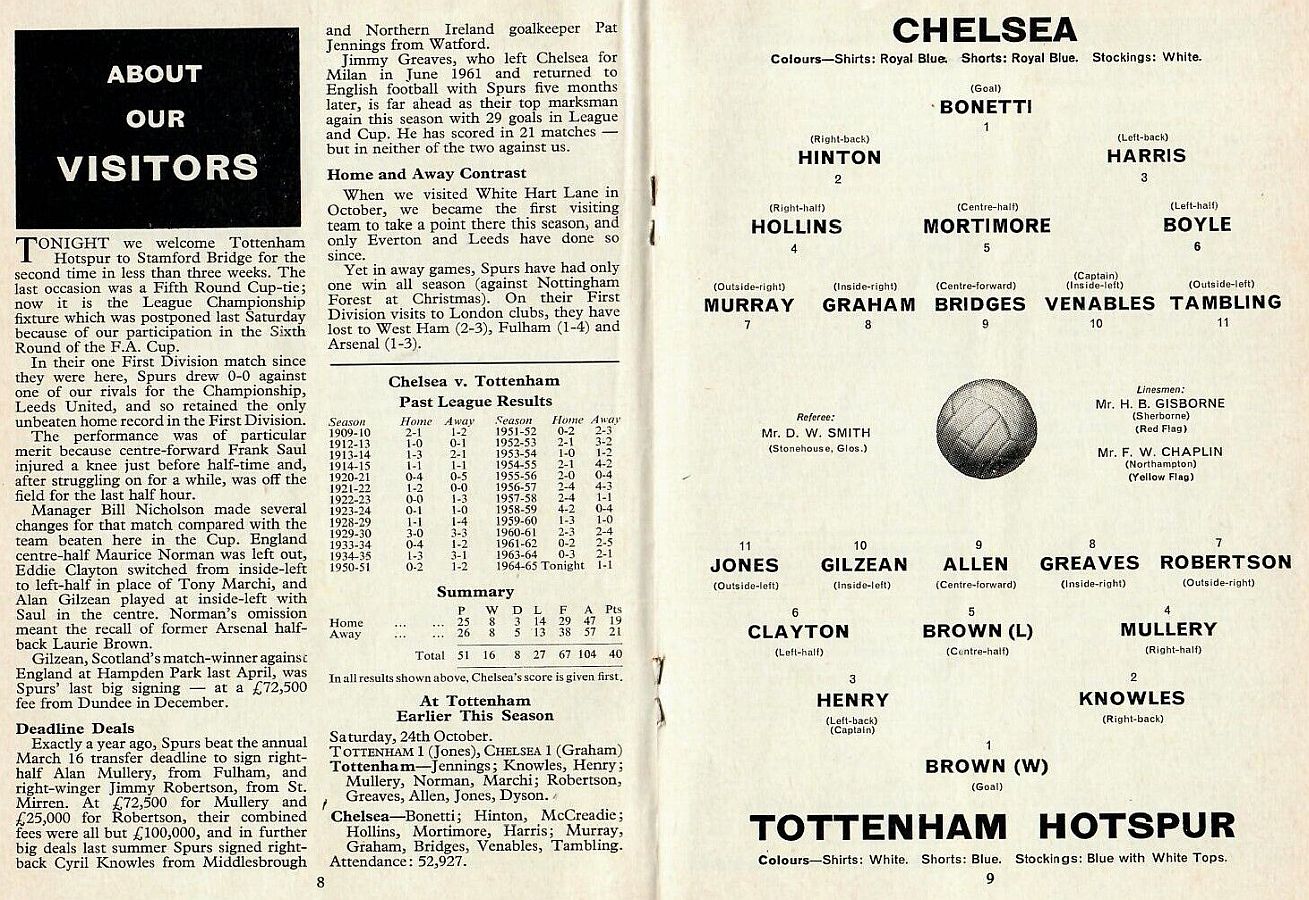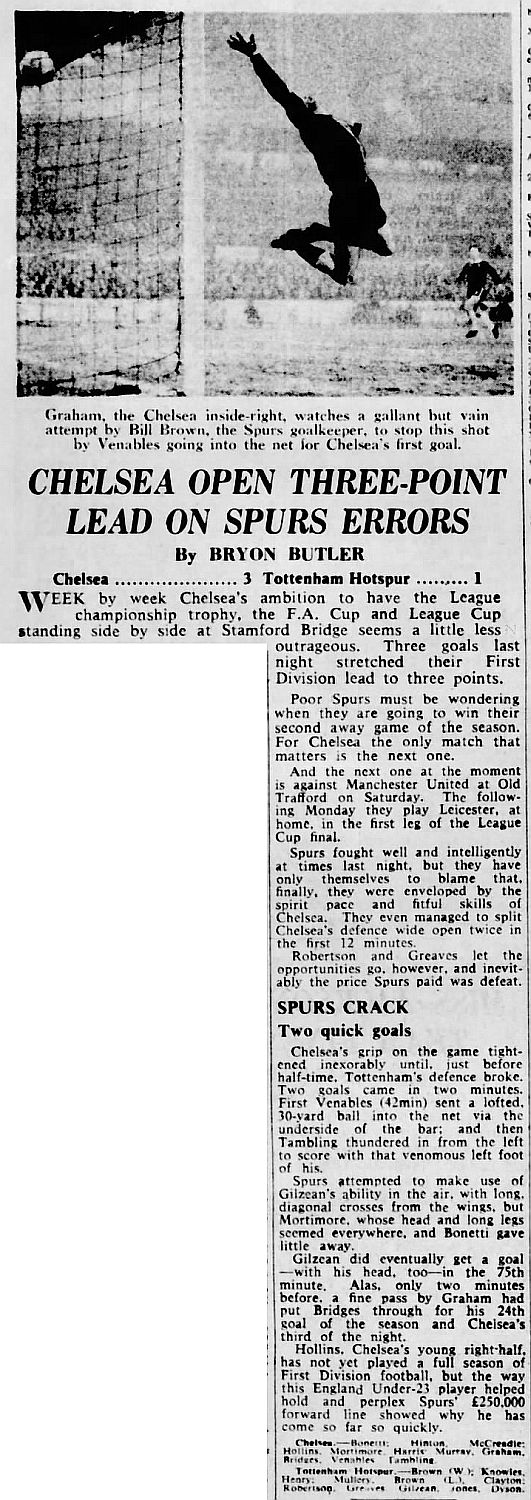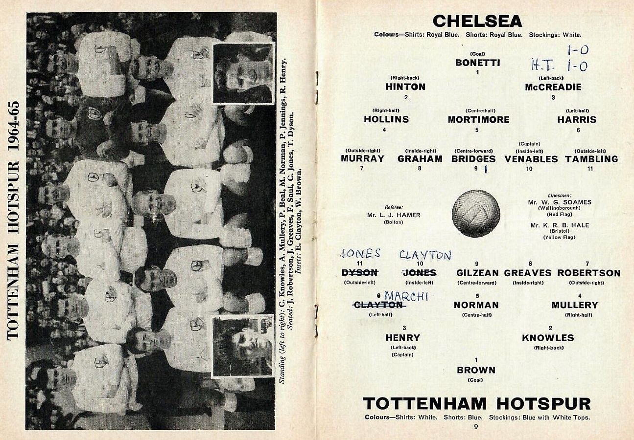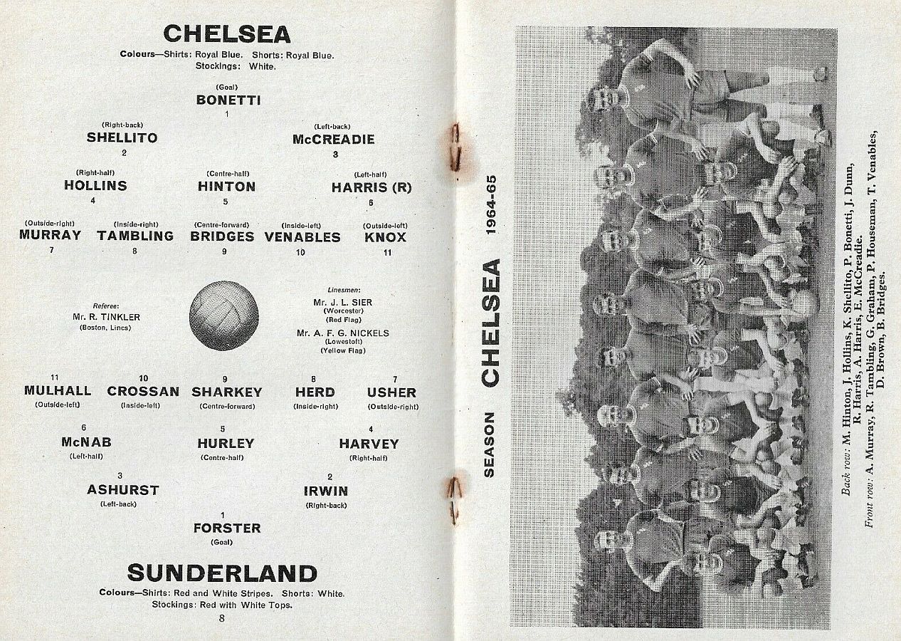 1 Peter Bonetti, 2 Ken Shellito, 3 Eddie McCreadie, 4 John Hollins, 5 Marvin Hinton, 6 Ron Harris, 7 Bert Murray, 8 Bobby Tambling, 9 Barry Bridges, 10 Terry Venables, 11 Tommy Knox |