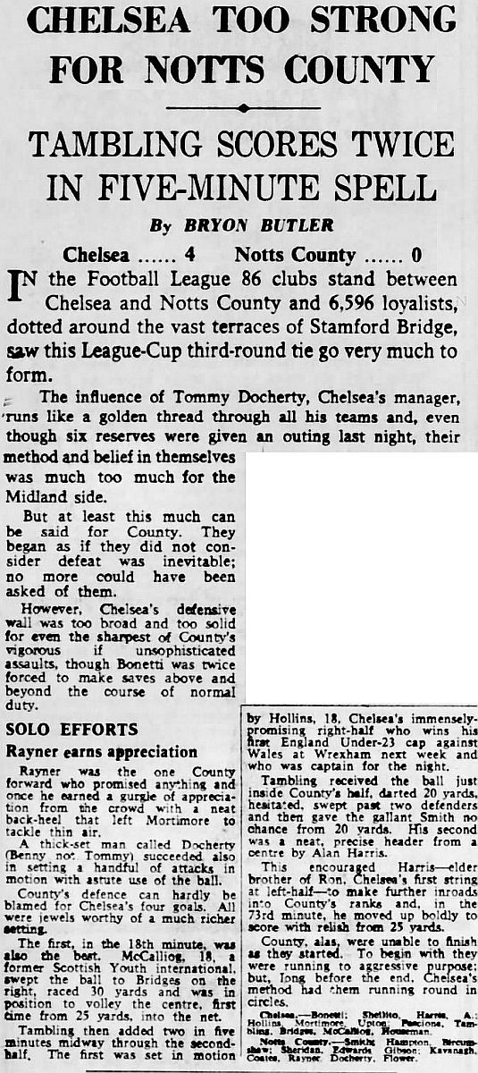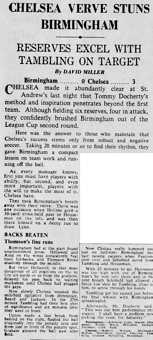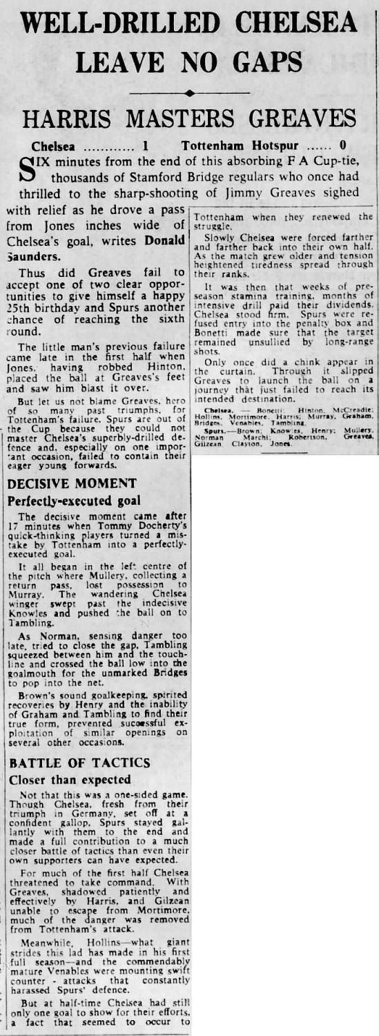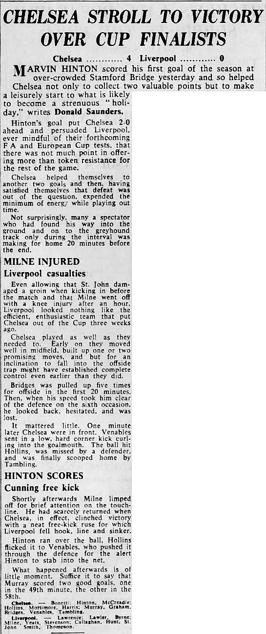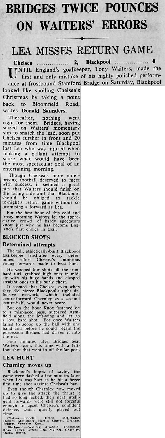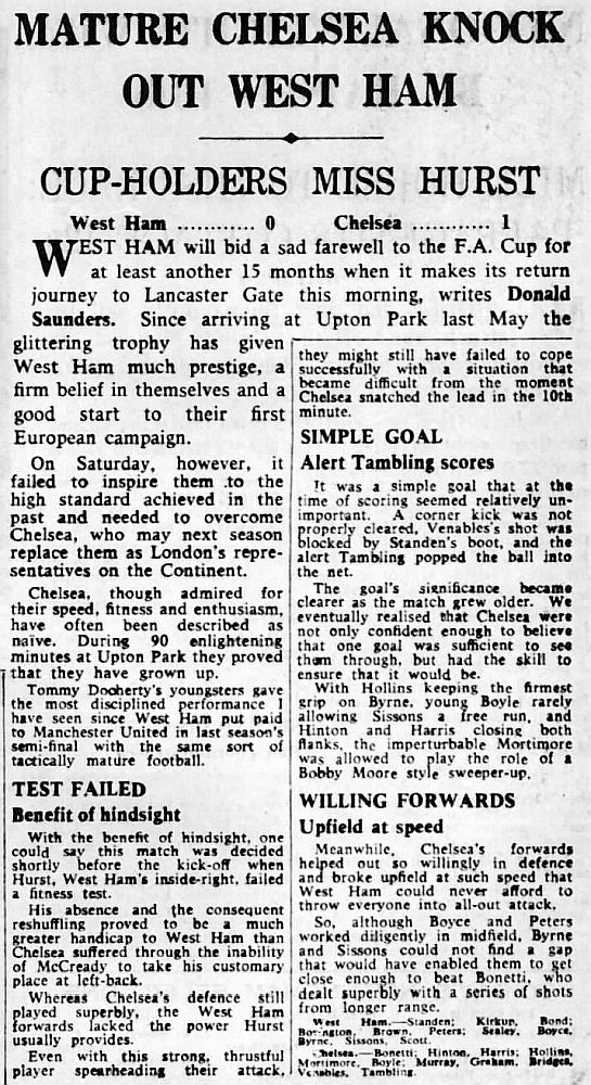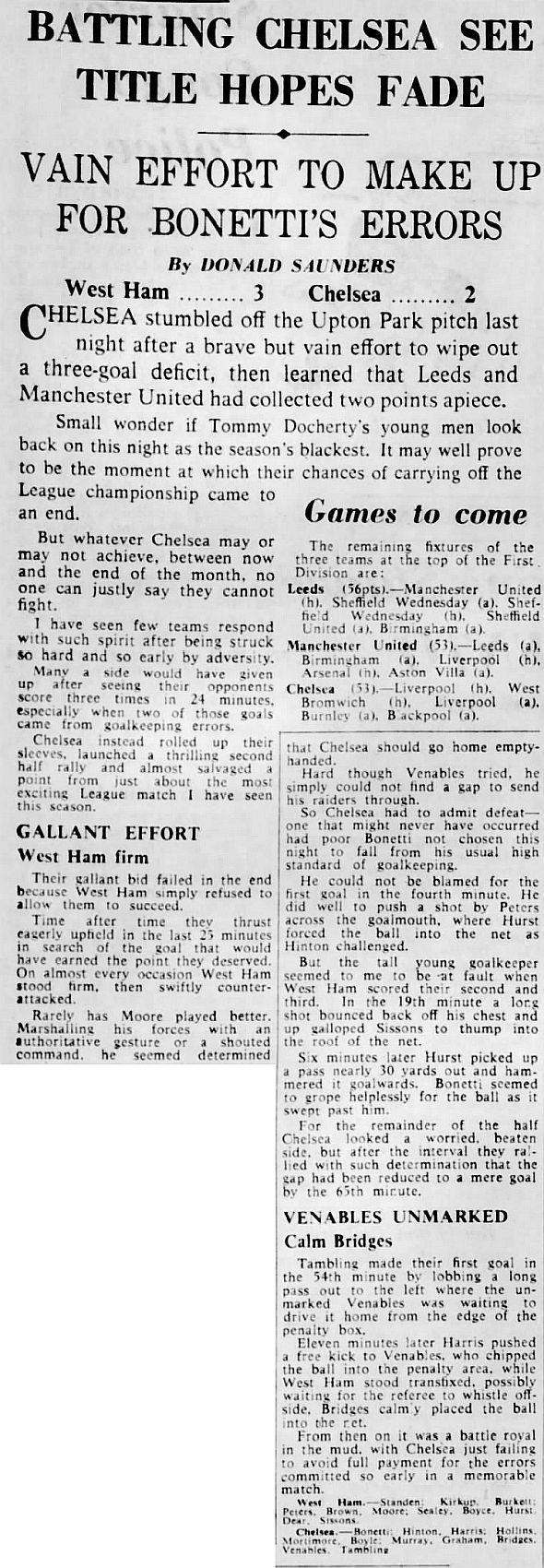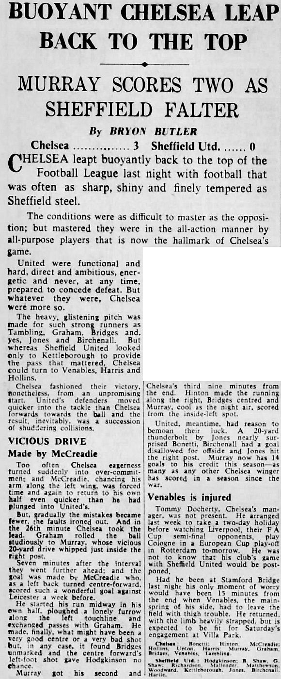 1 Peter Bonetti, 2 Ken Shellito, 3 Eddie McCreadie, 4 John Hollins, 5 Marvin Hinton, 6 Ron Harris, 7 Bert Murray, 8 Bobby Tambling, 9 Barry Bridges, 10 Terry Venables, 11 Tommy Knox |