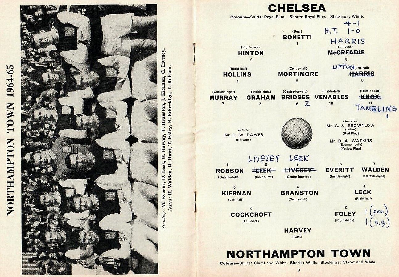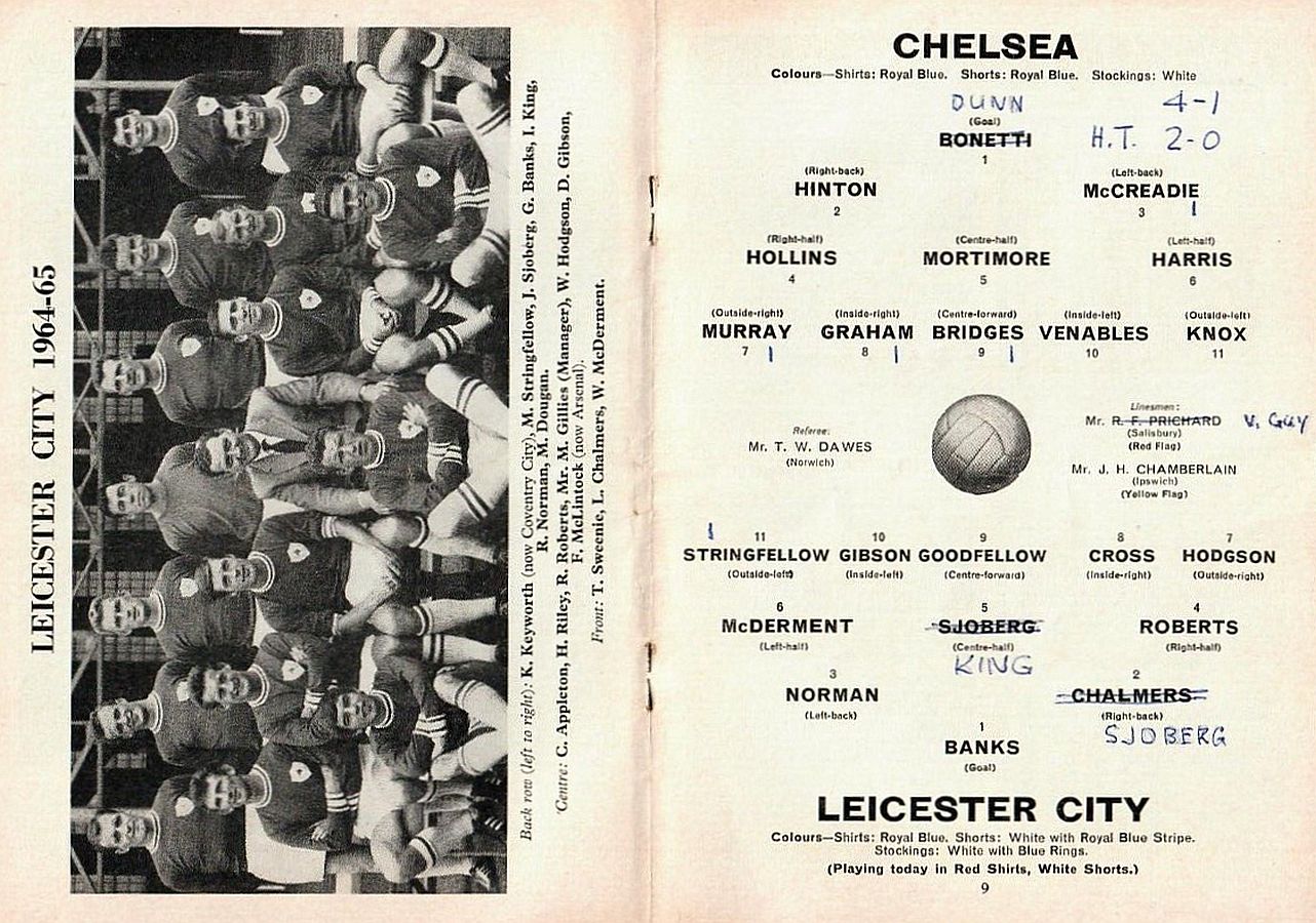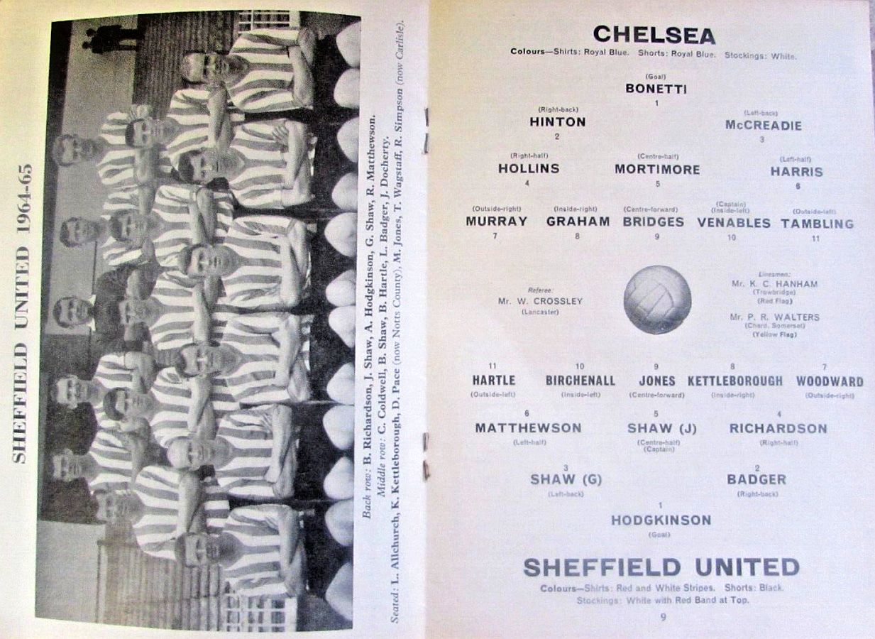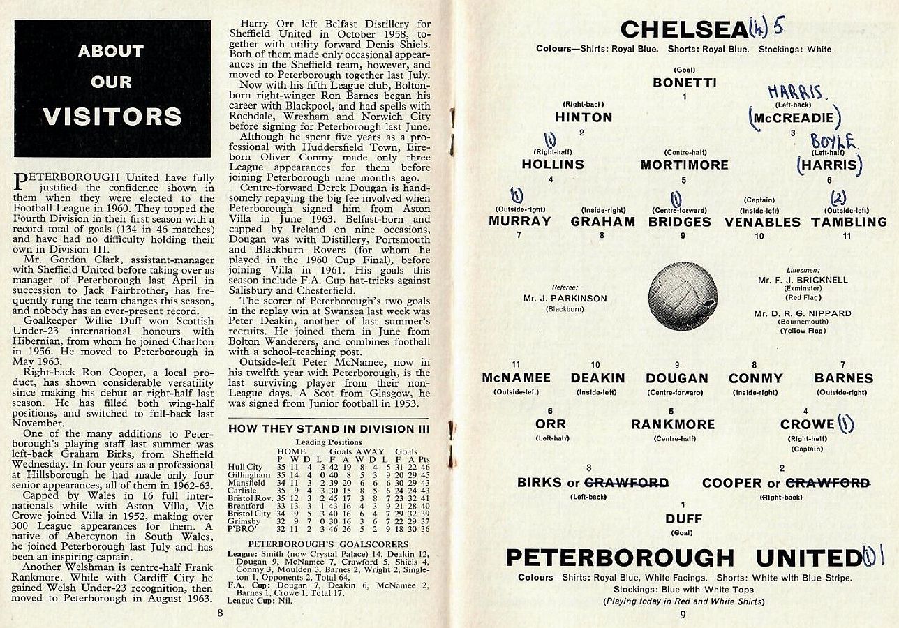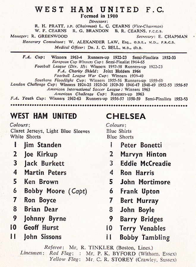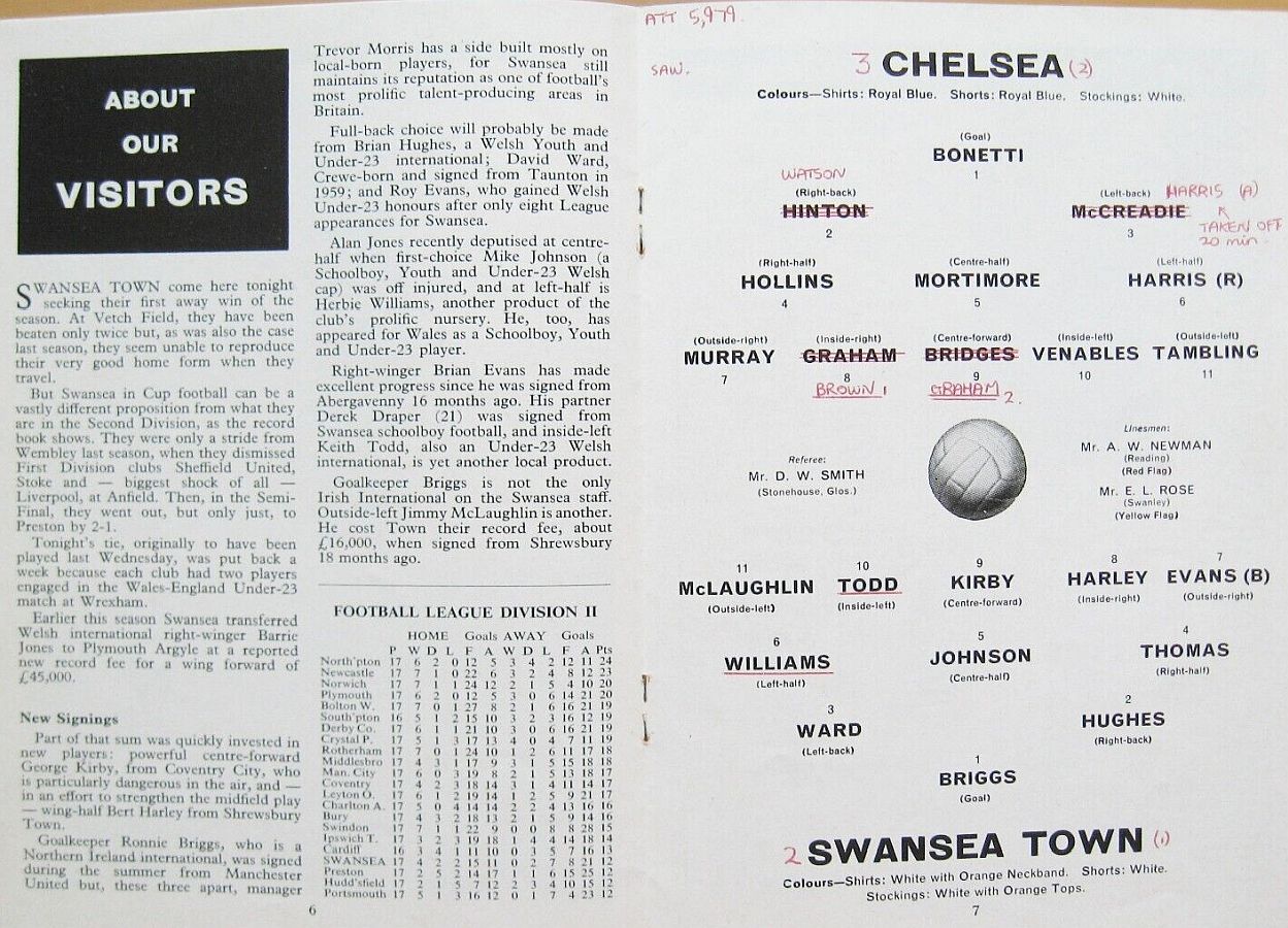 1 Peter Bonetti, 2 Ken Shellito, 3 Ron Harris, 4 William Sinclair, 5 John Mortimore, 6 John Boyle, 7 James Smart, 8 Bobby Tambling, 9 Frank Upton, 10 Jimmy McCalliog, 11 Peter Houseman |