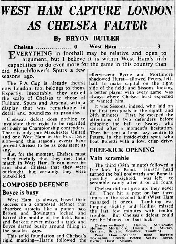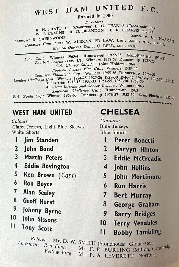 Jim Standen, Joe Kirkup, Jack Burkett, Martin Peters, Ken Brown, Bobby Moore, Alan Sealey, Ronnie Boyce, Geoff Hurst, Brian Dear, John Sissons |