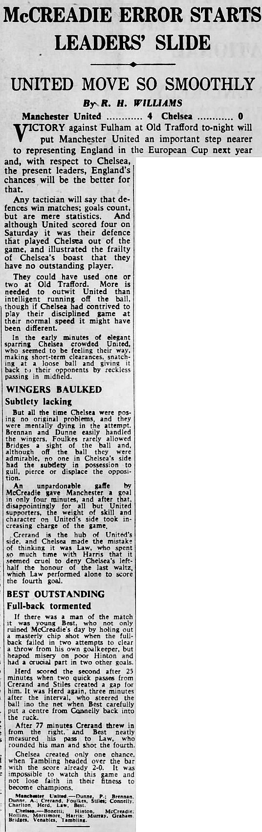 George Best 3, David Herd 23, David Herd 49, Denis Law 75 |