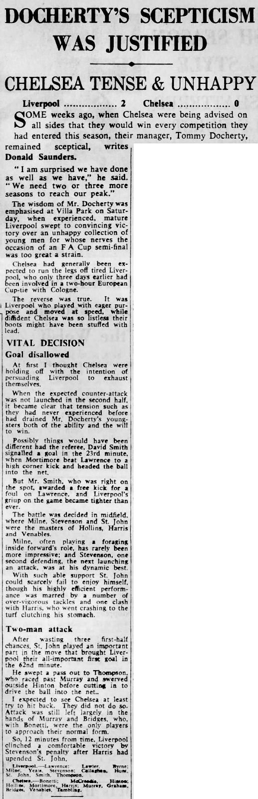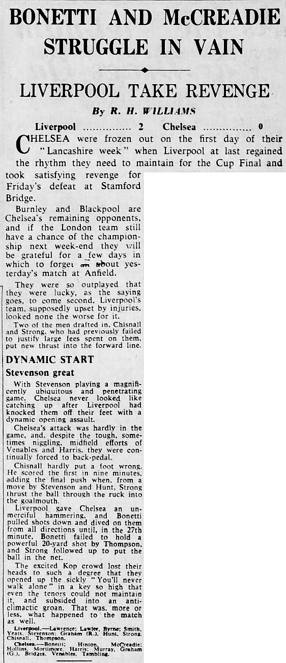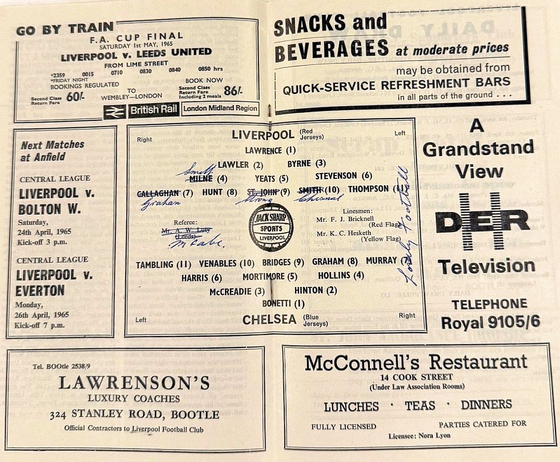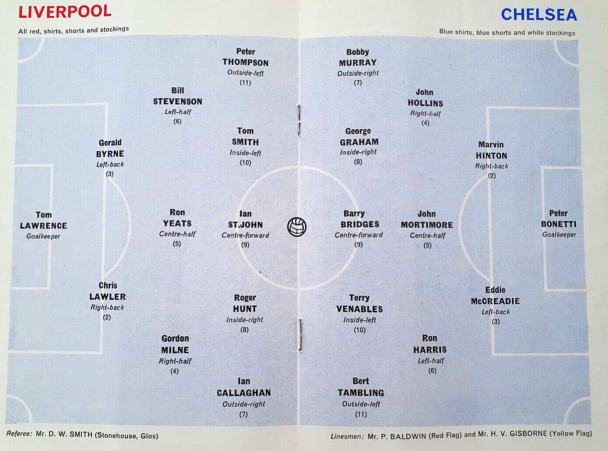 Tommy Lawrence, Chris Lawler, Gerry Byrne, Geoff Strong, Ron Yeats, Willie Stevenson, Bobby Graham, Roger Hunt, Phil Chisnall, Tommy Smith, Peter Thompson |