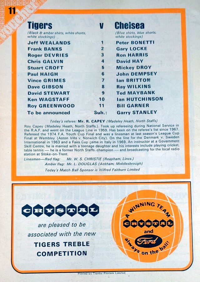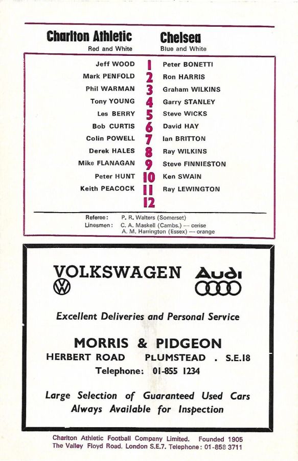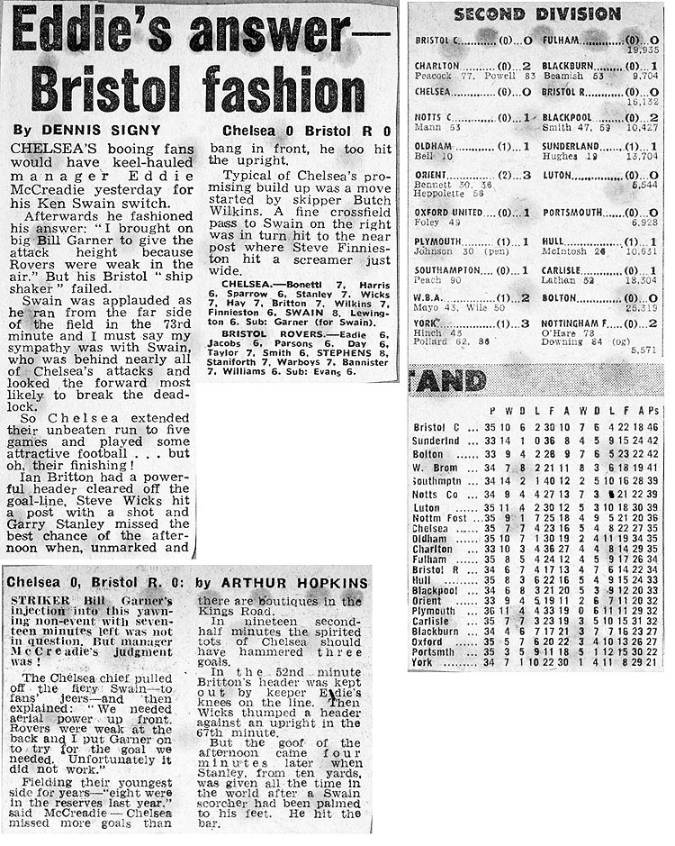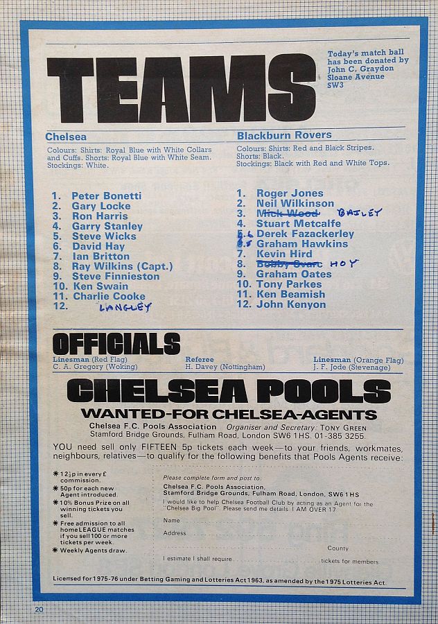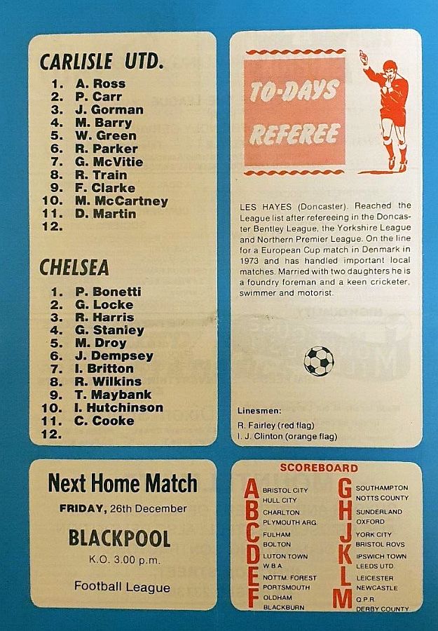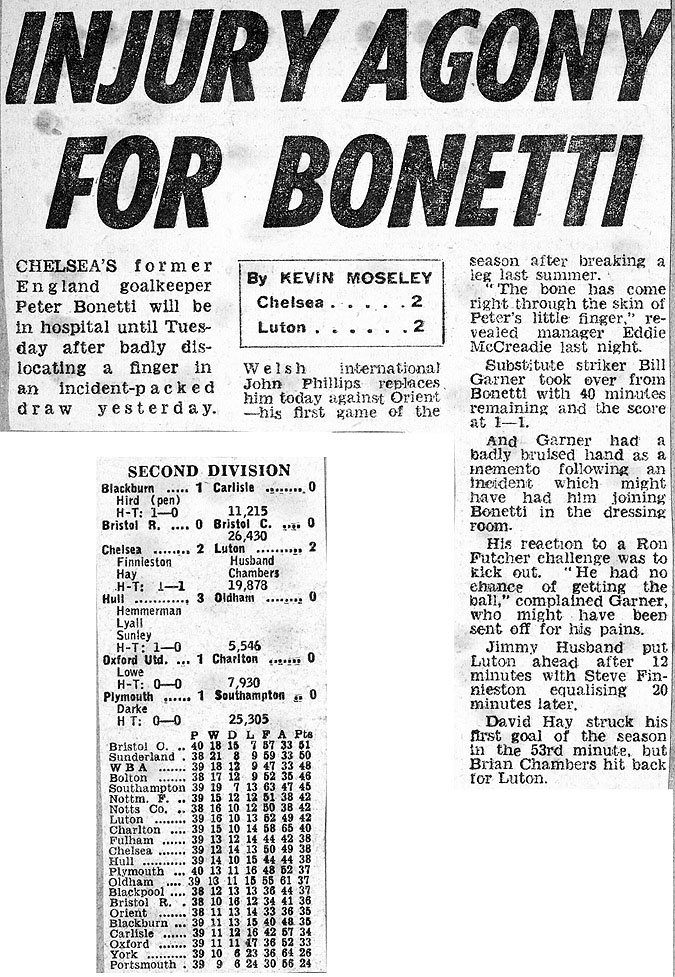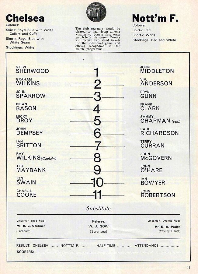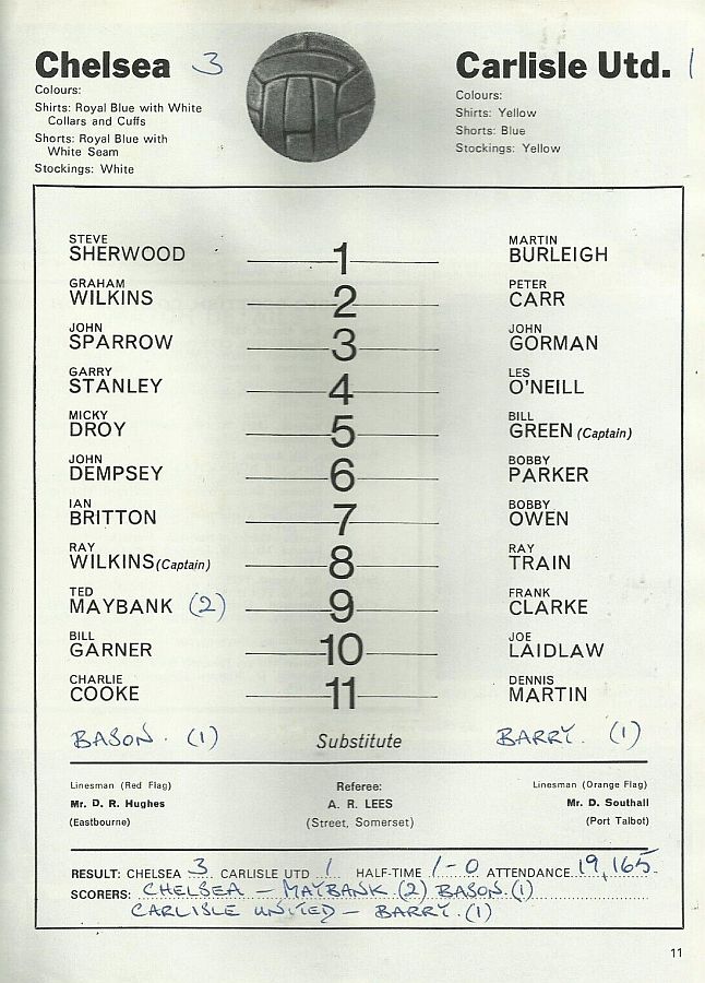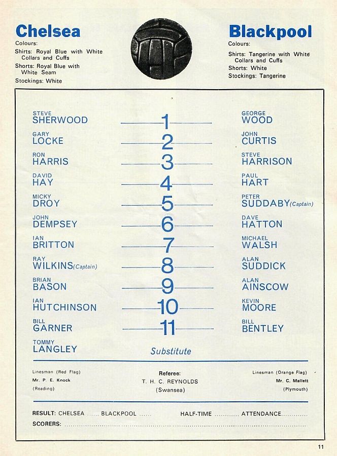 1 Peter Bonetti, 2 Gary Locke (12 Bill Garner 6), 3 Ron Harris, 4 Garry Stanley, 5 Steve Wicks, 6 David Hay, 7 Ian Britton, 8 Ray Wilkins, 9 Steve Finnieston, 10 Ken Swain, 11 Ray Lewington |