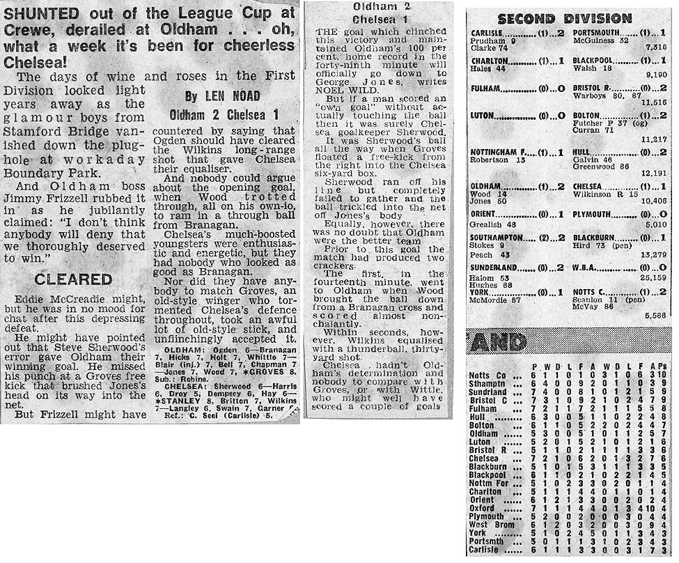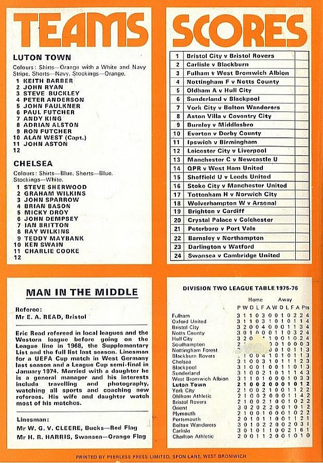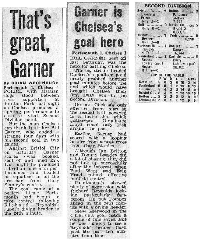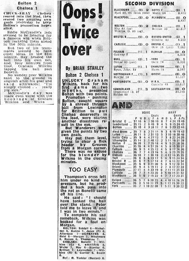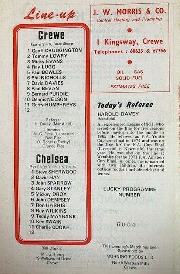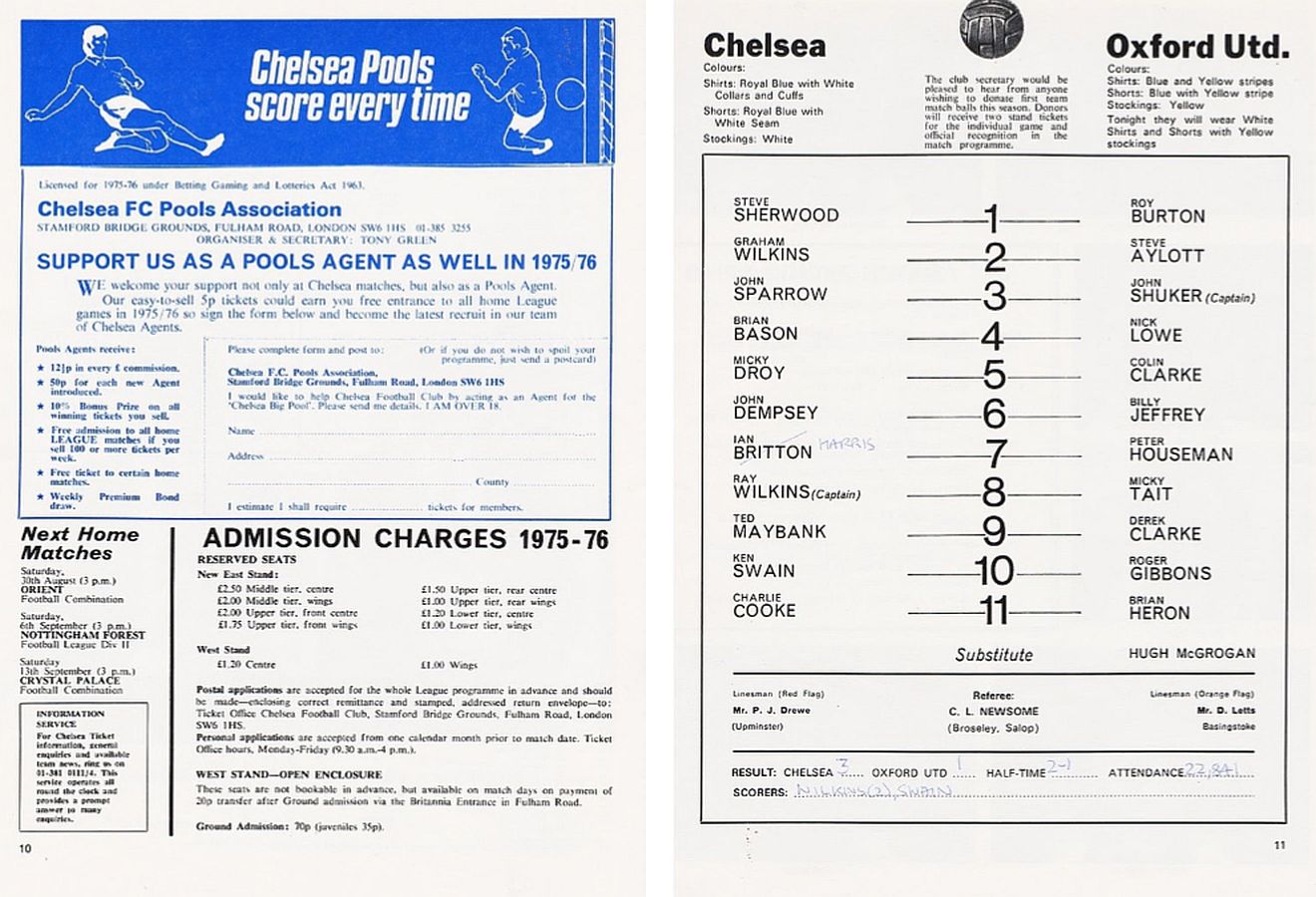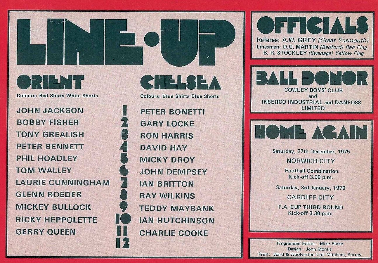 1 Peter Bonetti, 2 Gary Locke (12 Bill Garner 6), 3 Ron Harris, 4 Garry Stanley, 5 Steve Wicks, 6 David Hay, 7 Ian Britton, 8 Ray Wilkins, 9 Steve Finnieston, 10 Ken Swain, 11 Ray Lewington |